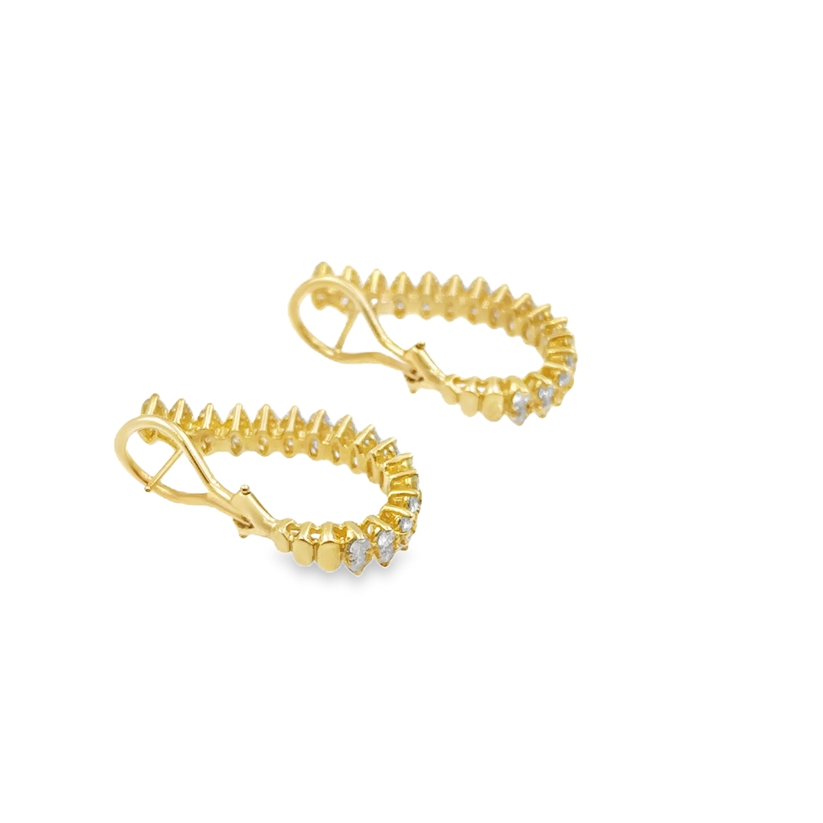 18K gold diamond hoop earrings feature 64 diamonds, collectively weighing 2.25 carats. The total weight of the earrings is 6 pennyweights (9.30 grams).