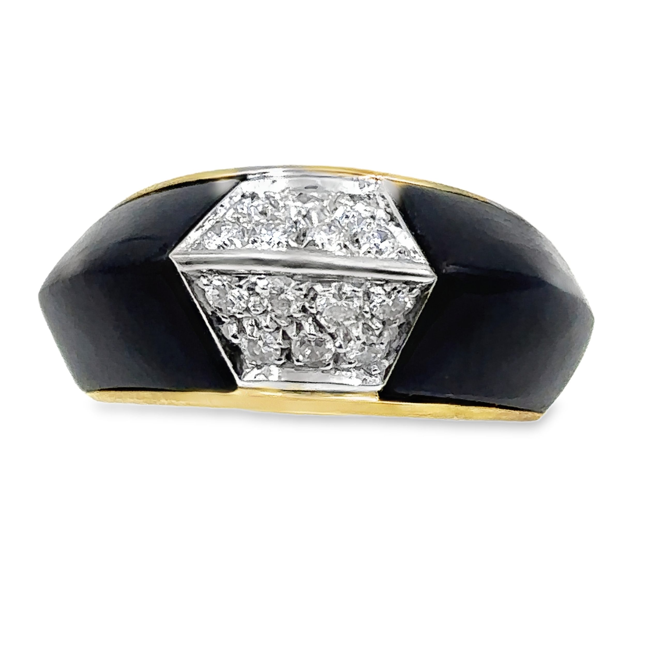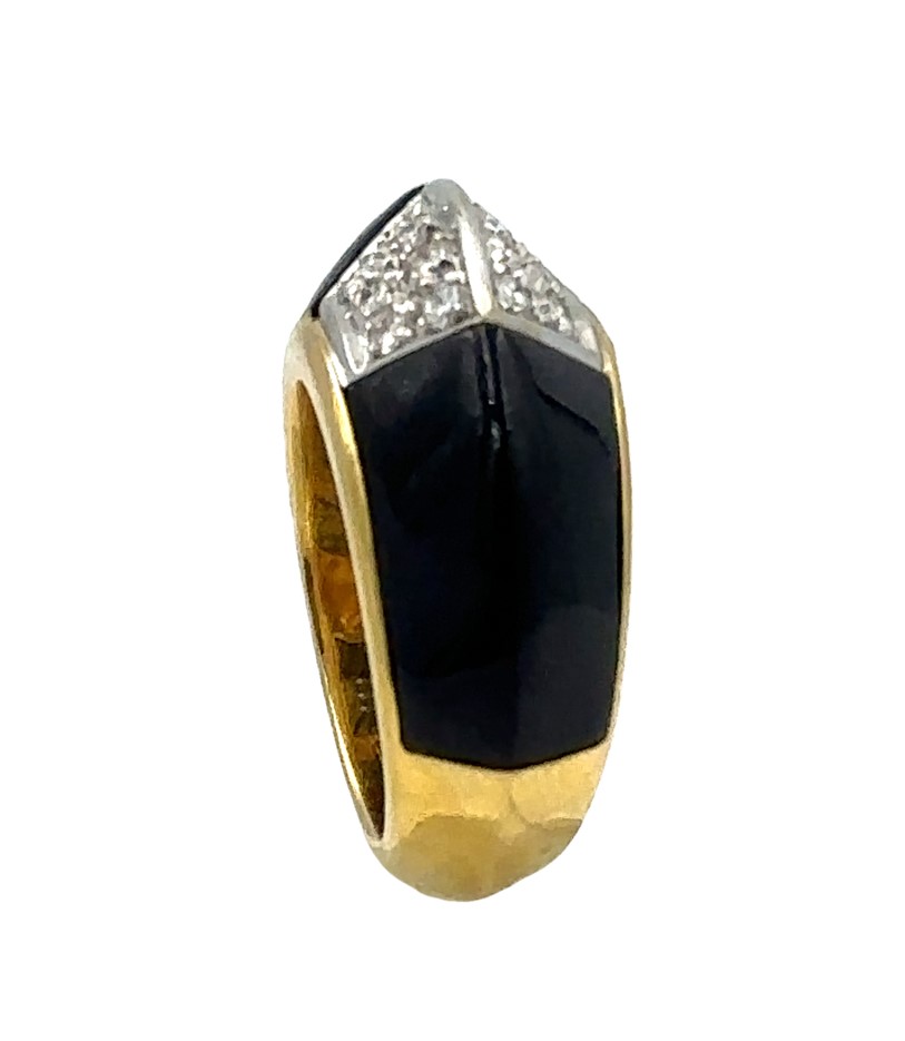 1970's 18K Yellow Gold Diamond and Onyx Ring, chevron design pave set with 14 diamonds weighing .65Cts., 10.60Dwt/16.48Gr., ring size 7 1/4.