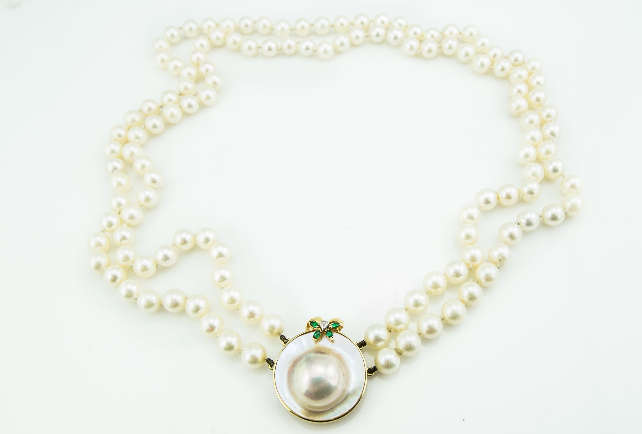 1970's Yellow Gold Clasp Double Strand Pearl Necklace; 18K yellow gold; 49.3dwt/76.67g; Diamond 0.03cts, 4 Emeralds 0.20cts; 123 Pearls 7.0 - 7.4mm; 21" Double strand