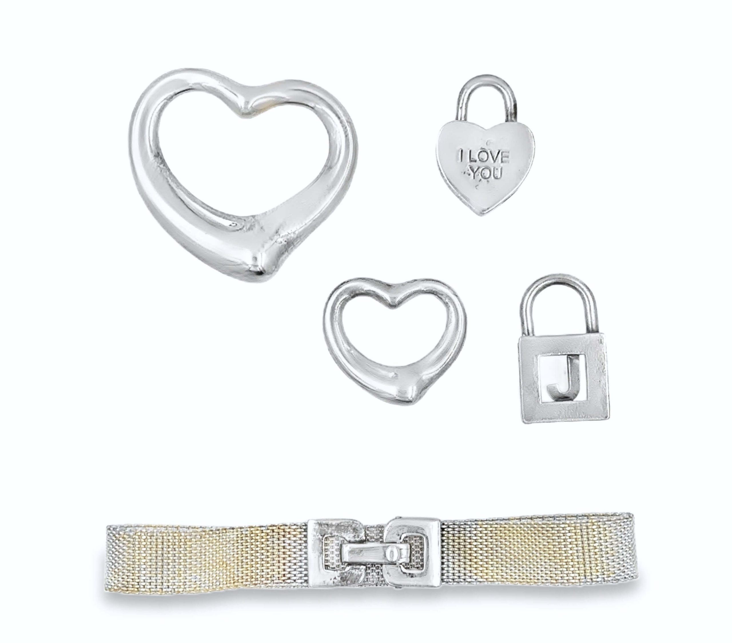 A five-piece collection of Tiffany & Co. silver, featuring four pendants (two hearts by Paloma Picasso and two stylized locks), accompanied by a silver mesh bracelet measuring 7 1/4 inches in length and weighing 52.3 grams.