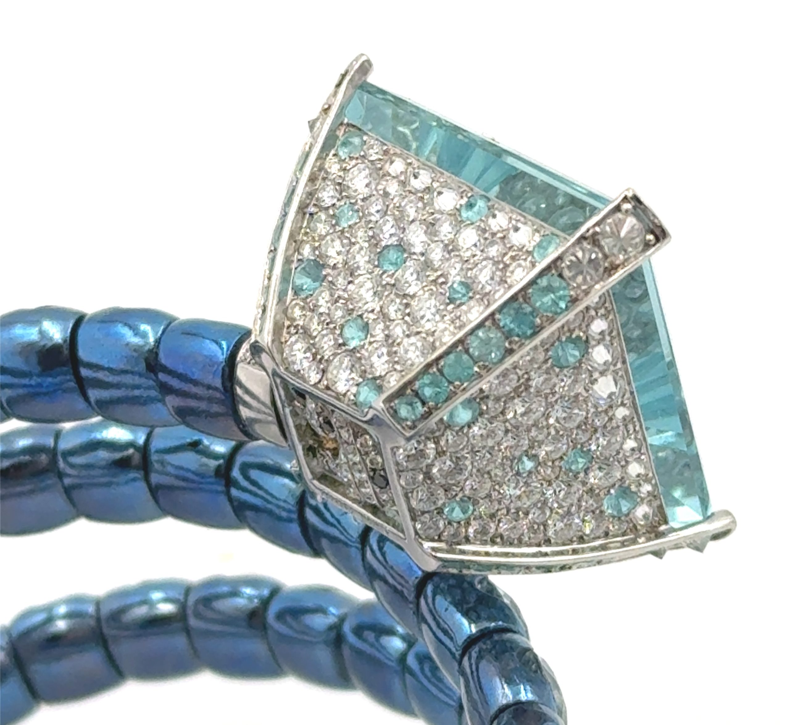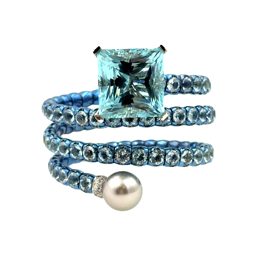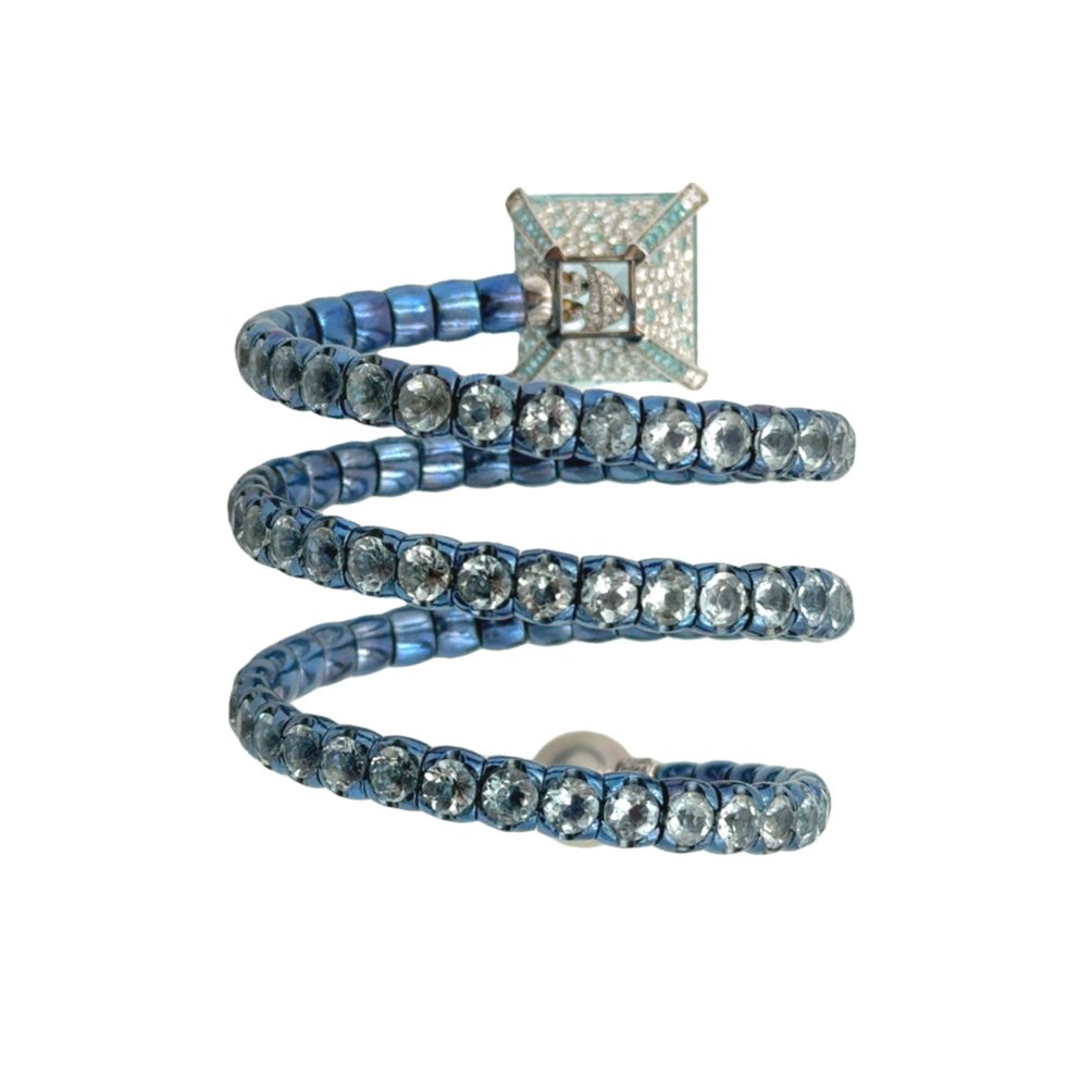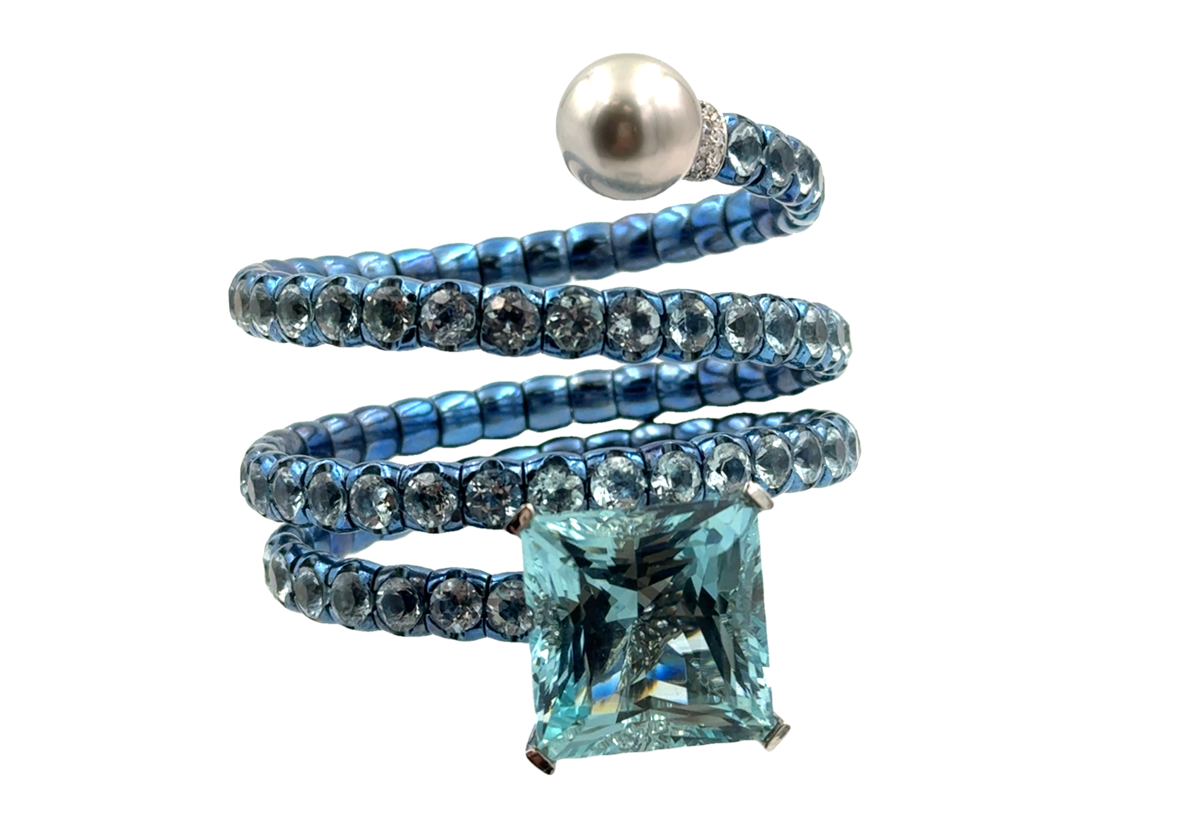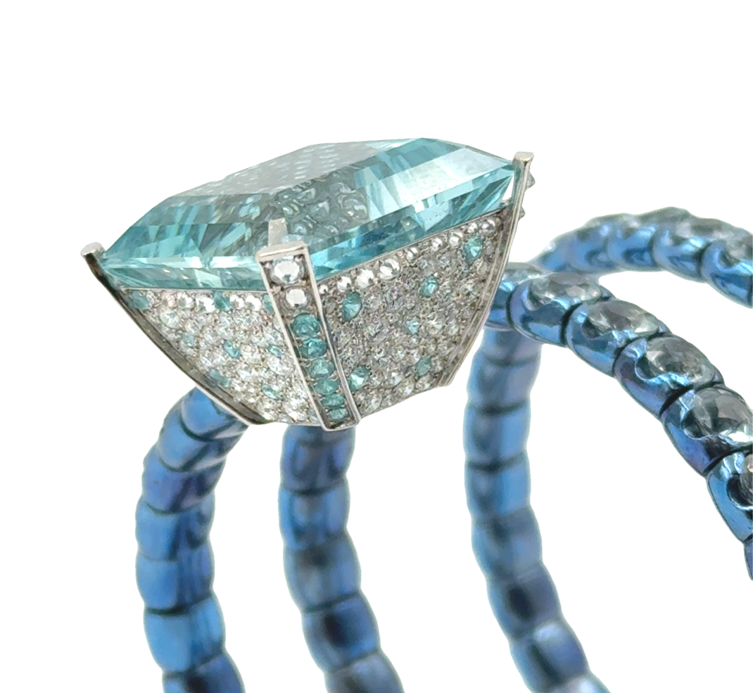 The Unique Ocean Blue Anodized Titanium Aquamarine Spiral Cuff by Alessio Boschi features 92 round-cut aquamarine links totaling 45 carats. It is topped with an 18K white gold basket, meticulously micro-pavé set with 180 diamonds and 62 Paraiba tourmalines weighing 5.32 carats, and centrally set with an ocean blue square-cut aquamarine weighing 28.50 carats. The cuff is further adorned with a grey South Sea pearl measuring 13.30mm, exhibiting exceptional luster and a striking peacock overtone. The total weight of this remarkable piece is 40 dwt (61.80 grams).Retail 127,000.
