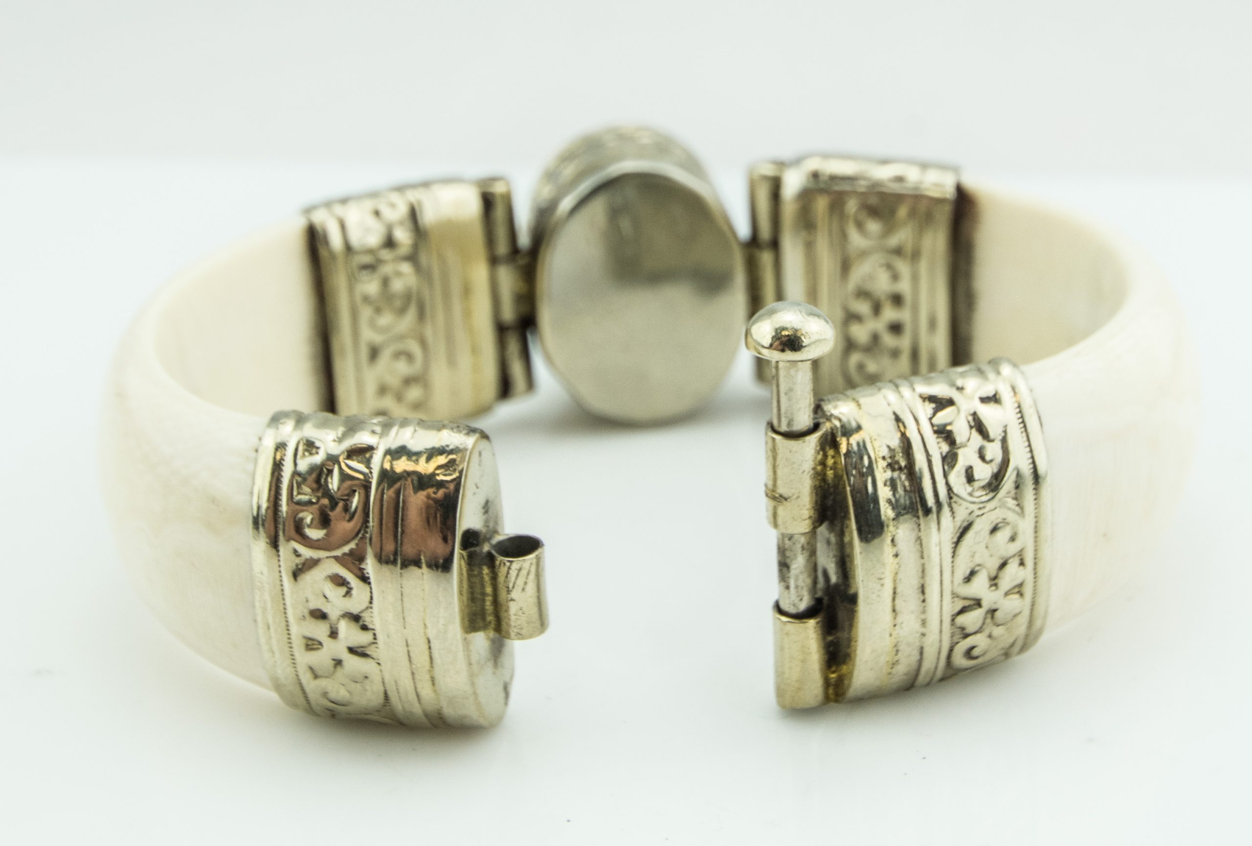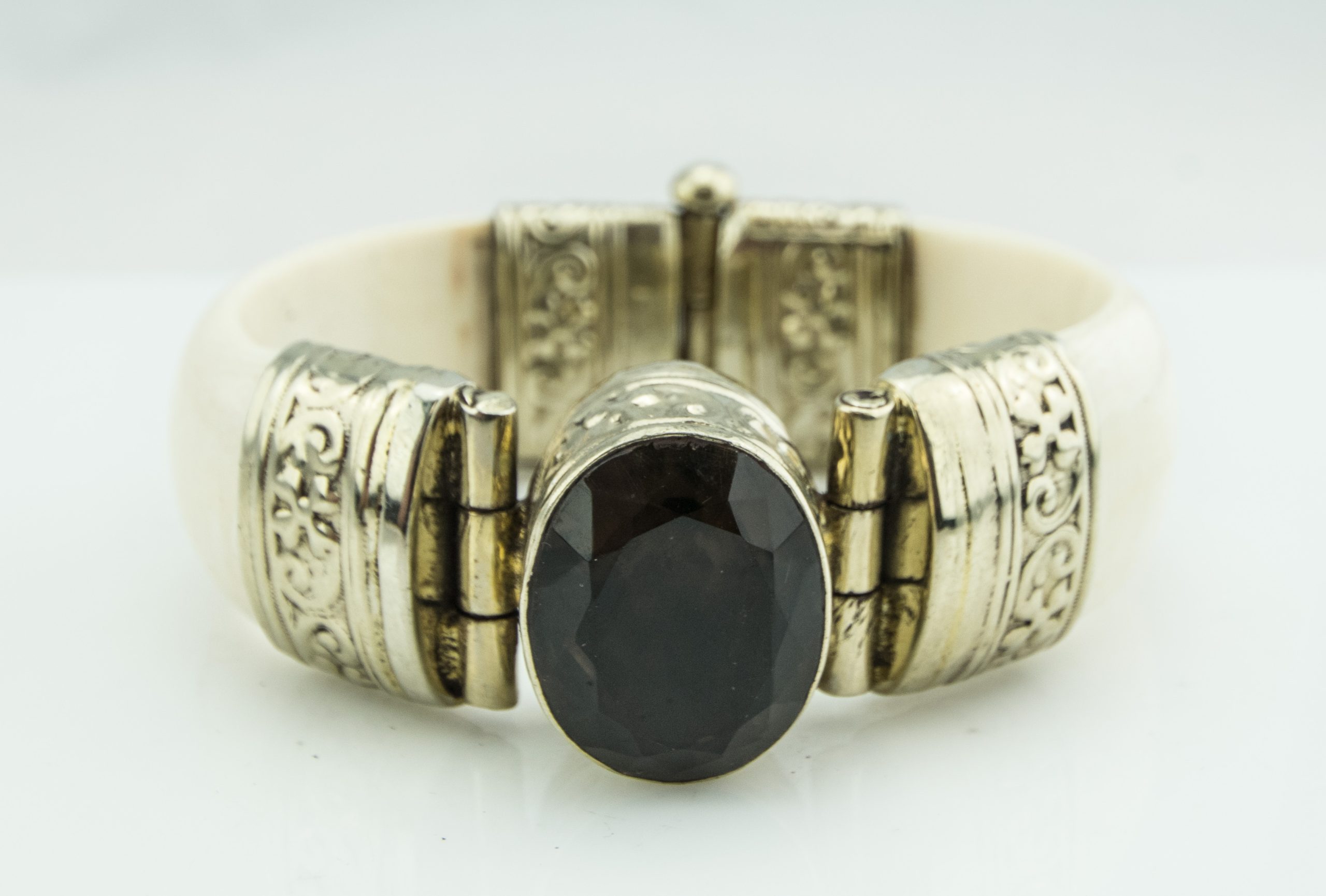 Bedouin White Bangle Bracelet with Brown Stone Center and Silver Tone Trim; 51.50dwt; 7 3/4