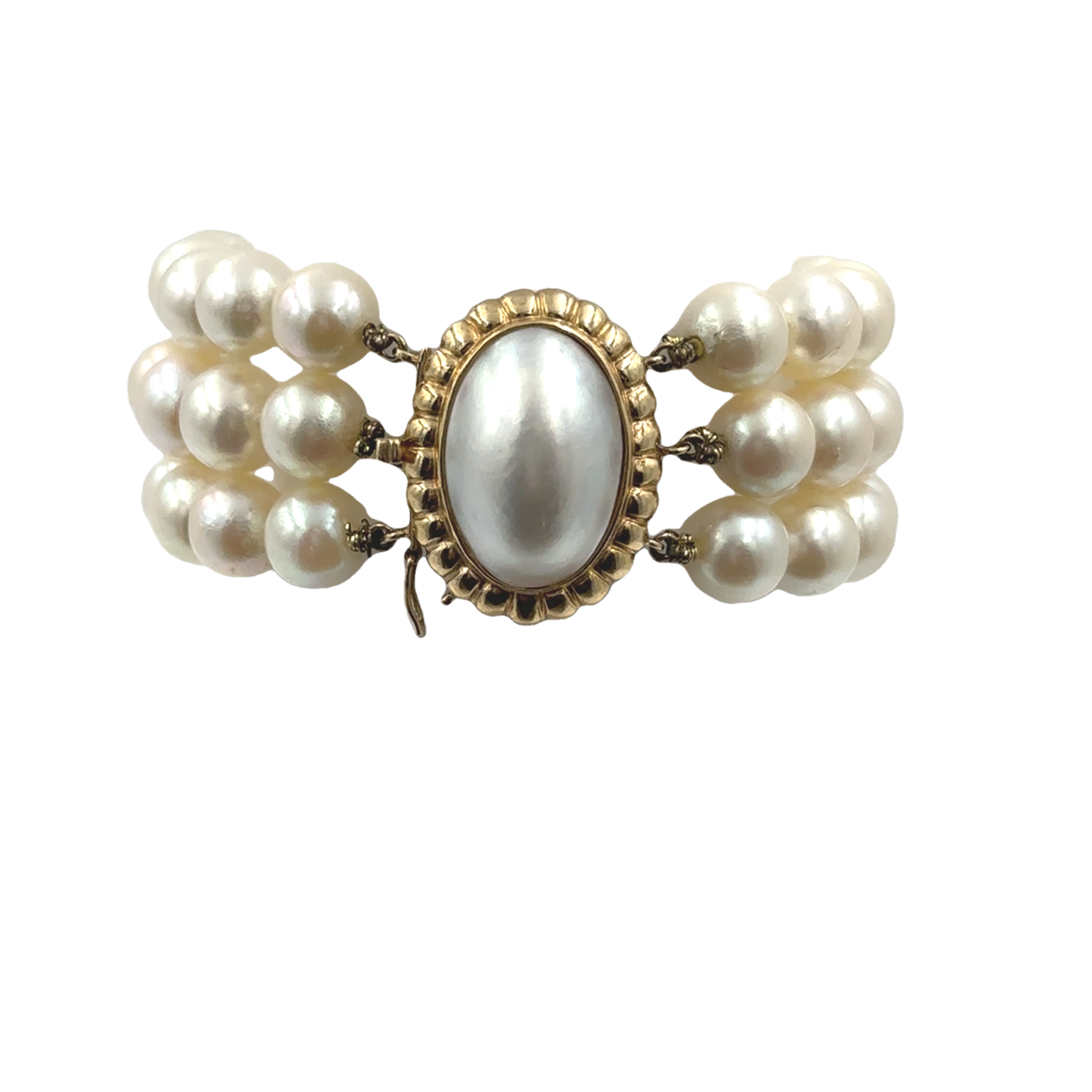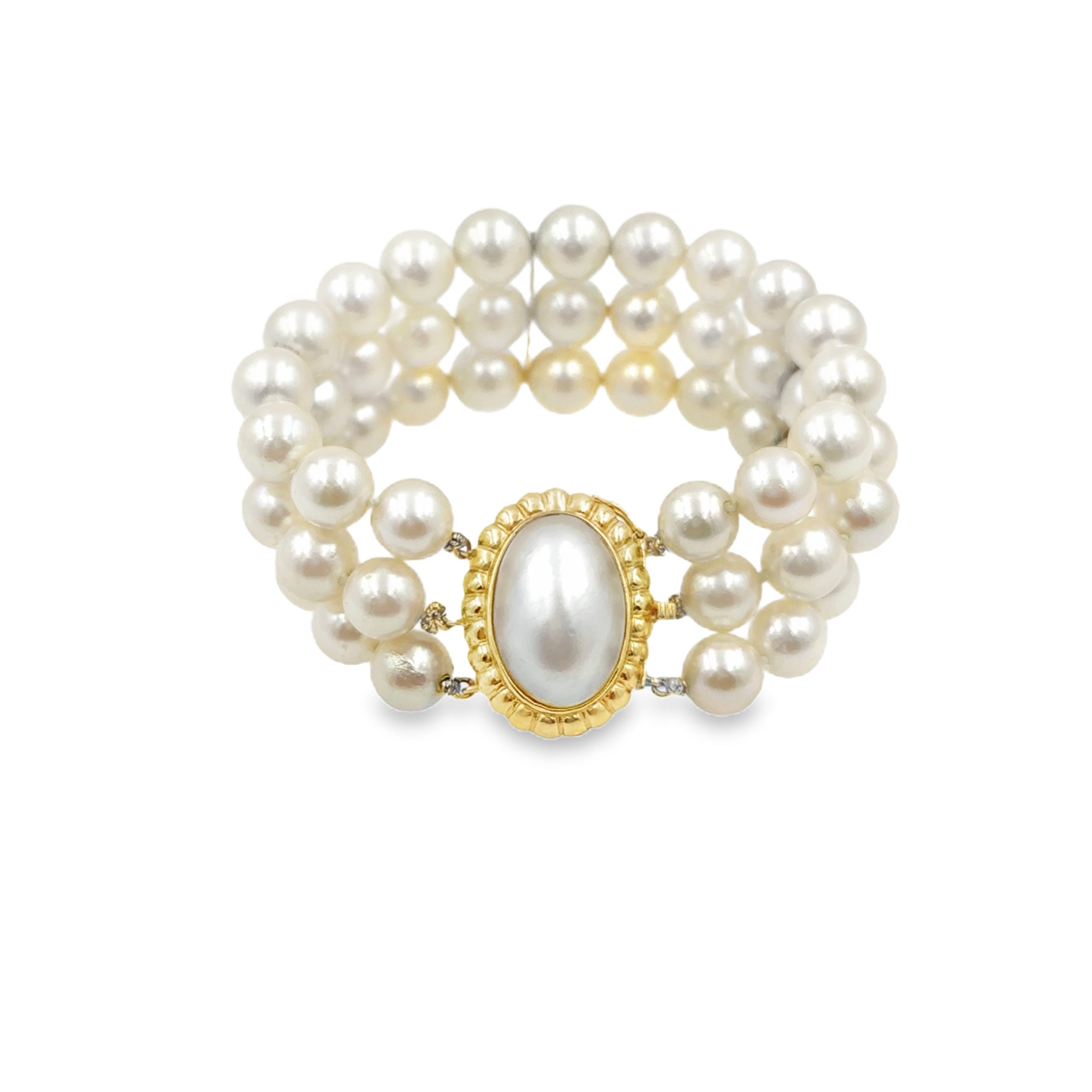 Vintage Triple Strand Cultured Pearl Bracelet strung with 51 pearls measuring 8.40mm, 14K yellow gold oval clasp bezel set with a 13 X 19mm Mabe pearl, 6 3/4 inches in length.