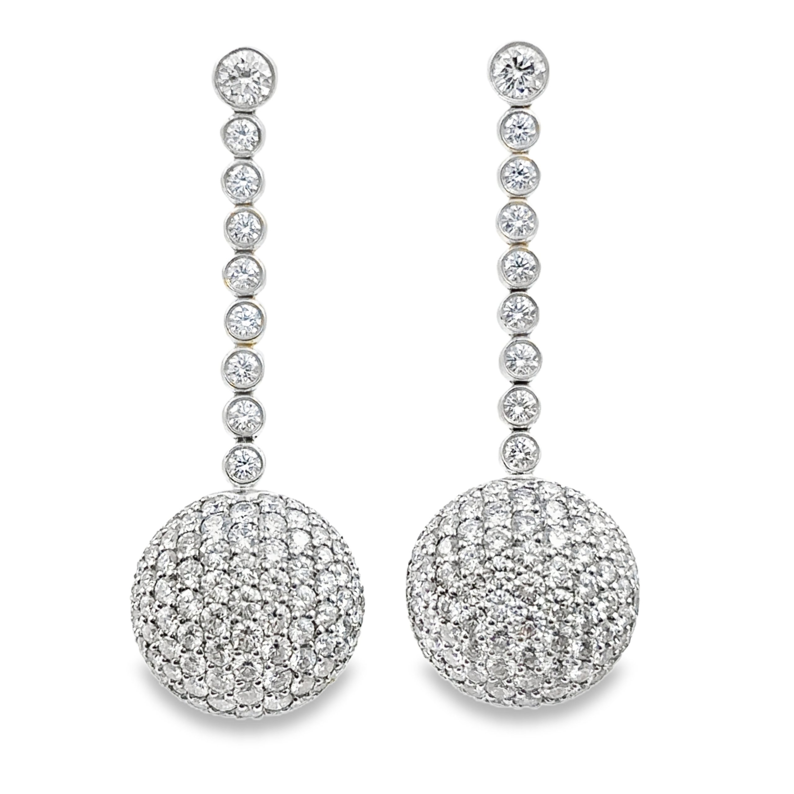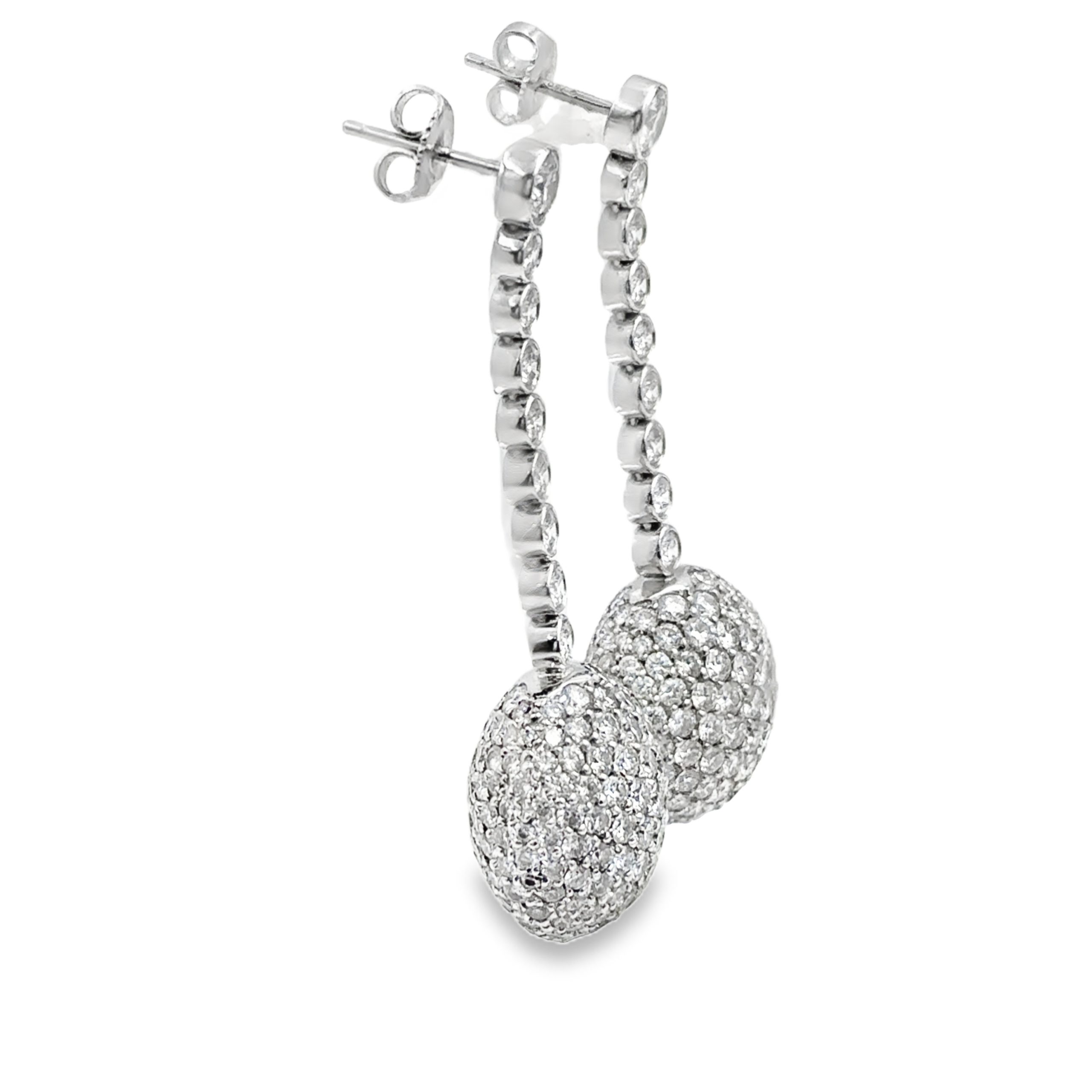 18K white gold diamond ear pendants featuring graduating diamond posts that gracefully suspend pavé-set biconvex drops with chamfered edges. These stunning earrings are adorned with 386 meticulously set diamonds, totaling 15.00cts, and weigh 8.20Dwt (12.80Gr)