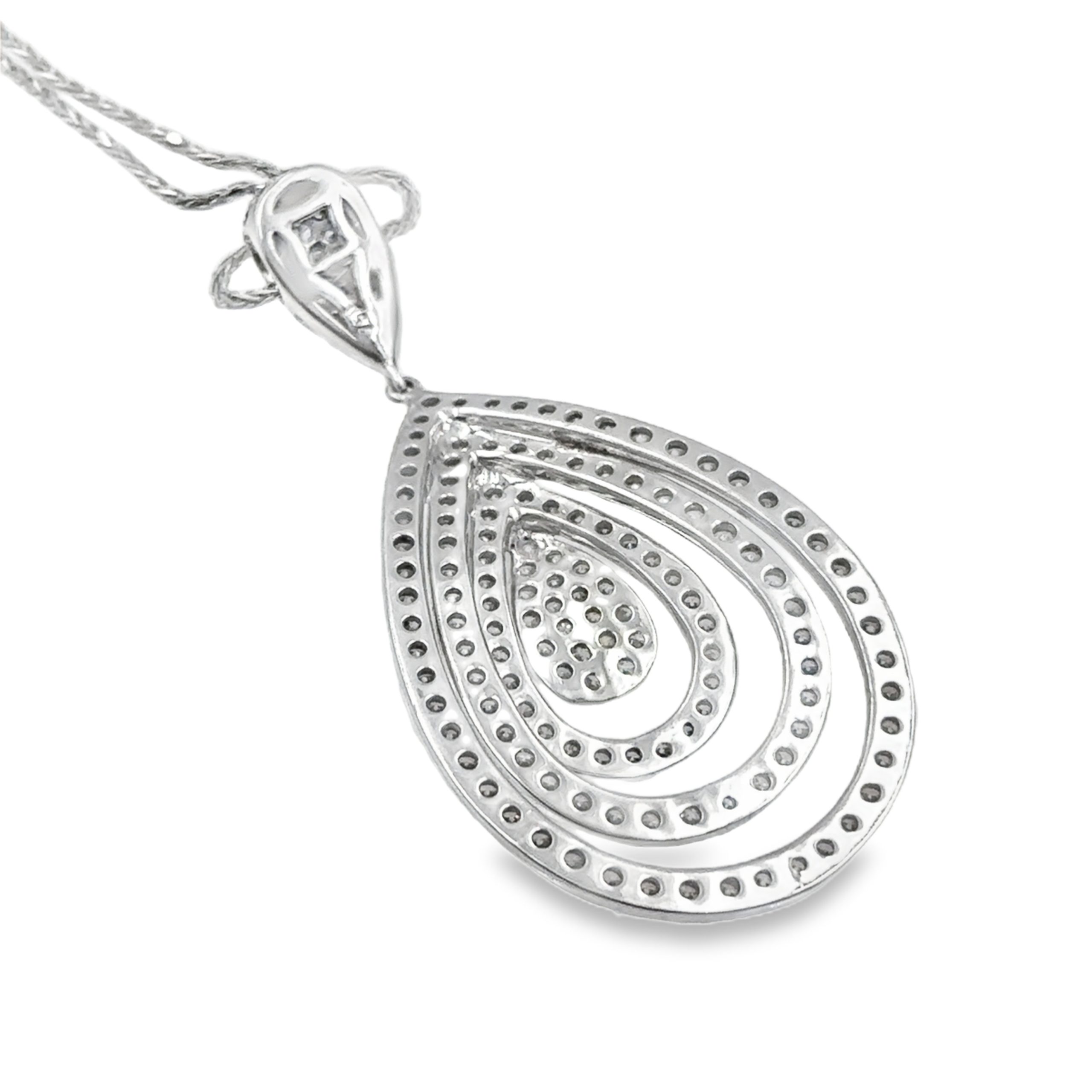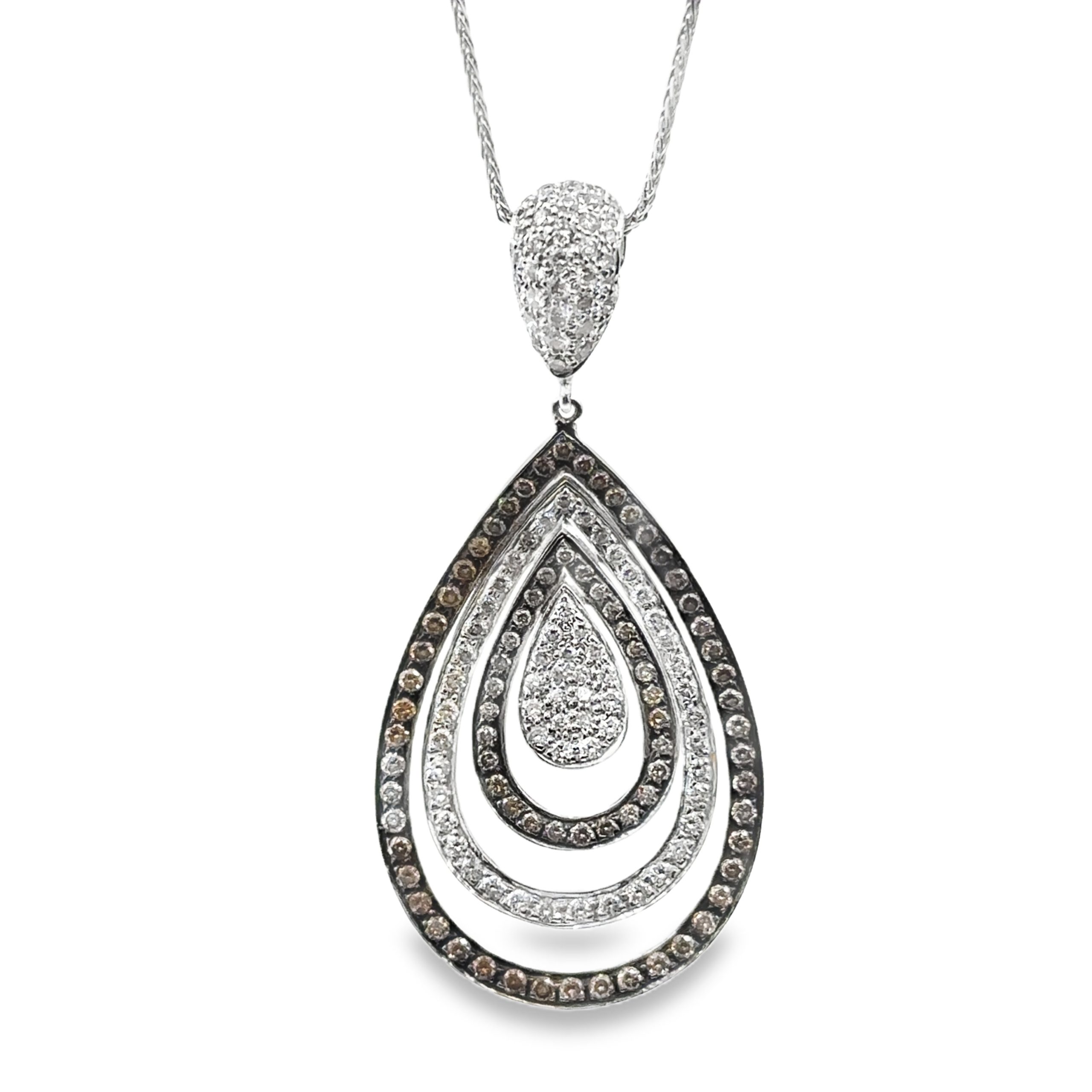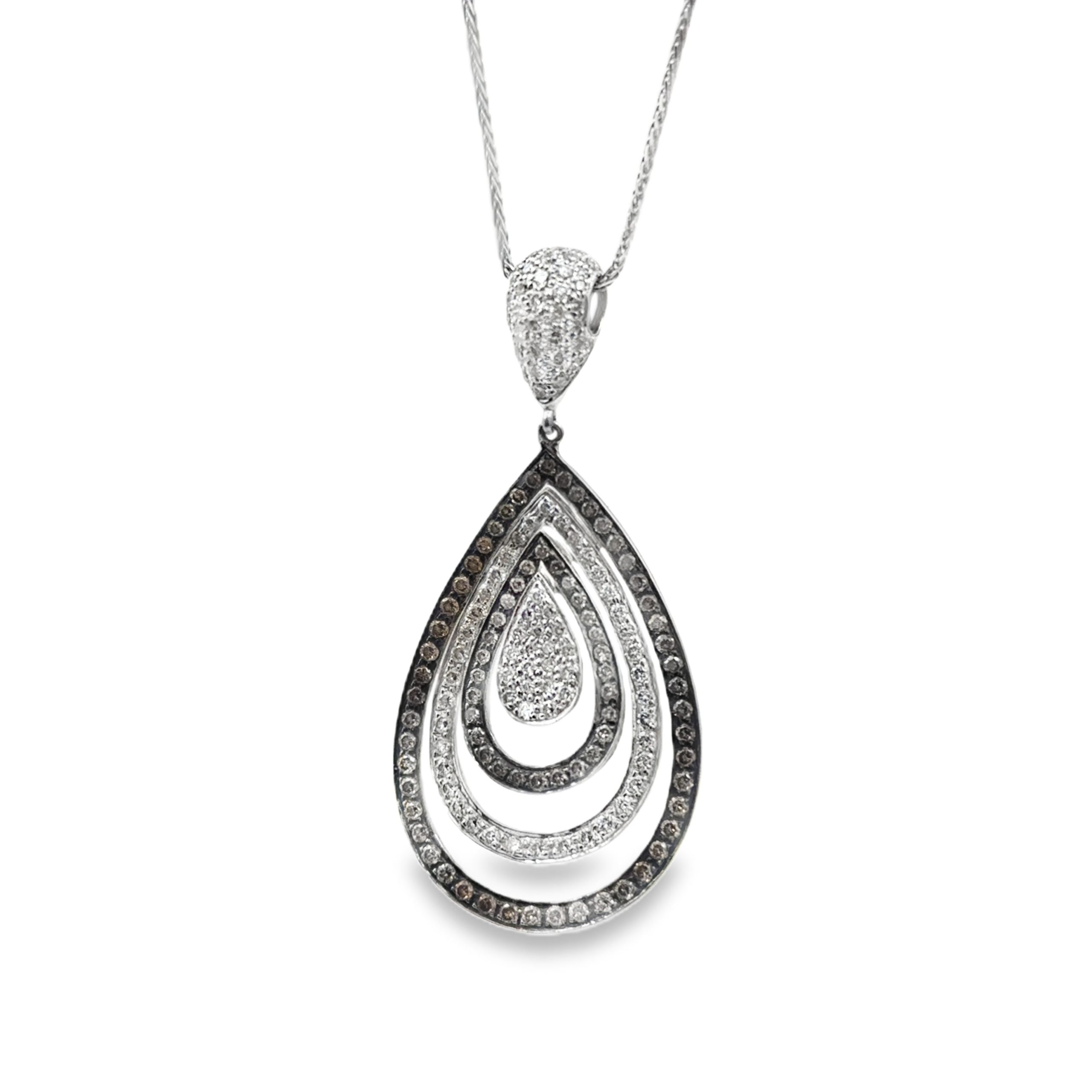 An elegant 18K white gold tear drop pendant featuring an open-frame nesting design, accented with 178 cognac colored and colorless diamonds totaling 2.00 carats. It is suspended from a 14K white gold chain that measures 16 inches in length and weighs 6.40 Dwt (10.00 grams) combined.