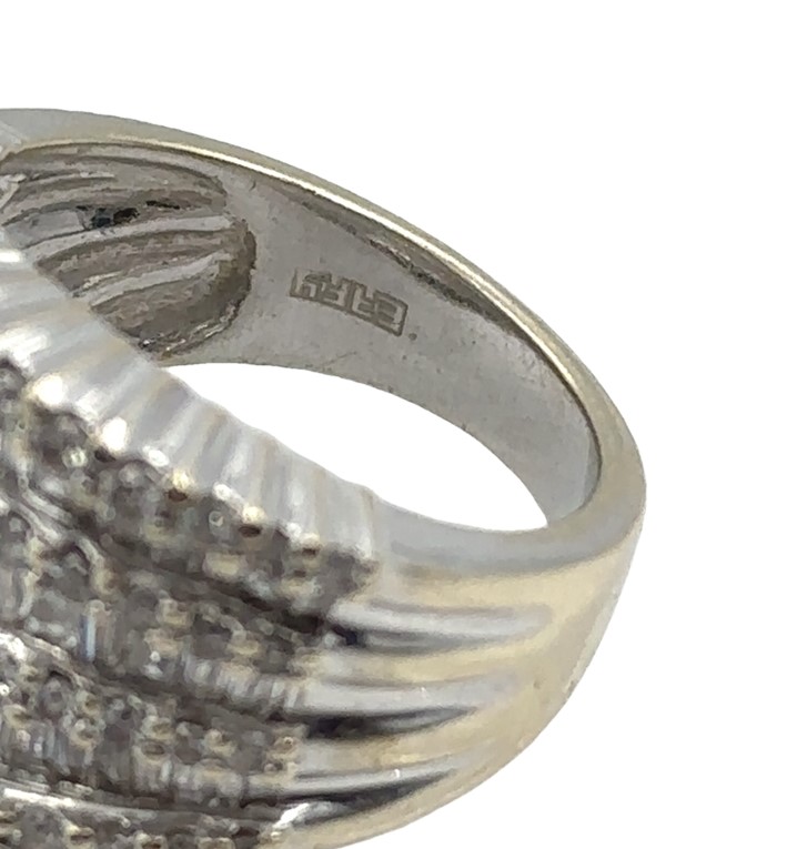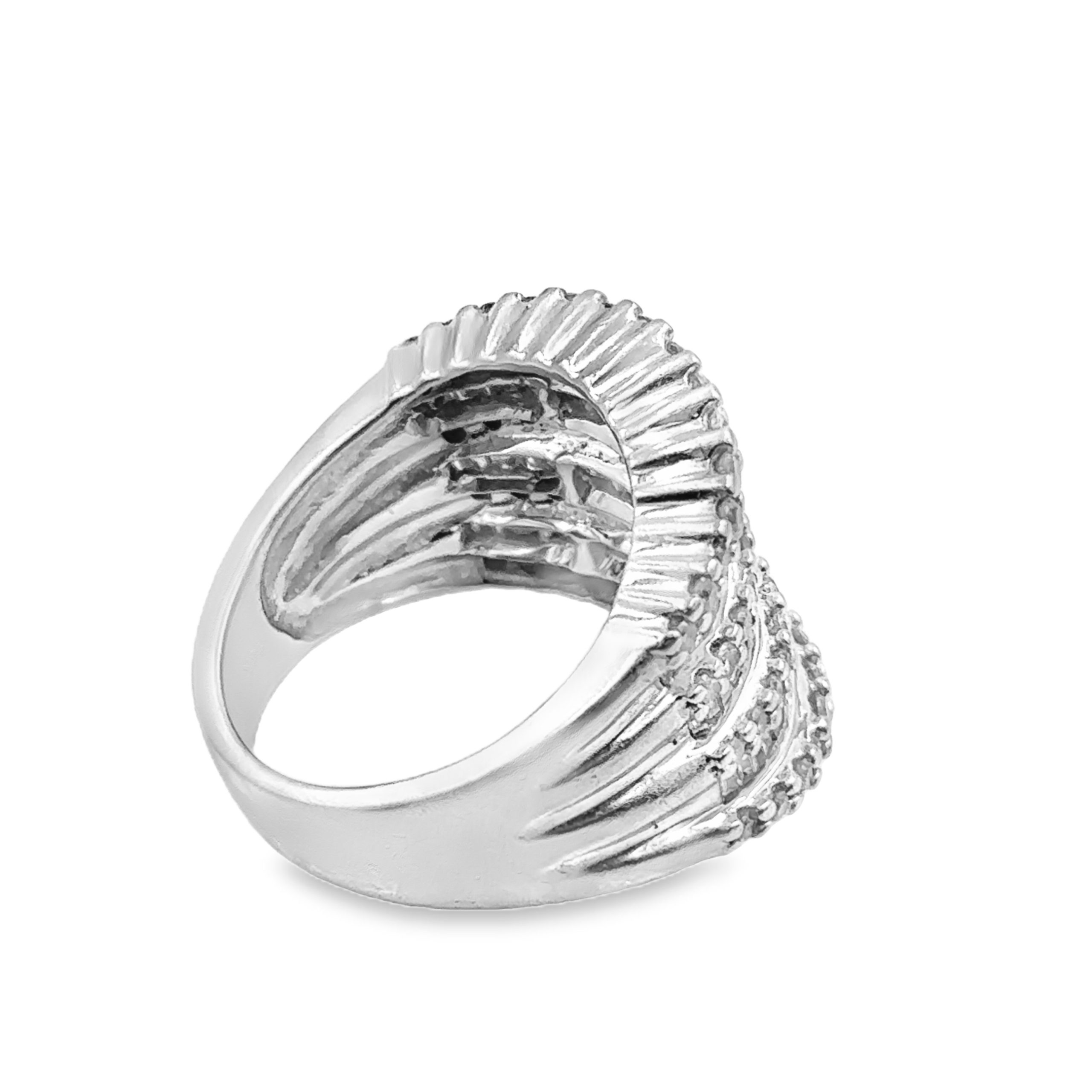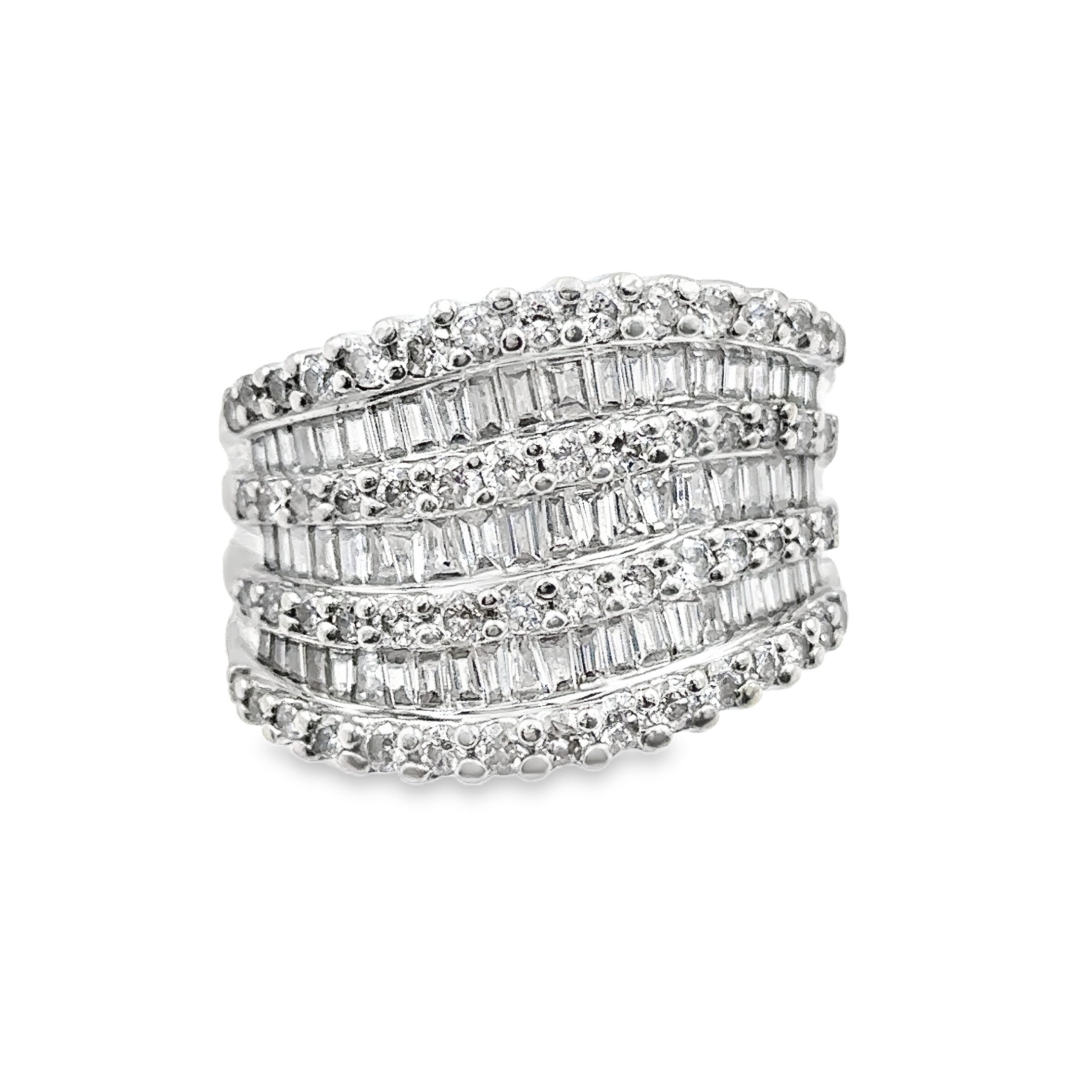 14K White Gold Diamond Wave Band by Effy, showcasing an alternating design of 57 round and 62 baguette cut diamonds with a total weight of 3.28cts. The band weighs 10.80 grams (7.00 dwt) and is a size 7 1/4.