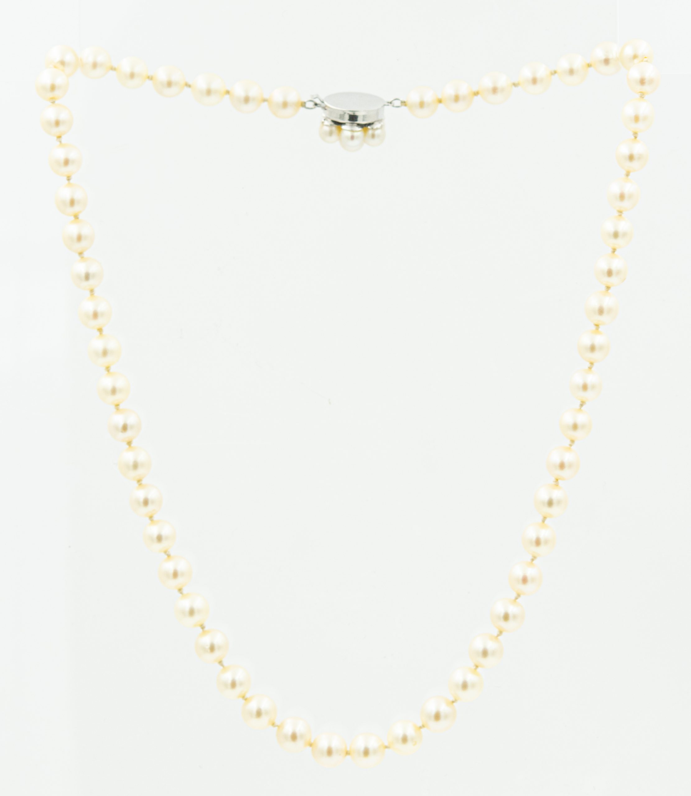 Estate 1950's Cultured Pearls Necklace. The necklace features a single strand design that is strung with 61 pearls measuring 6.30mm in width. The necklace terminates with a 14k white gold clasp and it measures 16 1/4".