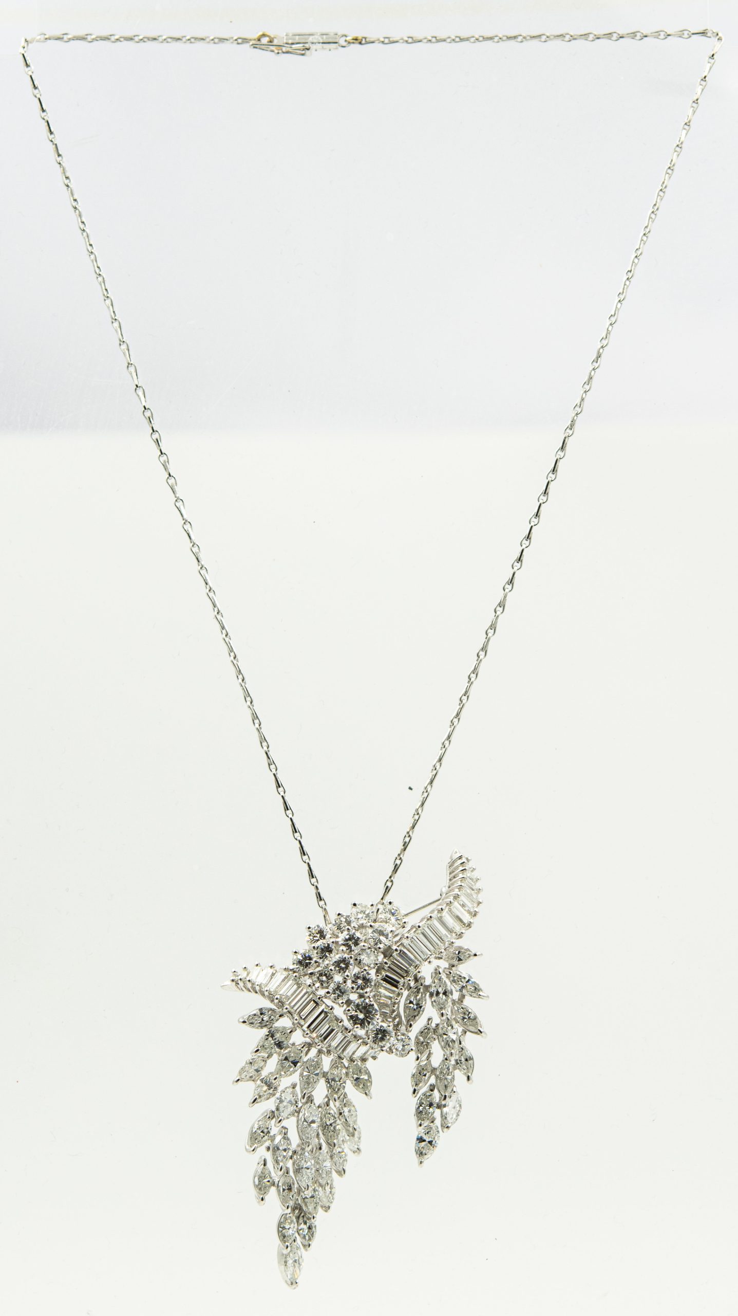Estate Platinum and Diamond Brooch/Pendant; platinum; 23.20dwt/36.10g; 38 marquise, 33 baguette and 15 round brilliant cut diamonds 22.50cts