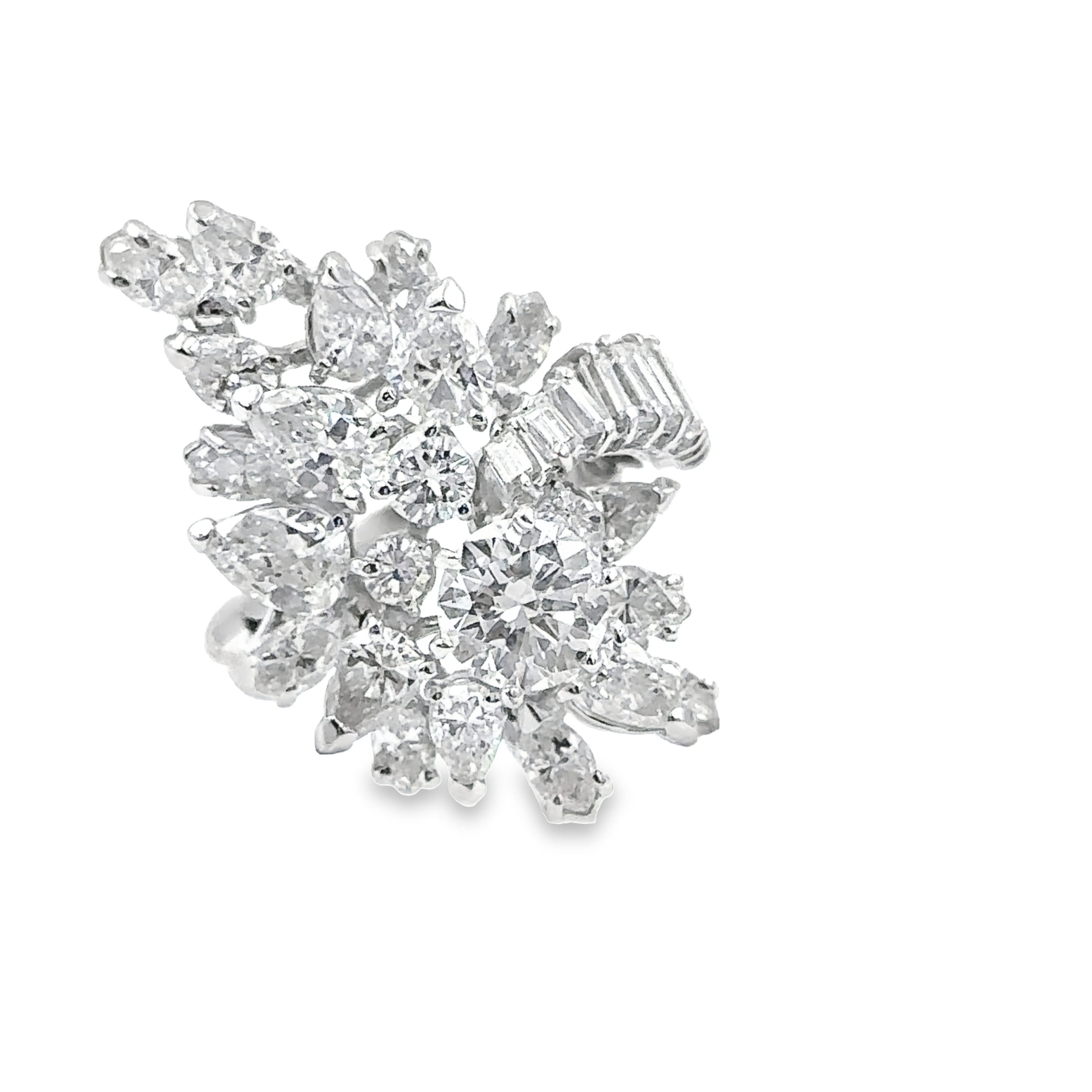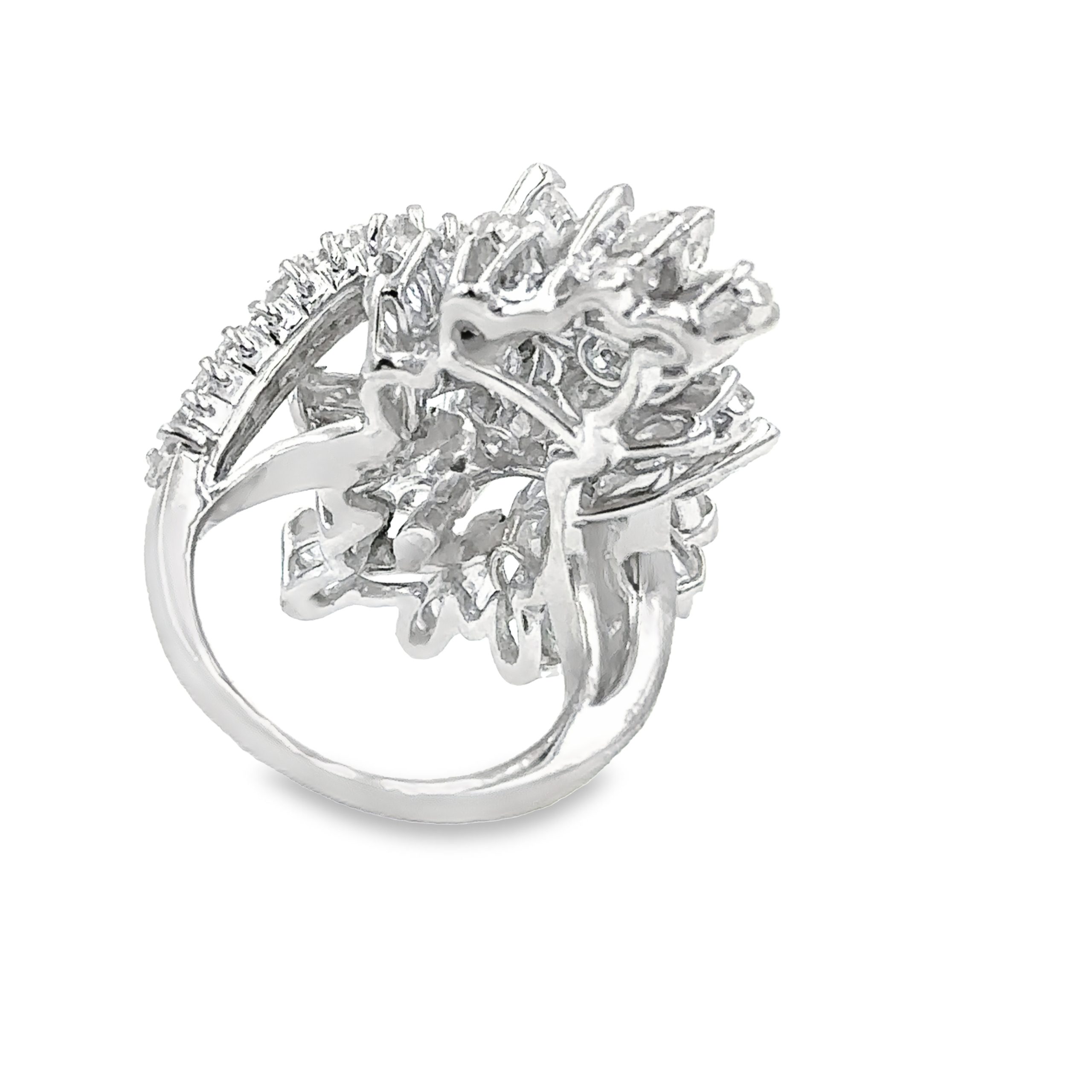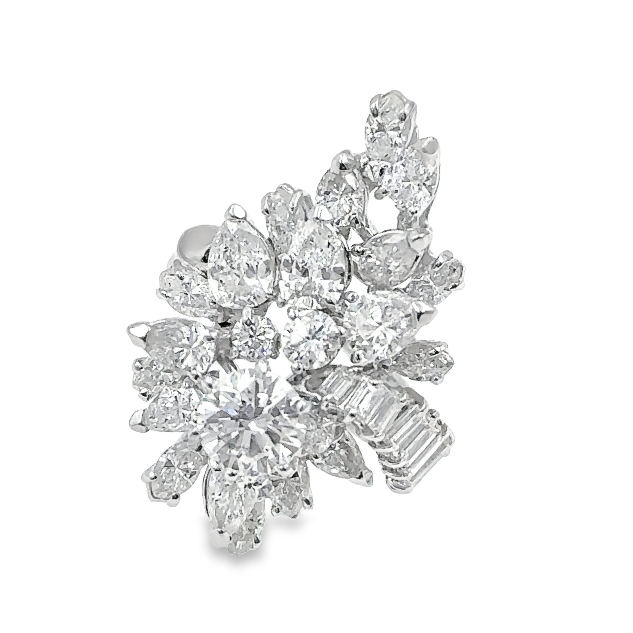Estate 1950's Platinum and Diamond Cluster Ring; platinum; 9.10dwt/14.10g; cascading design centrally set with a round brilliant cut diamond weighing 0.96cts; framed with 32 marquise, pear and baguette cut diamonds weighing 7.00cts; Ring Size 5
