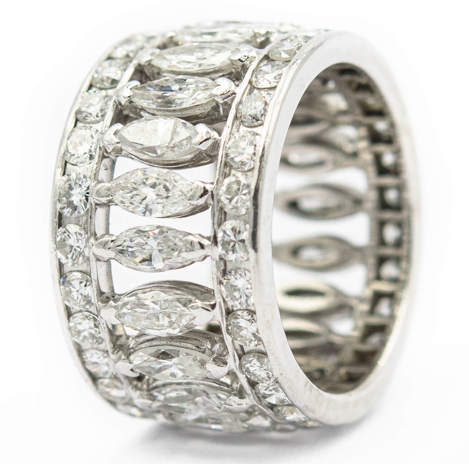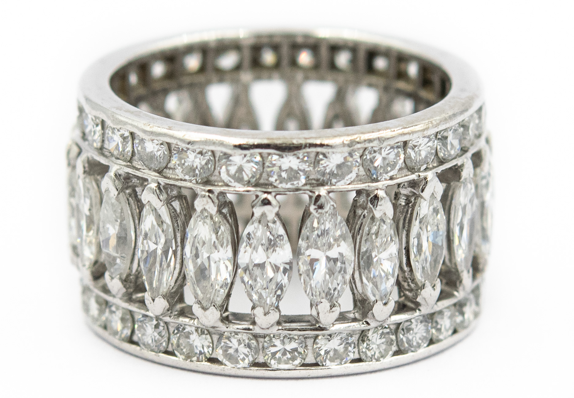 Estate 1950's Platinum and Diamond Eternity Ring; platinum; 7.60dwt/12.0g; 22 marquise and 44 round brilliant cut diamonds weighing 6.00cts; Ring Size 6