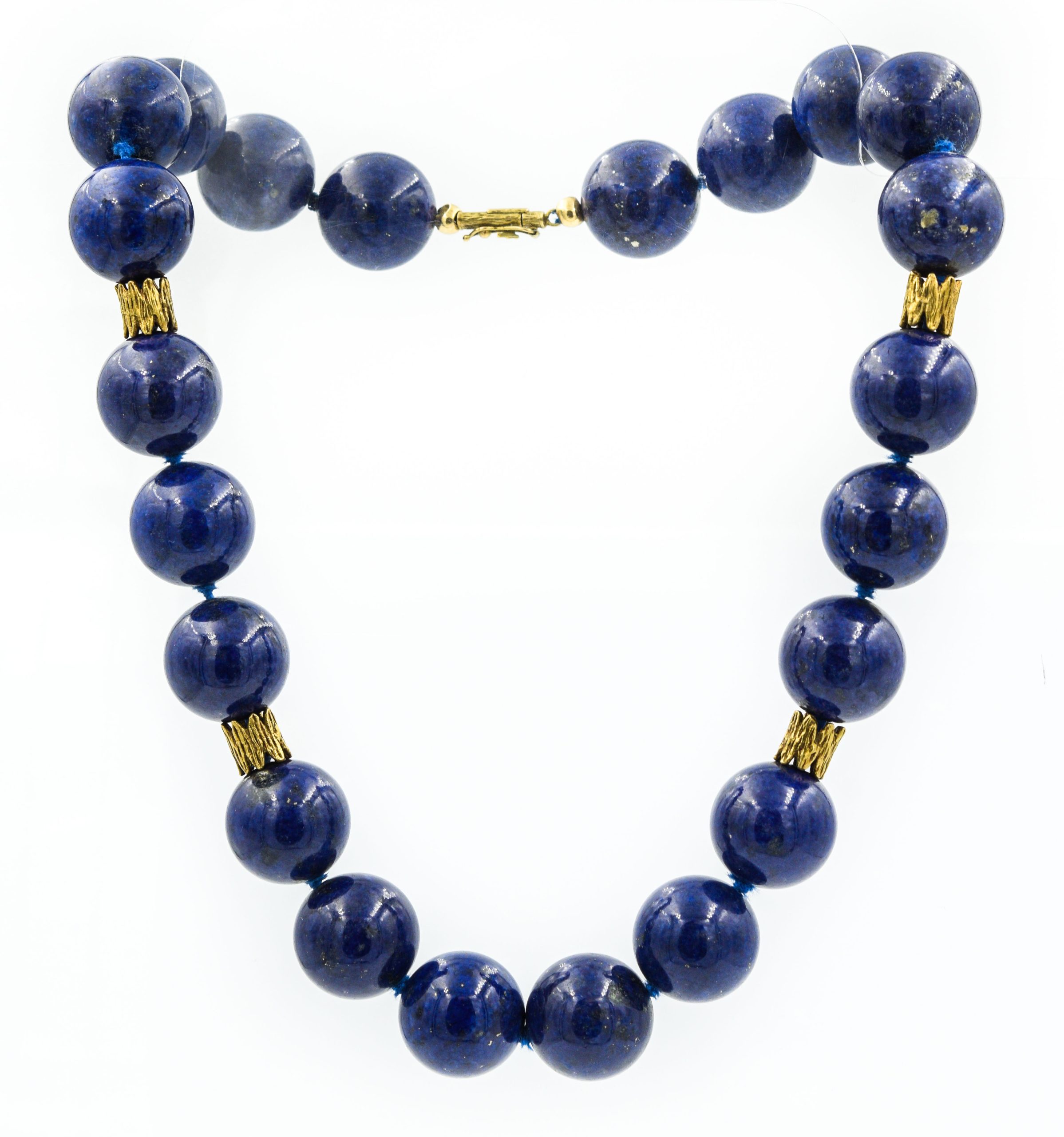 Estate 1970's Yellow Gold and Sodalite Bead Necklace; 14k yellow gold clasp and spacers; 140.2dwt/217.70g; 22 round sodalite beads 18.2mm-18.5mm; 4 - 14k yellow gold spacers; 18"