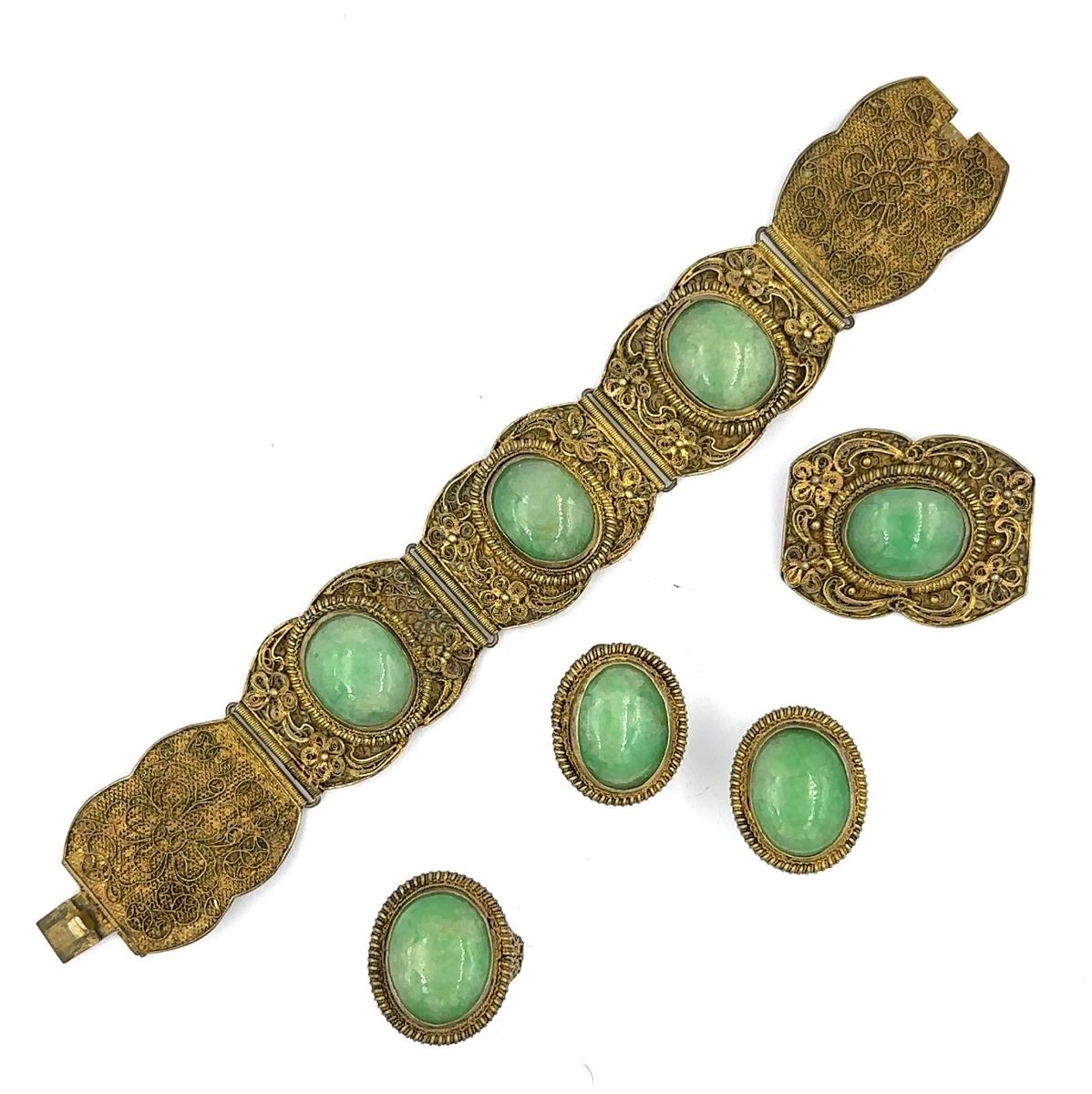 Estate Antique Chinese Import Silver and Jade Bracelet Earrings Brooch and Ring Suite