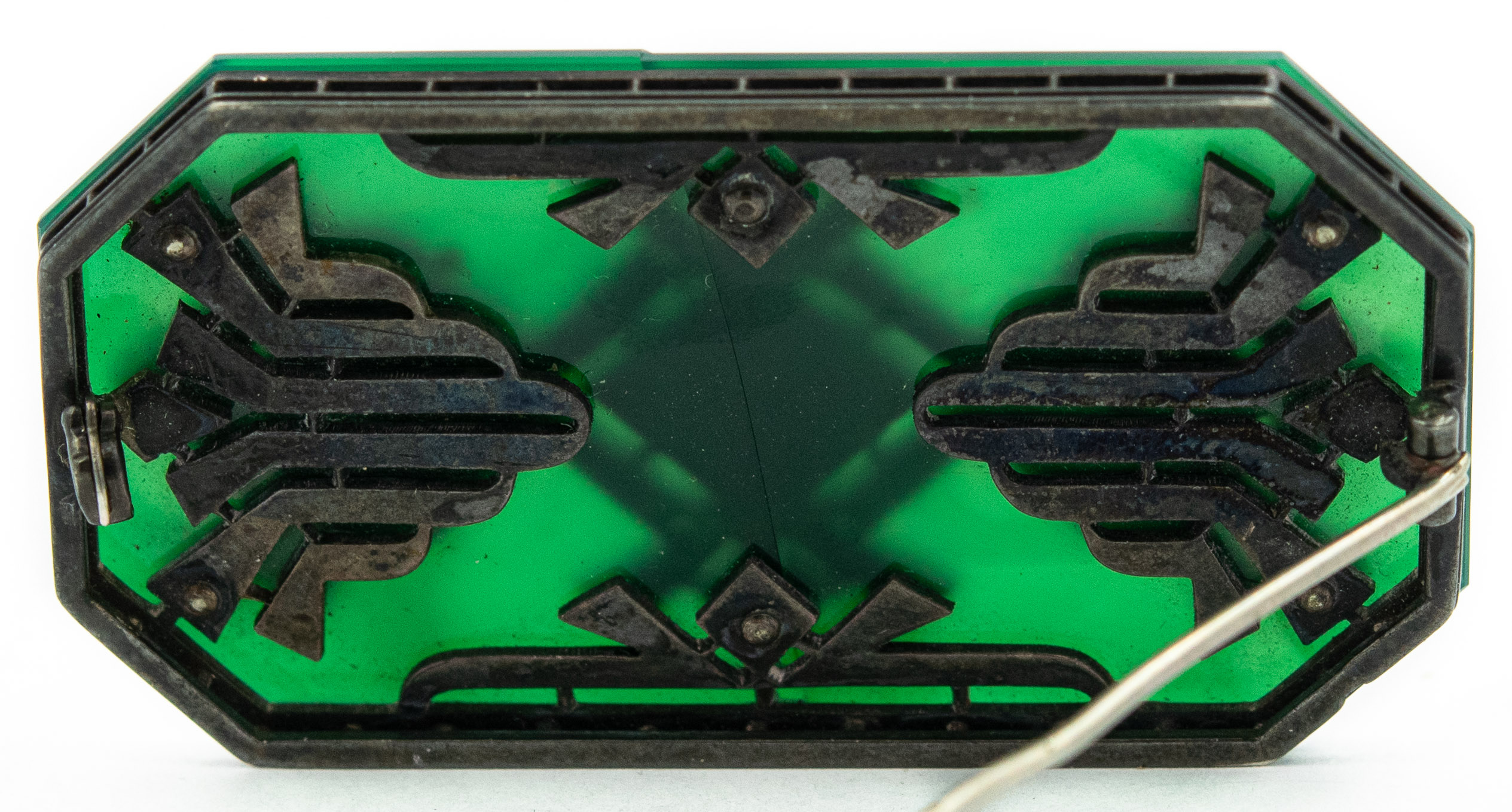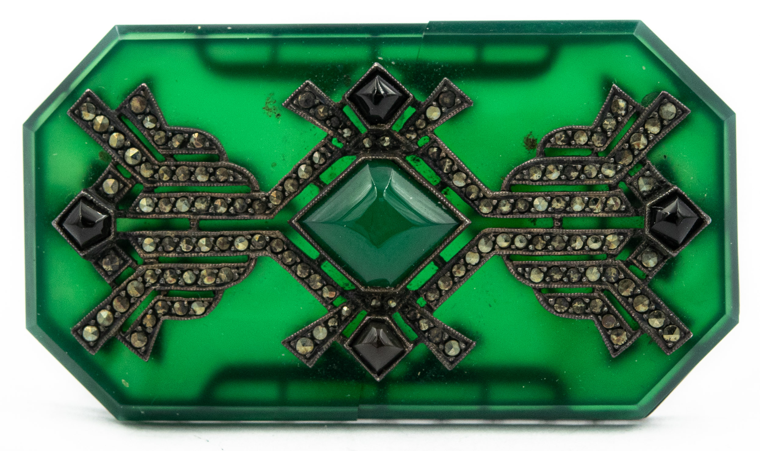 Estate Art Deco Green Onyx and Marcasite Silver Brooch; sterling silver; 2 1/2"