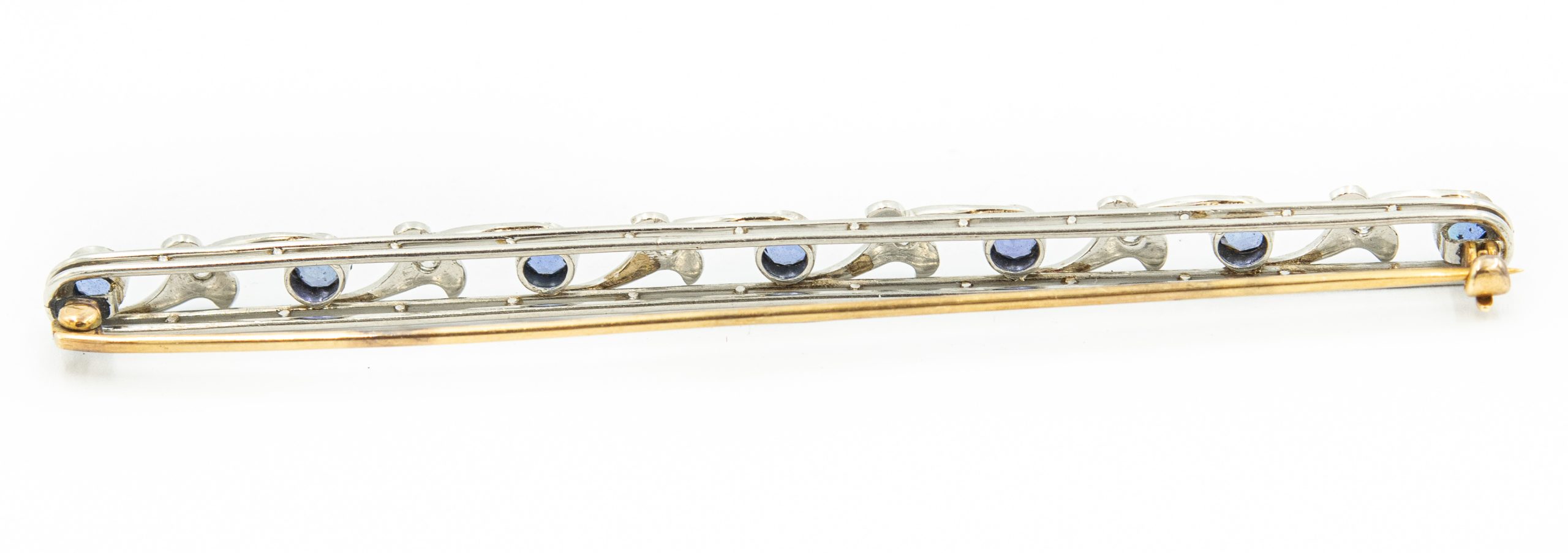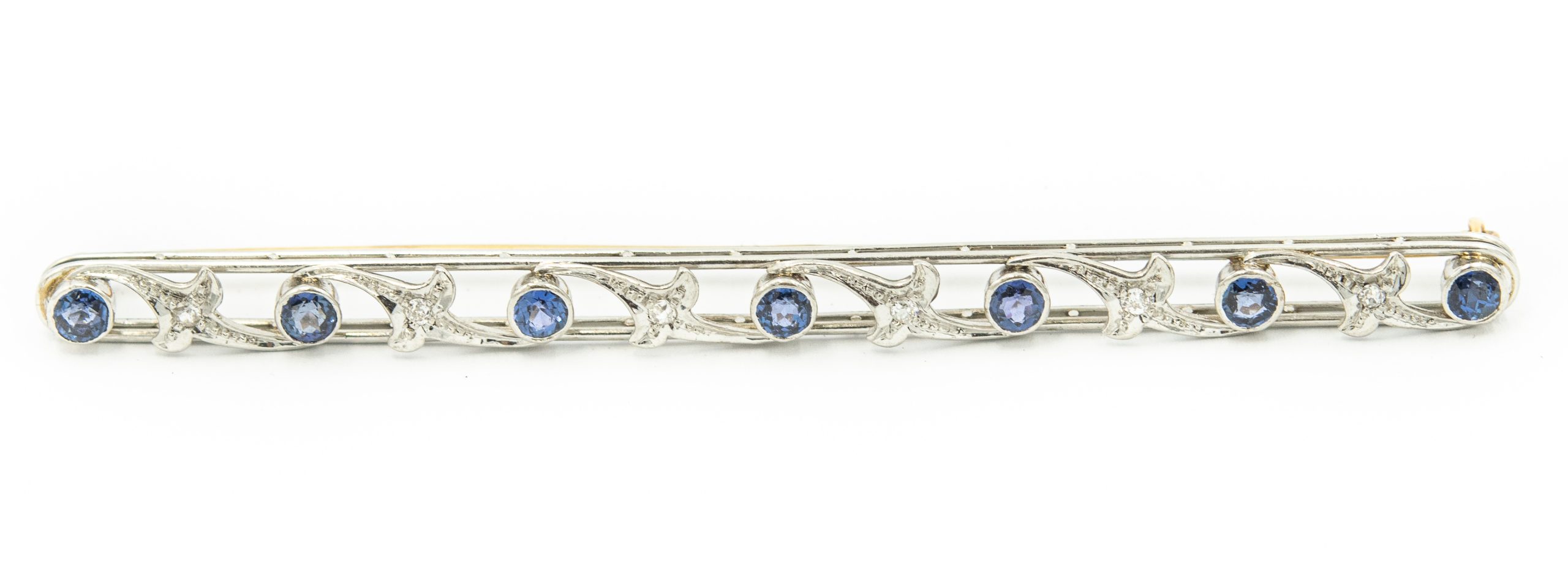 Estate Art Deco Platinum Diamond and Sapphire Bar Brooch. The brooch features an open frame rectangular brooch that measures 3 3/4" in length. It is centrally set with 7 round faceted sapphires weighing approximately 1.50cts combined. It is also flanked with 6 rose cut diamonds weighing approximately . 0.15cts combined. The stones are set in a handmade platinum and 14K yellow gold mounting that weighs 6.40dwt/10.0g.