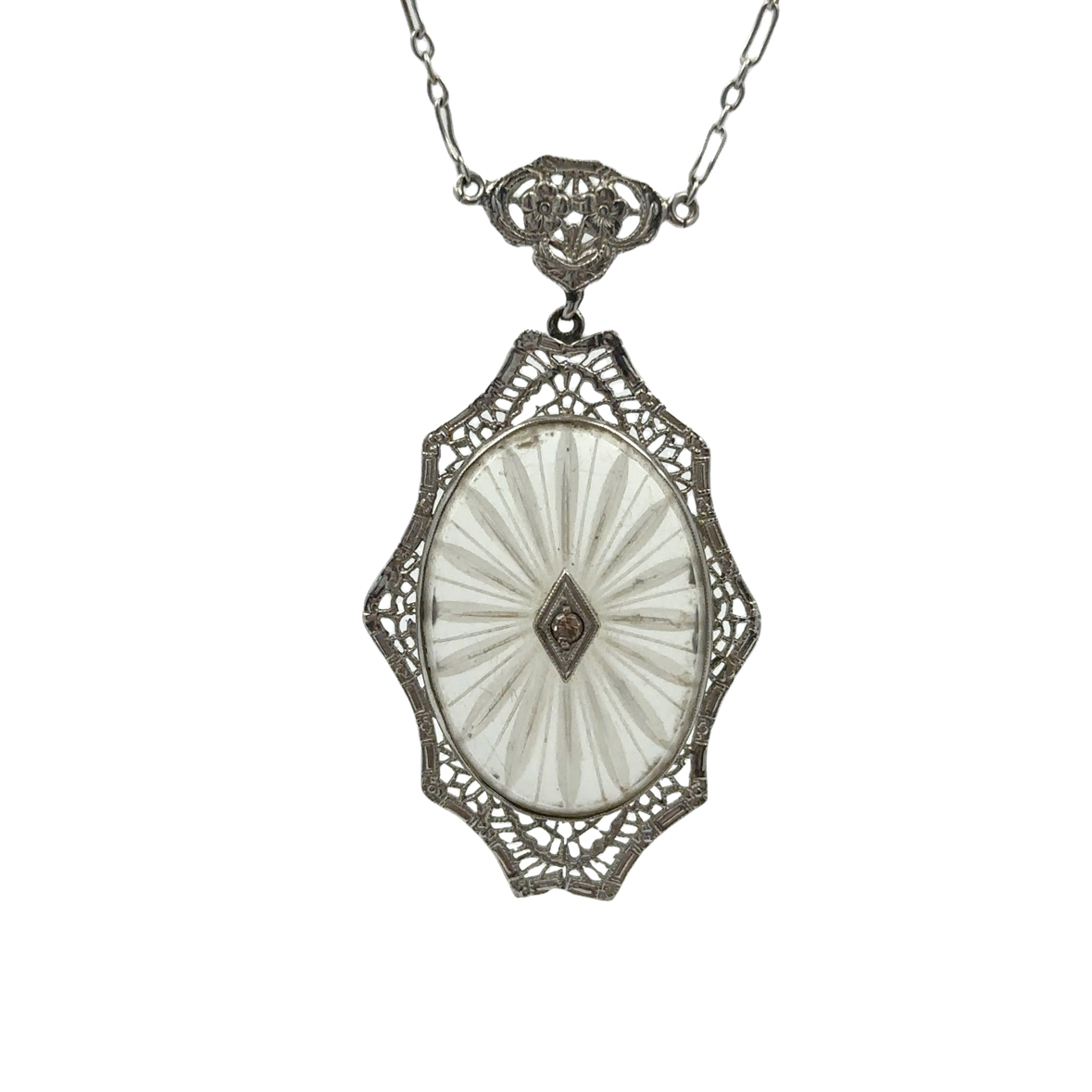 Estate Art Deco White Gold Diamond and Rock Crystal Necklace Circa 1920; 14k white gold; 3.90dwt/6.10g; engraved links; diamond center; 16"