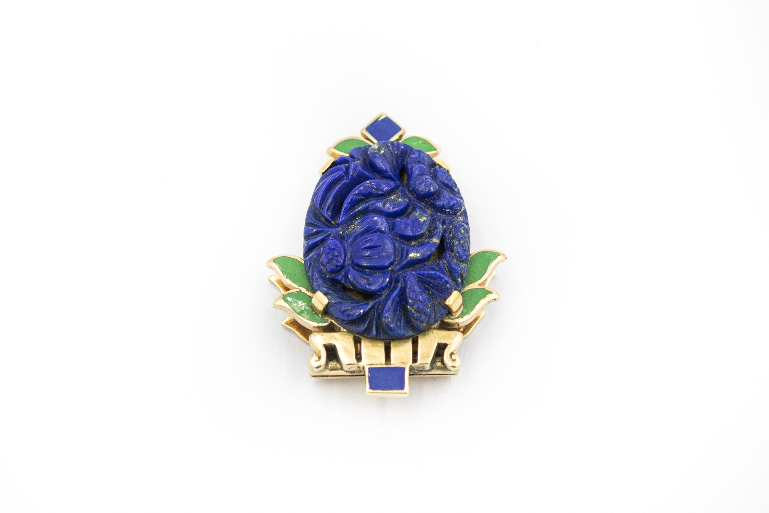 Estate Art Deco Yellow Gold Lapis Lazuli, Green and Blue Enamel Russian Clip
