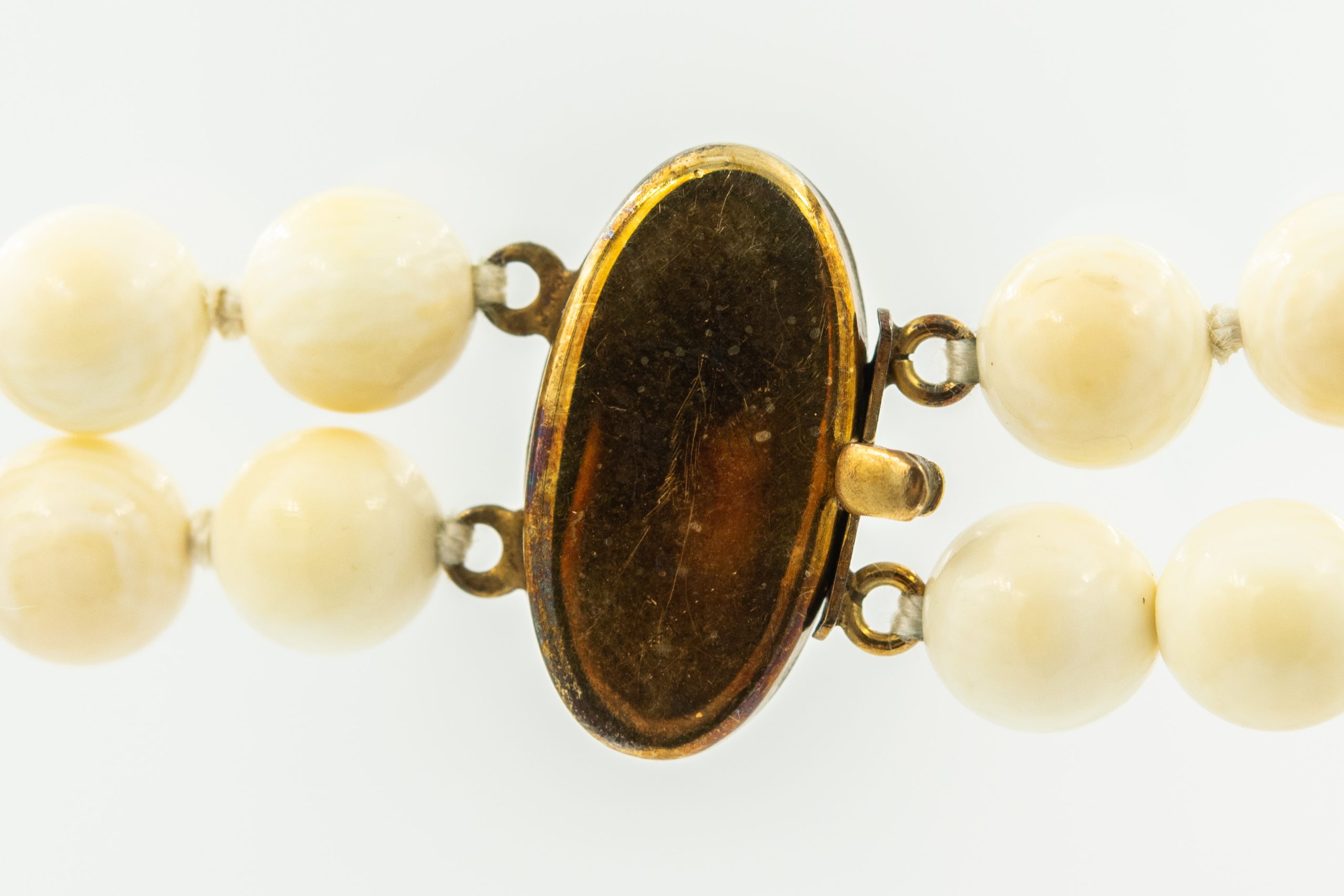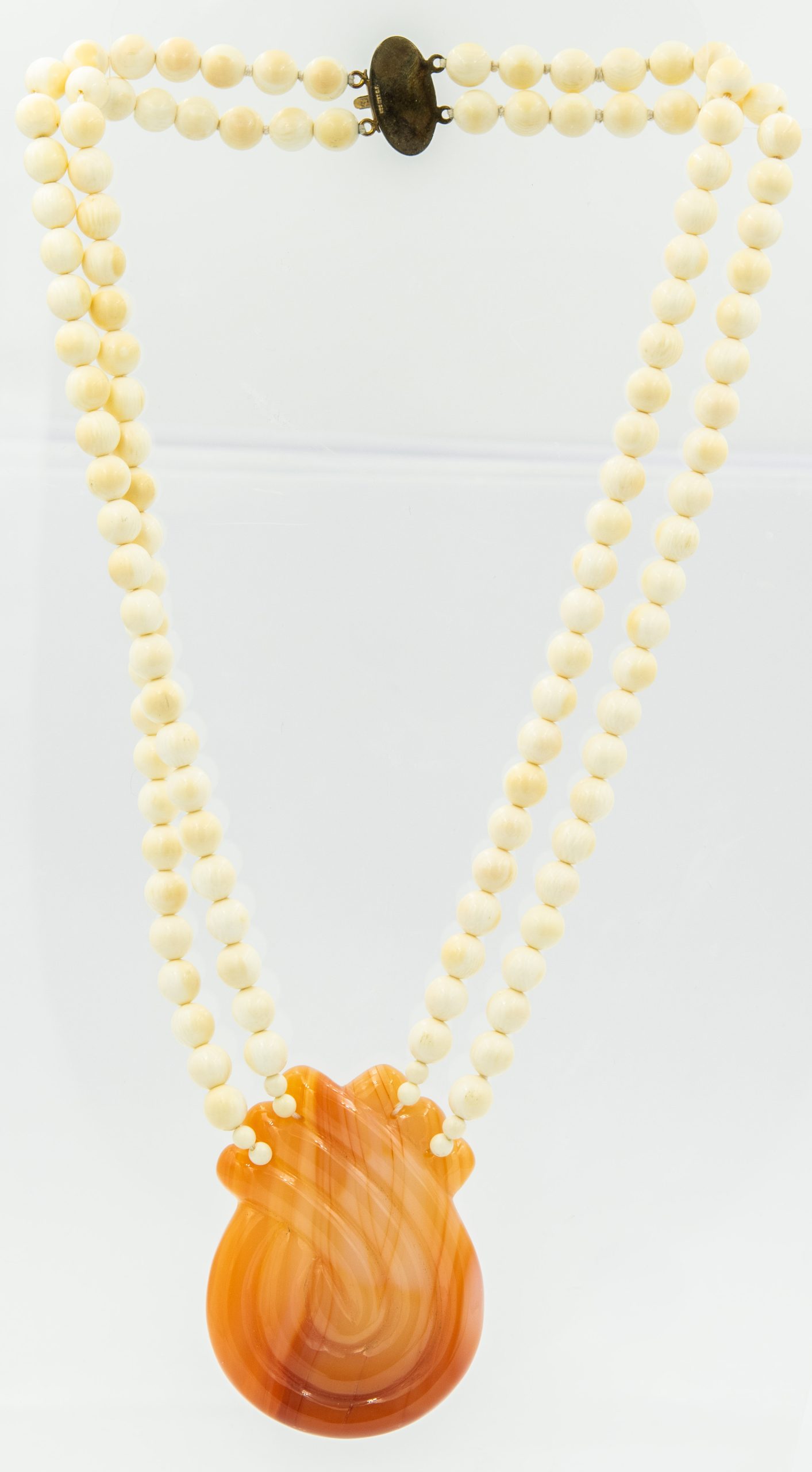 Estate Bead Necklace with White Beads and Banded Agate Pendant; gold filled clasp; 64.5dwt/100.29g; 20 1/2"
