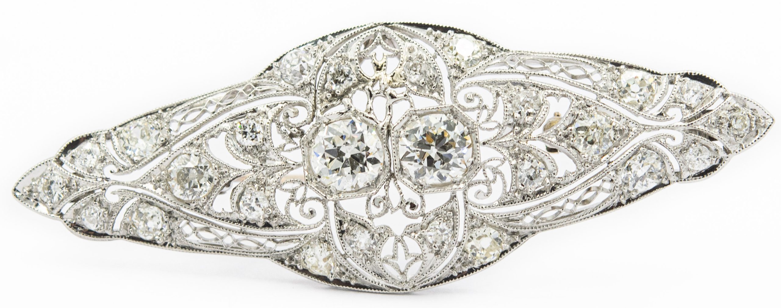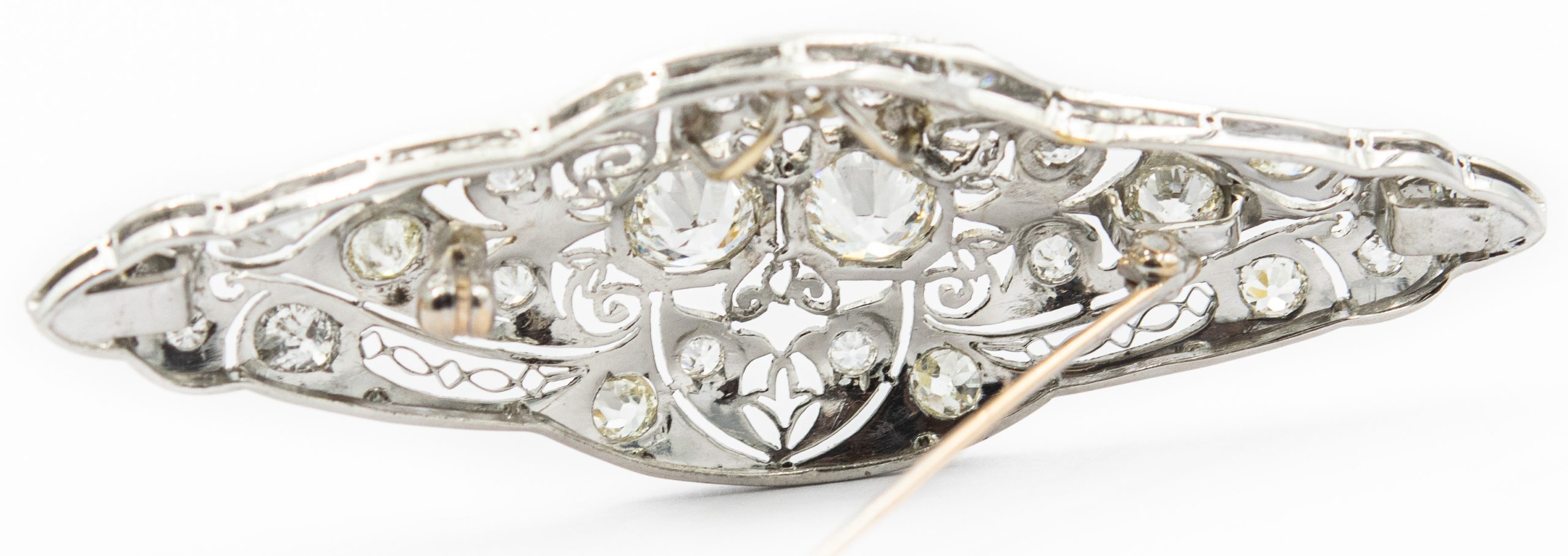 Estate Belle Epoque Platinum and Diamond Brooch; platinum; 5.90dwt/9.10g; 2 diamonds 1.50cts; 24 diamonds 3.00cts; Total Diamond Weight 4.50cts; 2 3/4" x 3/4"