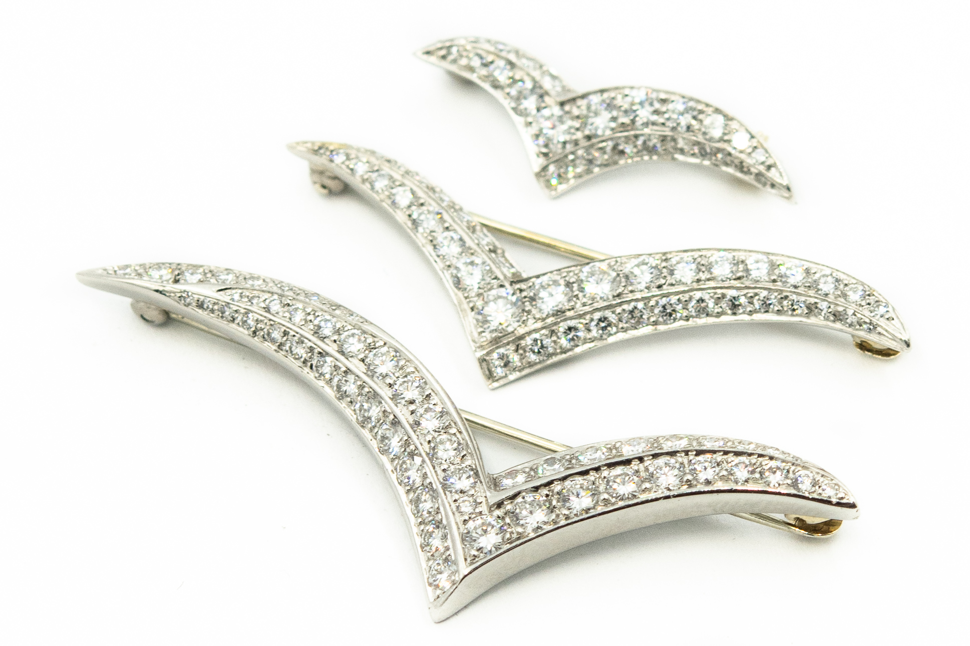 Estate Collection of (3) Graduating Platinum and Diamond Seagull Brooches by Tiffany & Co.; platinum; 9.00dwt/13.90g; 106 pave set diamonds 4.50cts; 1", 1 3/4" and 2 1/4"