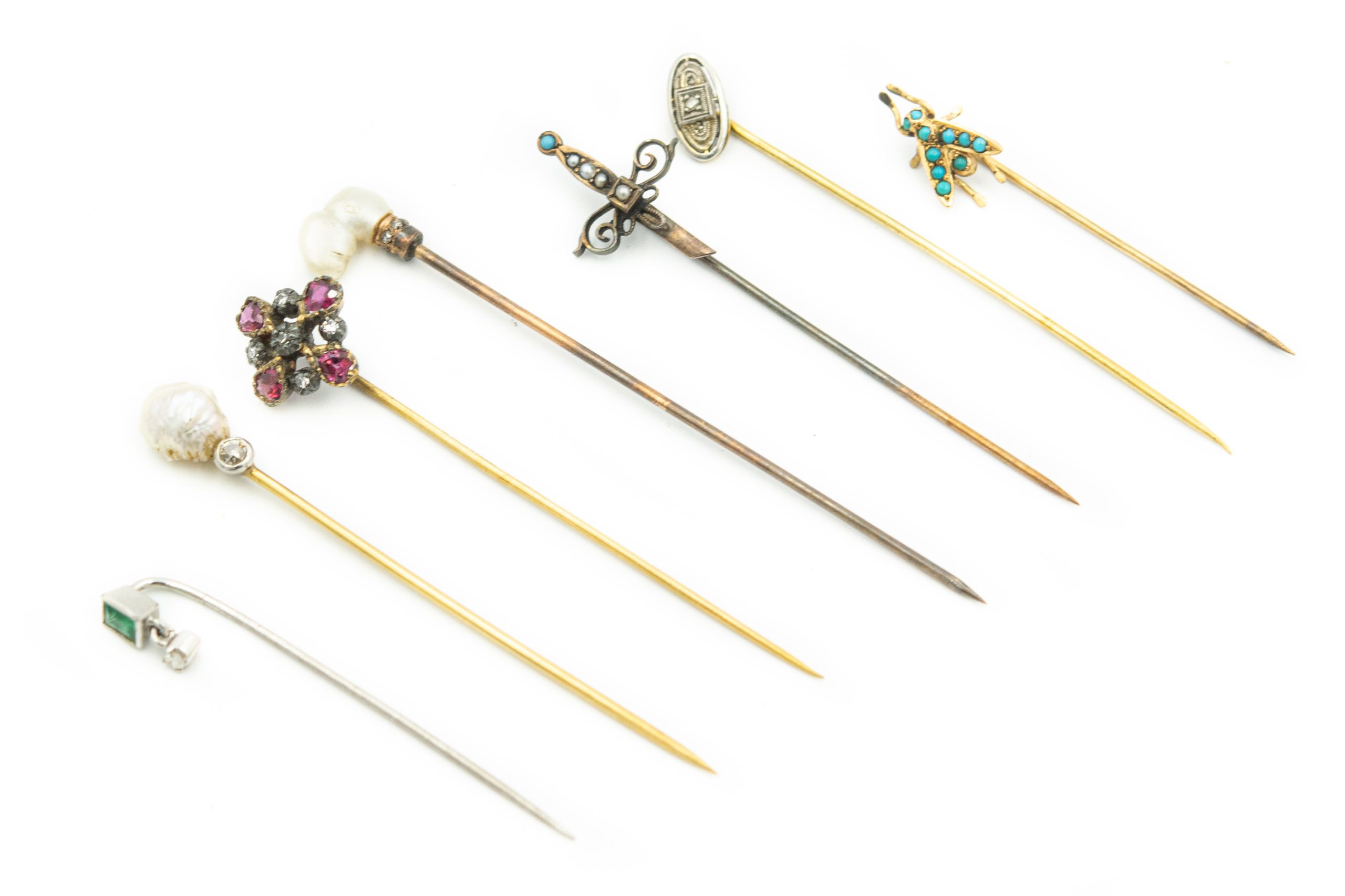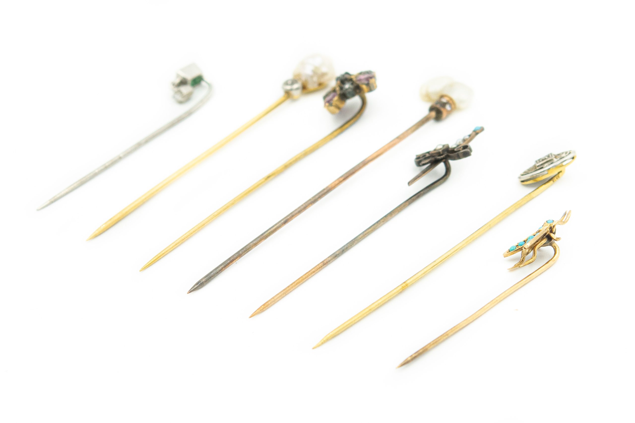 Estate Collection of (7) Yellow Gold Stick Pins; 14k yellow gold; 7.70dwt/12.0g