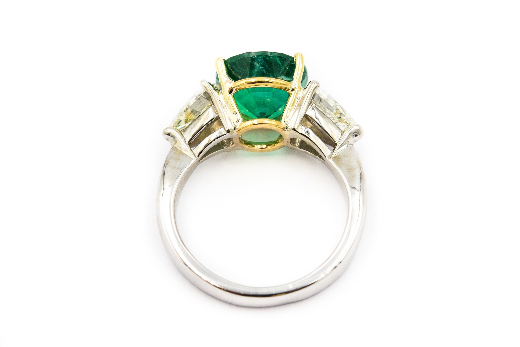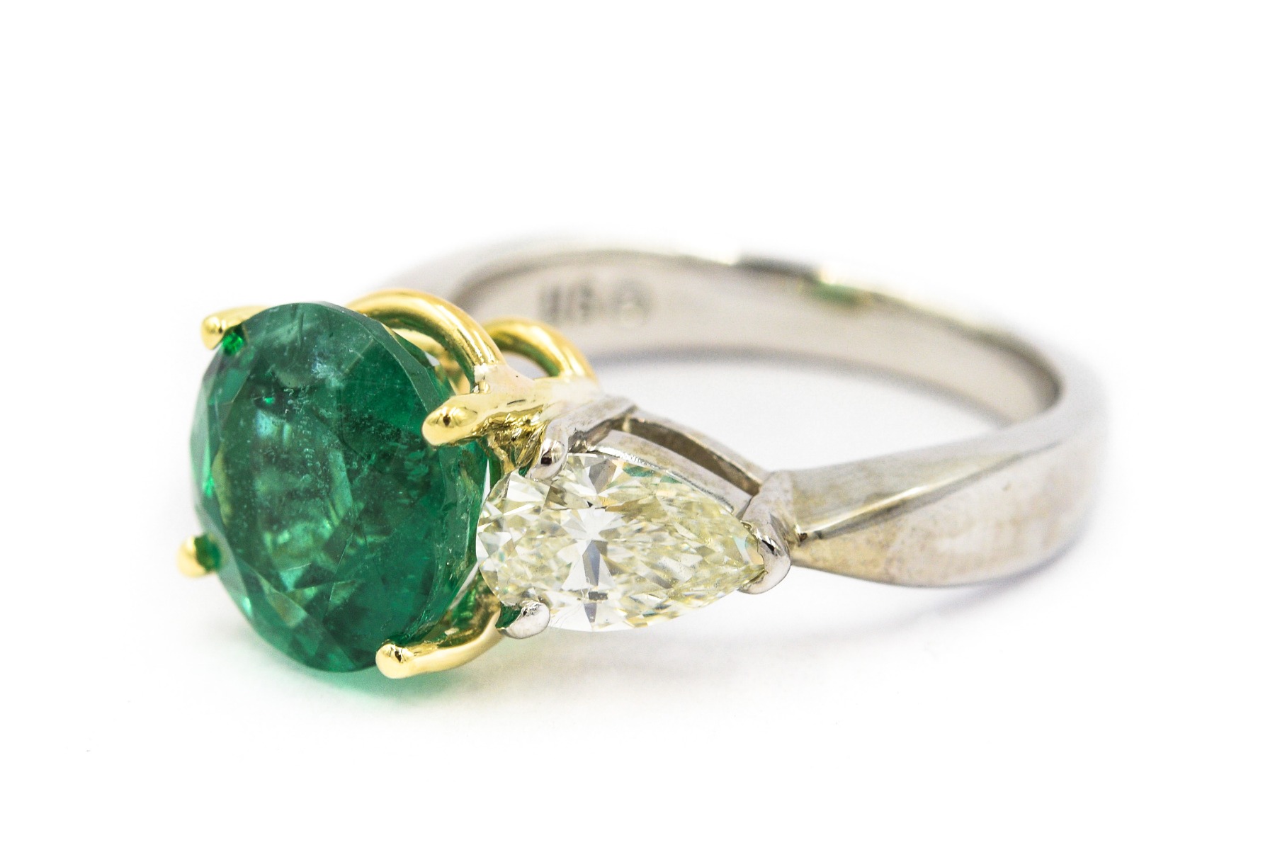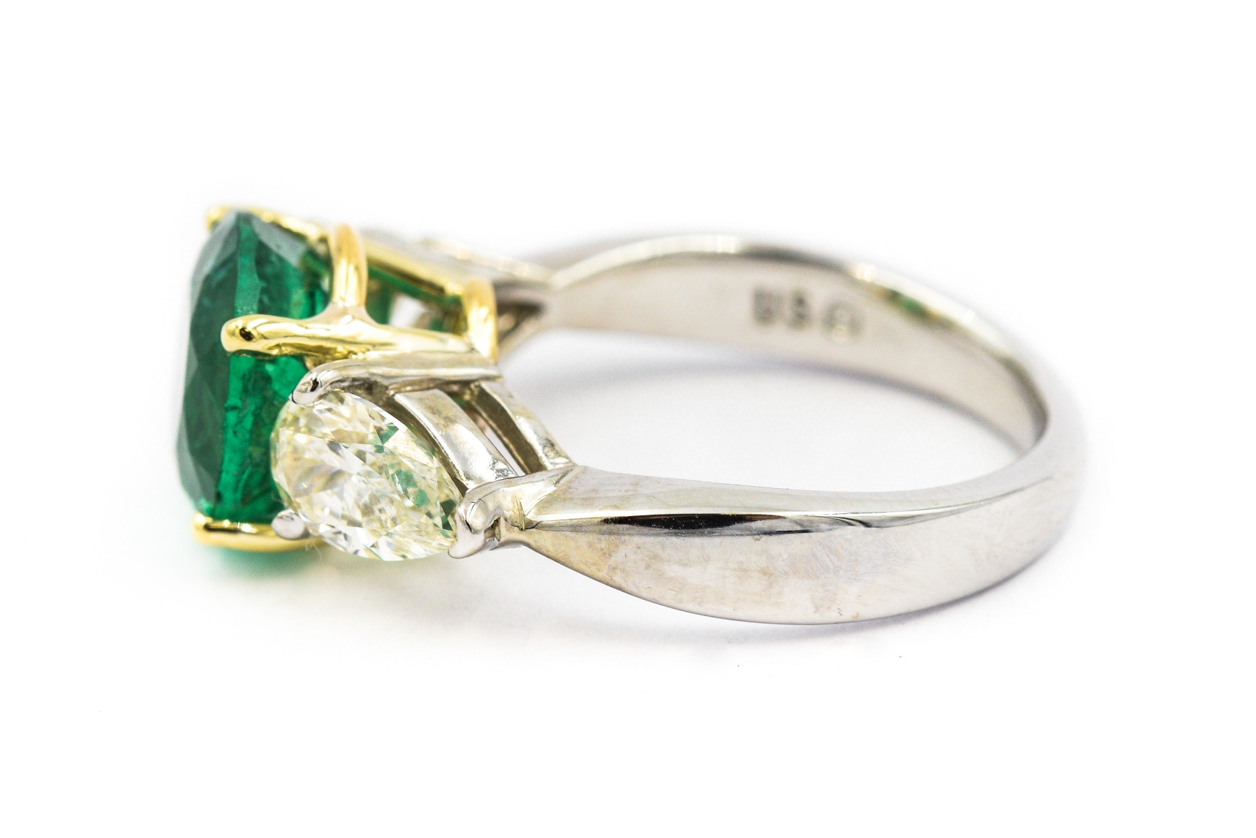 Estate Contemporary Platinum Emerald and Diamond Ring with AGL Report; platinum; 4.2dwt/6.53g; 2 pear shape diamonds 1.42cts; 1 center emerald 3.78cts; Ring Size 7; AGL Report No. 1096075