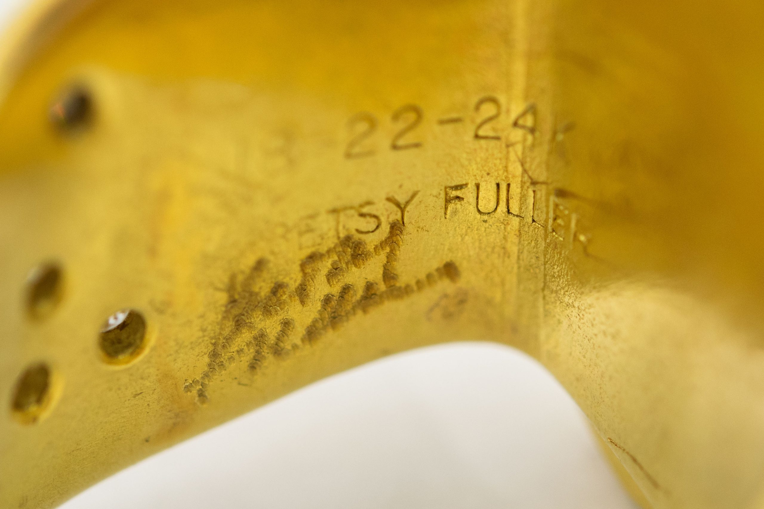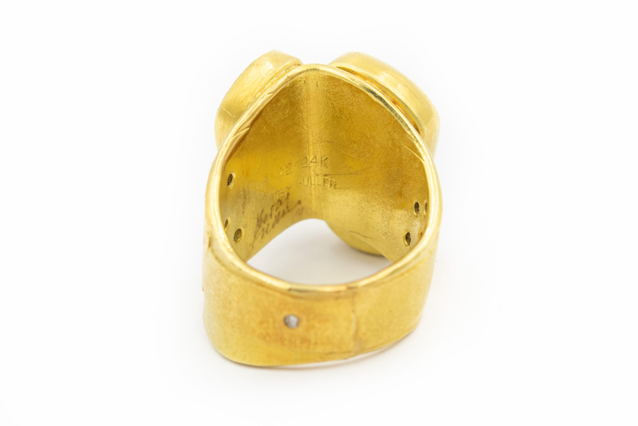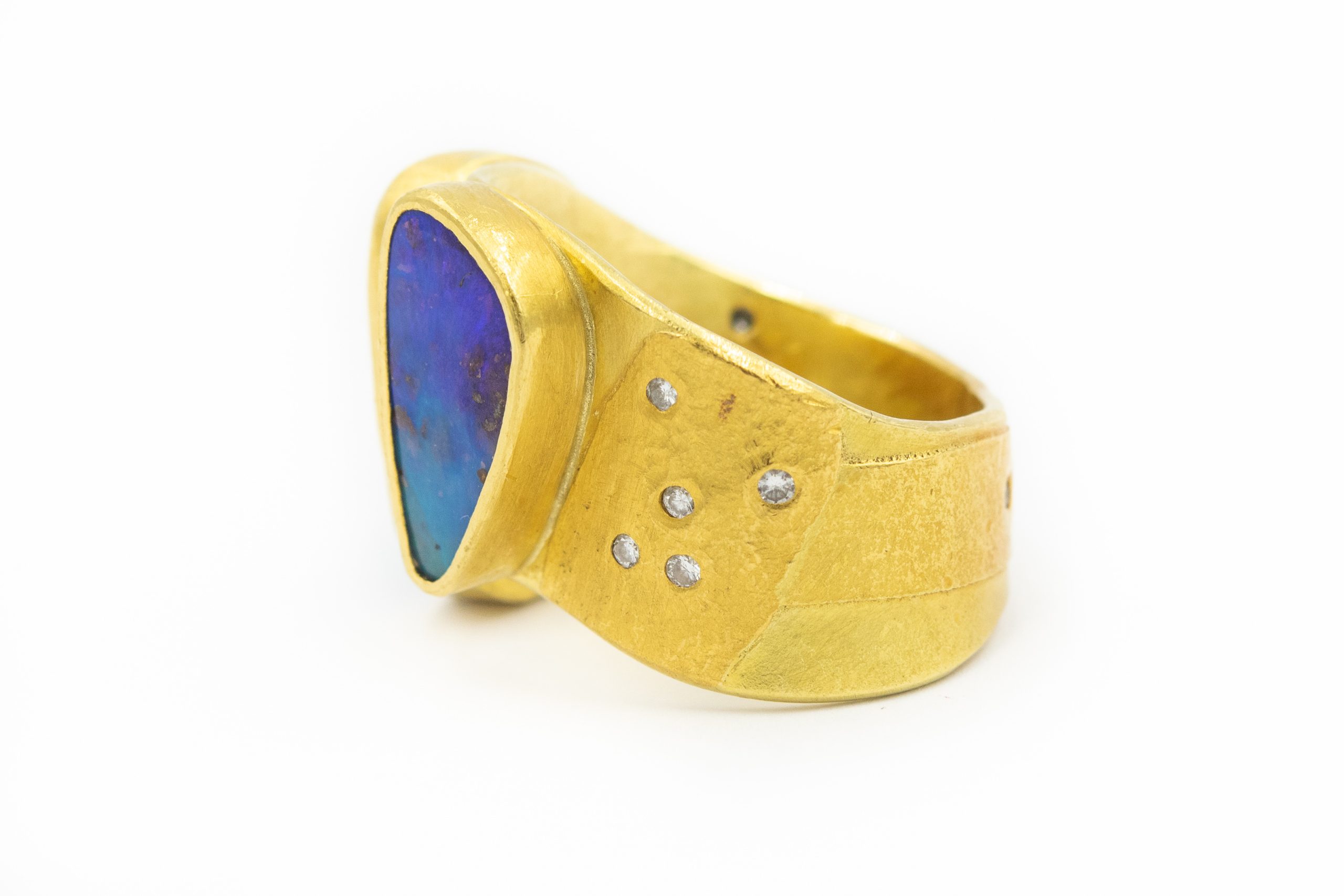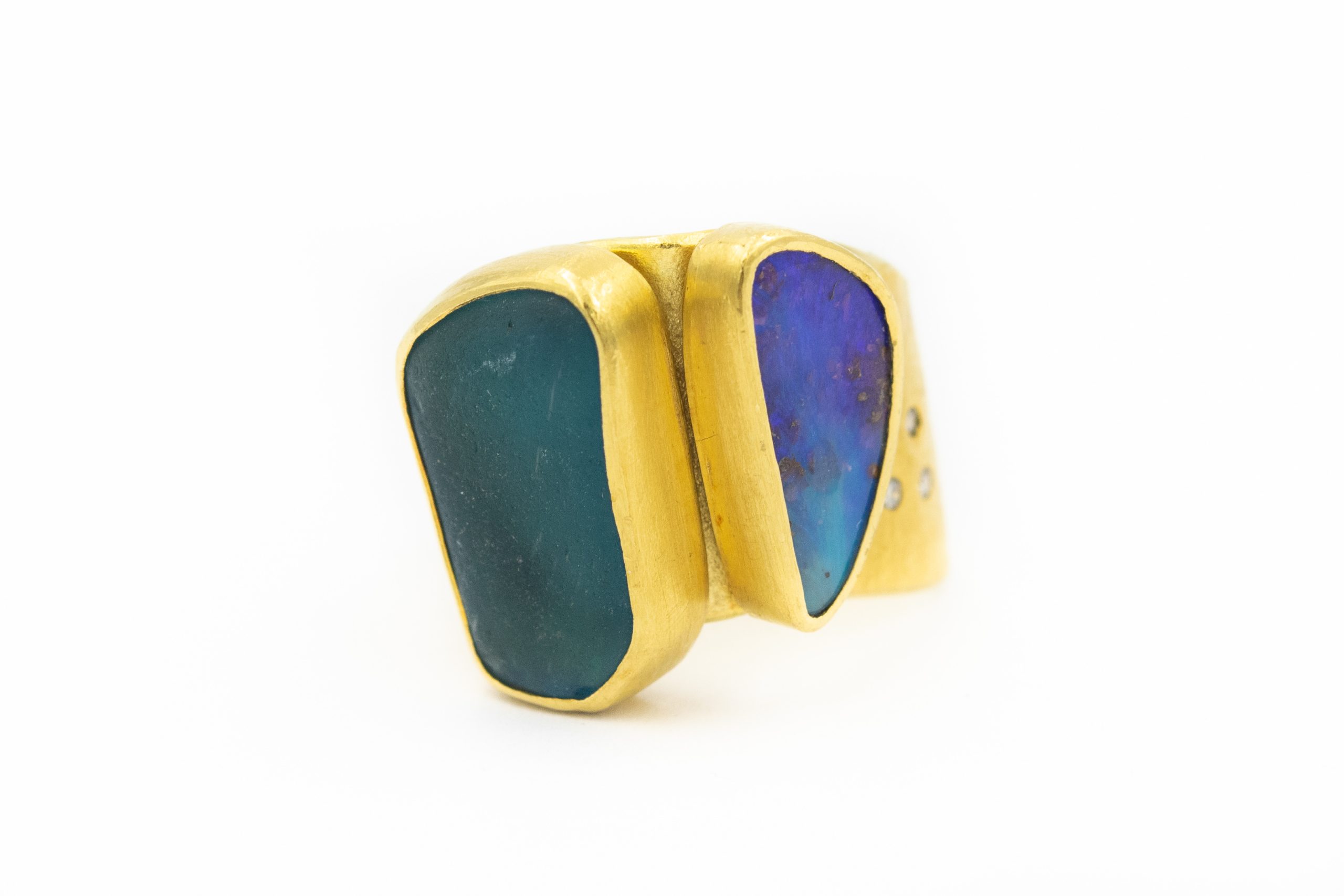 Estate Contemporary Yellow Gold Diamond Sea Glass and Opal Ring by Betsy Fuller; 18k, 22k and 24k yellow gold; 12.3dwt/19.1g; 10 round diamonds 0.10cts; 1 asymmetrical black opal; 1 asymmetrical sea glass; Ring Size 6 1/2