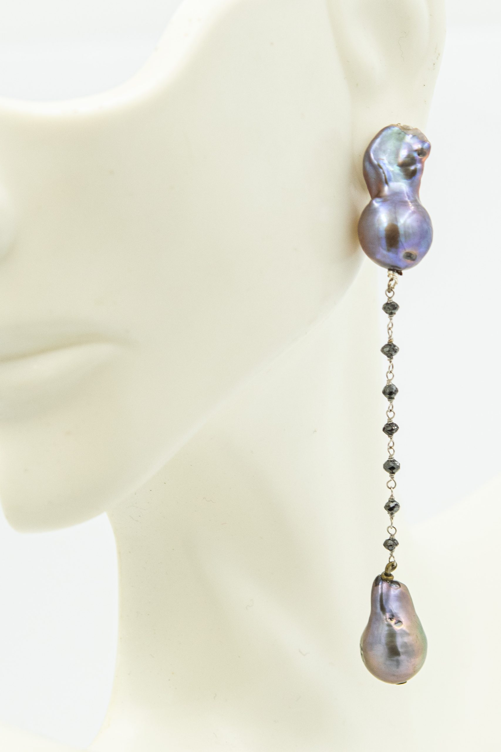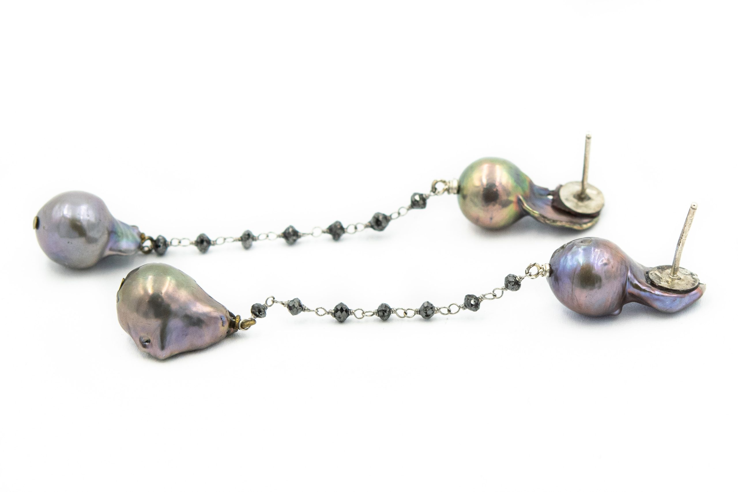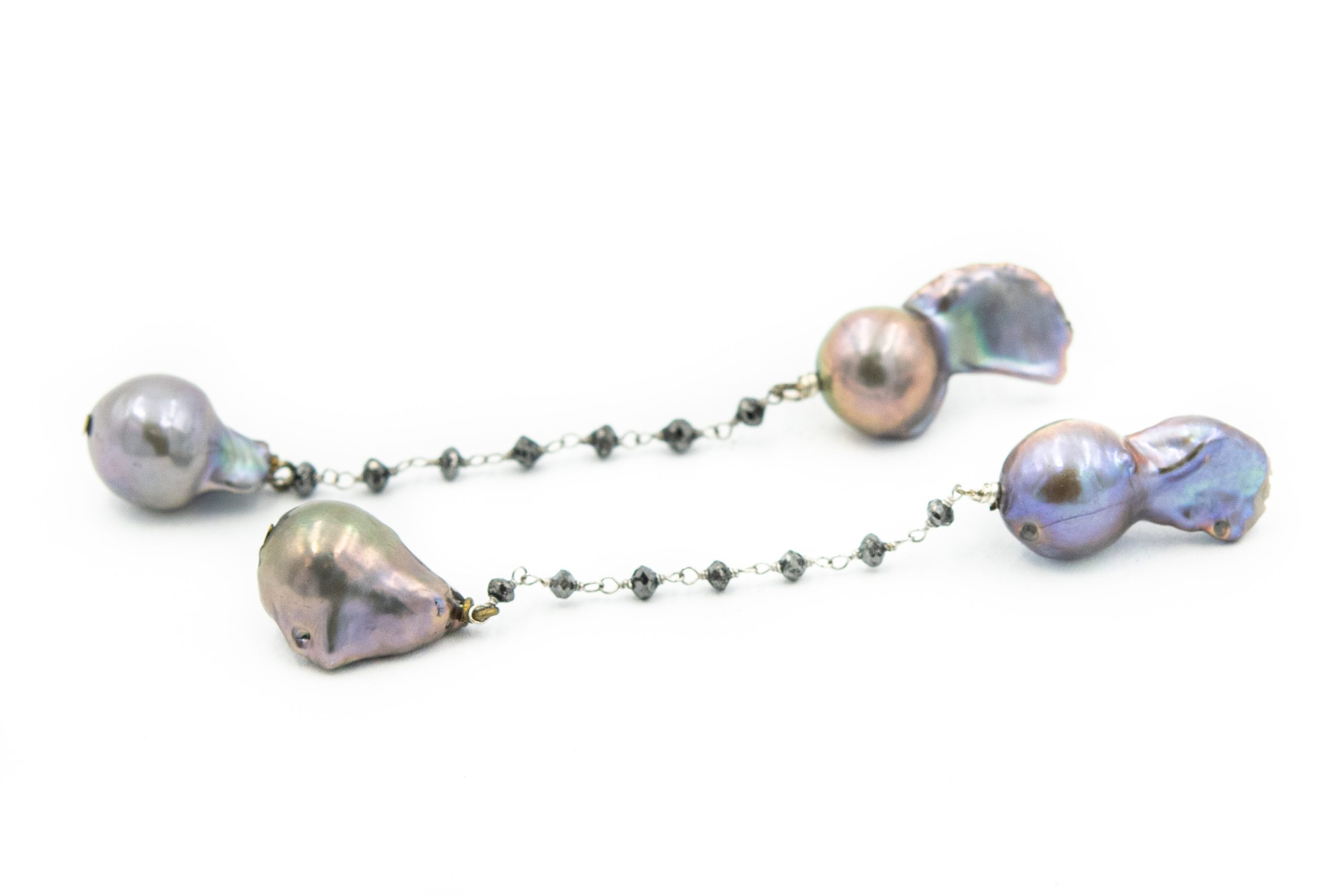 Estate Cultured Black Pearl Ear Pendants; 4 Baroque pearls measuring 15.0mm x 9.0mm in width suspending from a silver chain strung with rough gemstones.