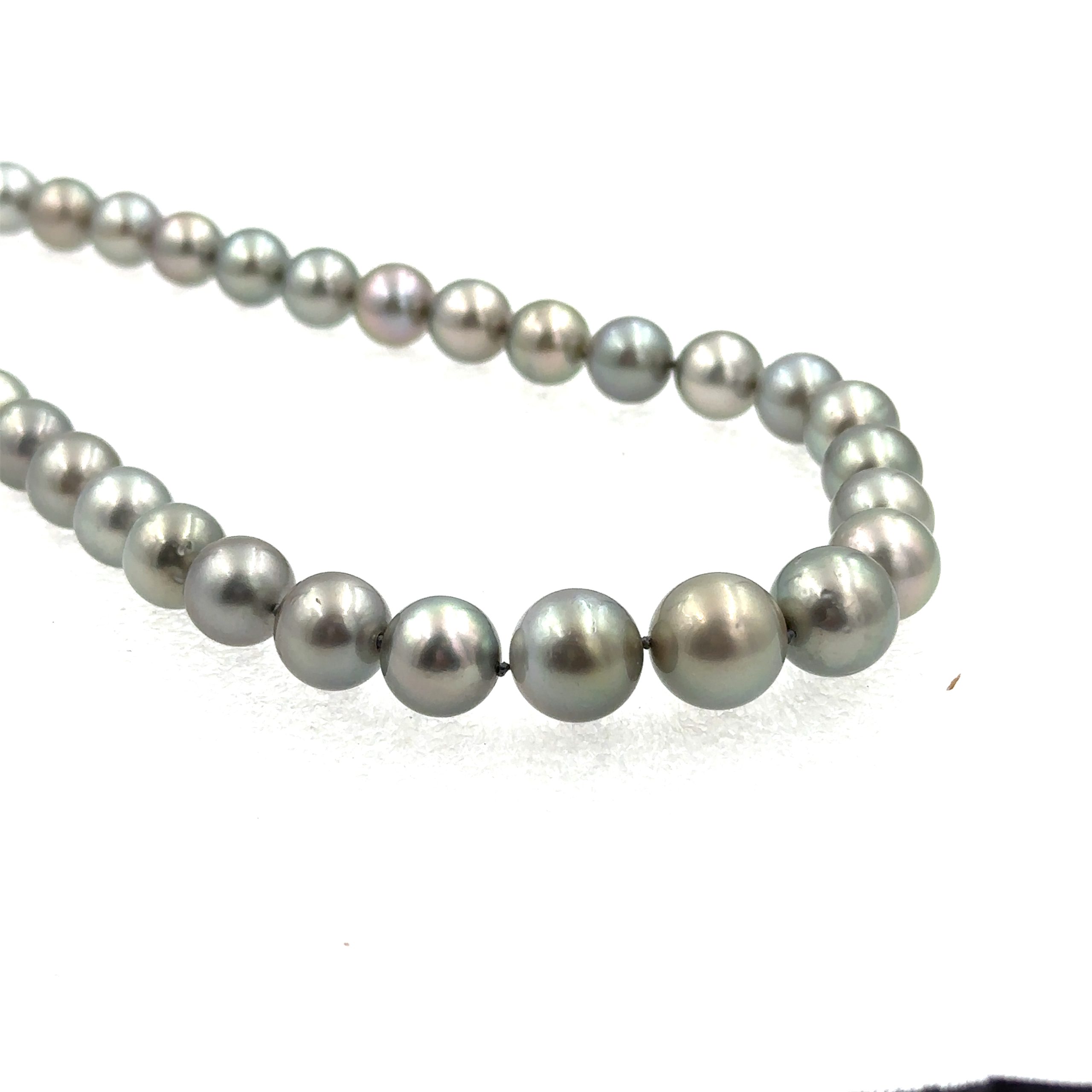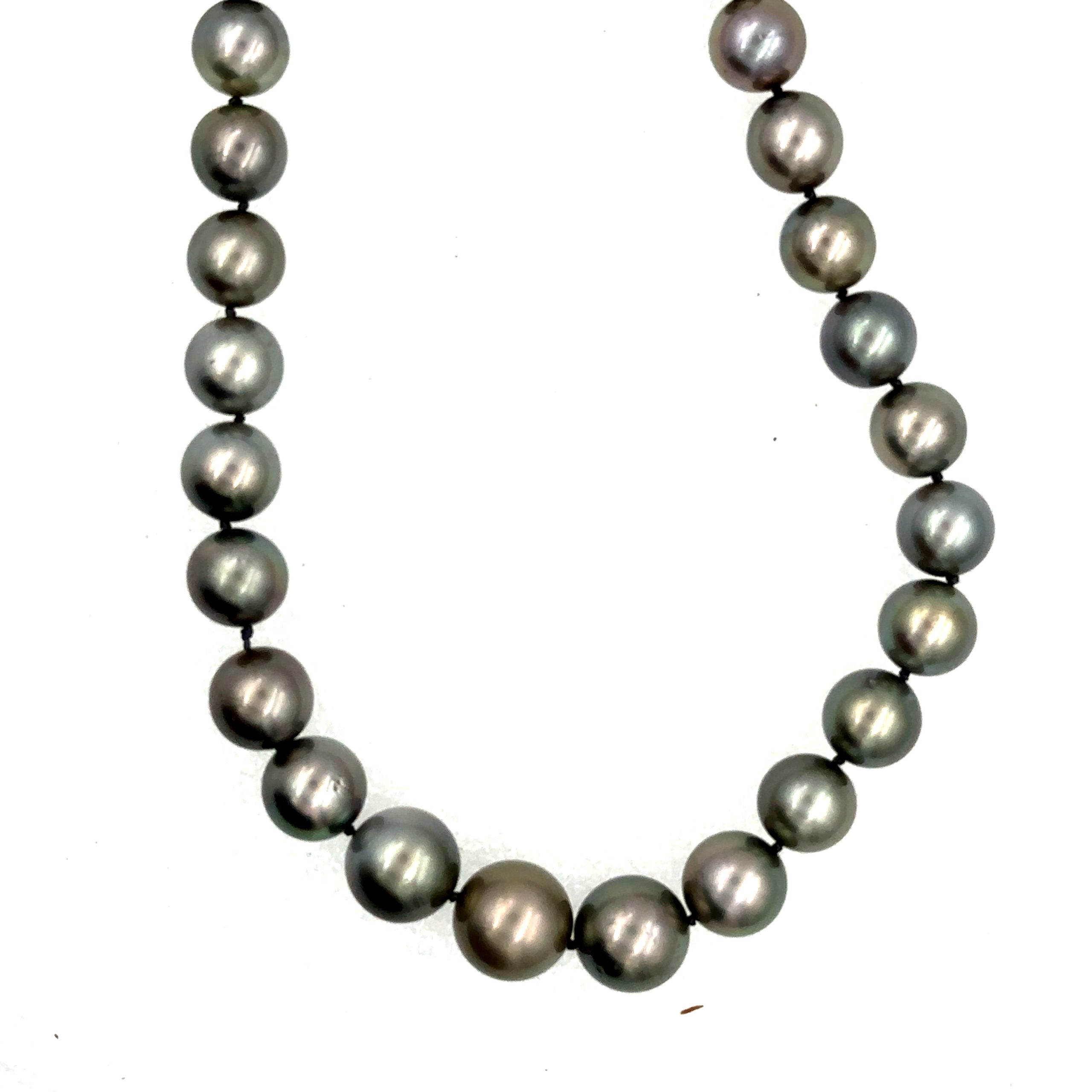 Estate Cultured Grey Tahitian Pearl and Diamond Necklace. The necklace features a graduating single strand design that is strung with 37 pearls measuring 10.25mm--13.60mm. The necklace terminates with an 18K white gold ball clasp that is pave set with 75 diamonds that weigh 1.25cts combined. The necklace is 18" long.