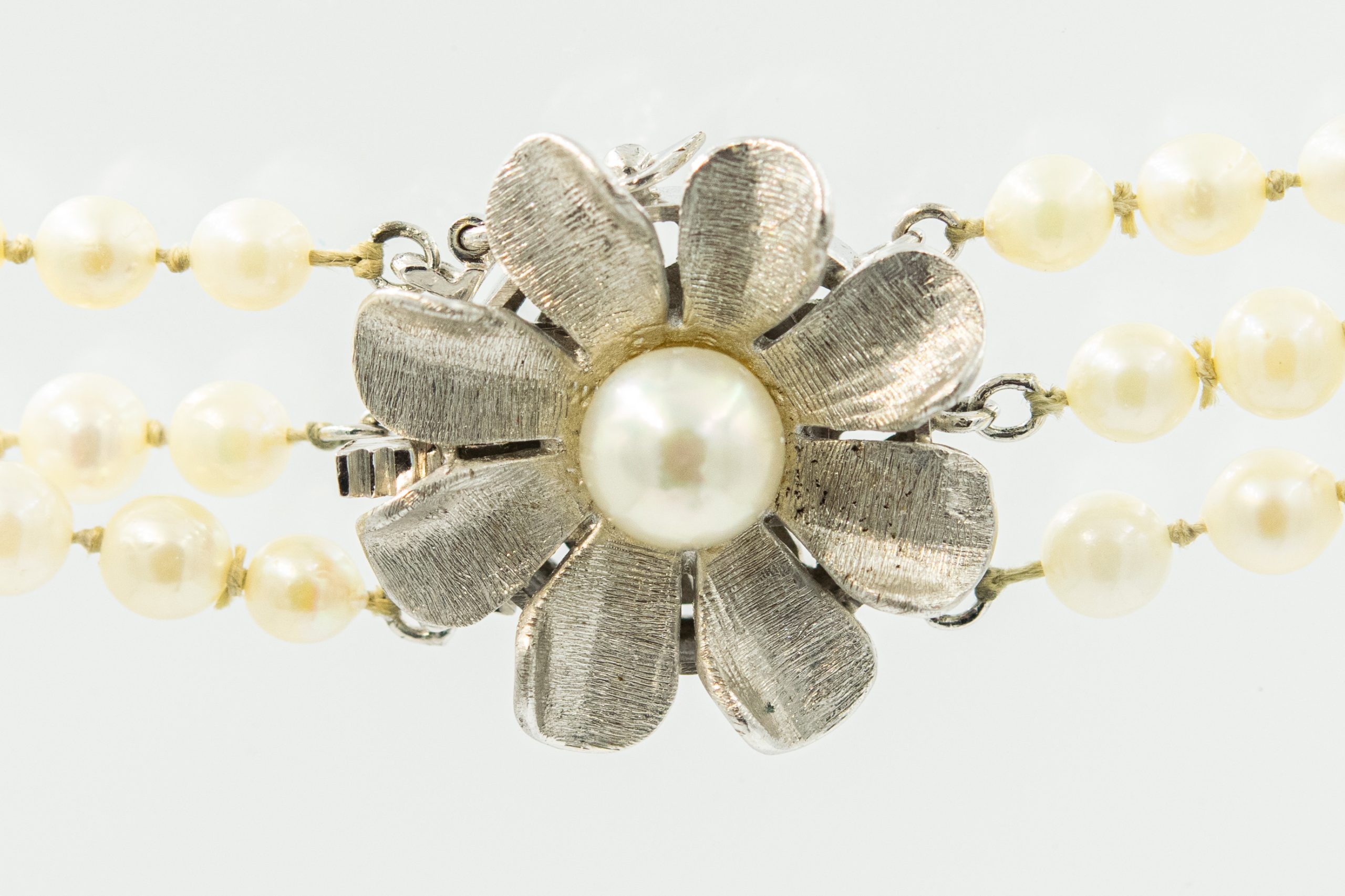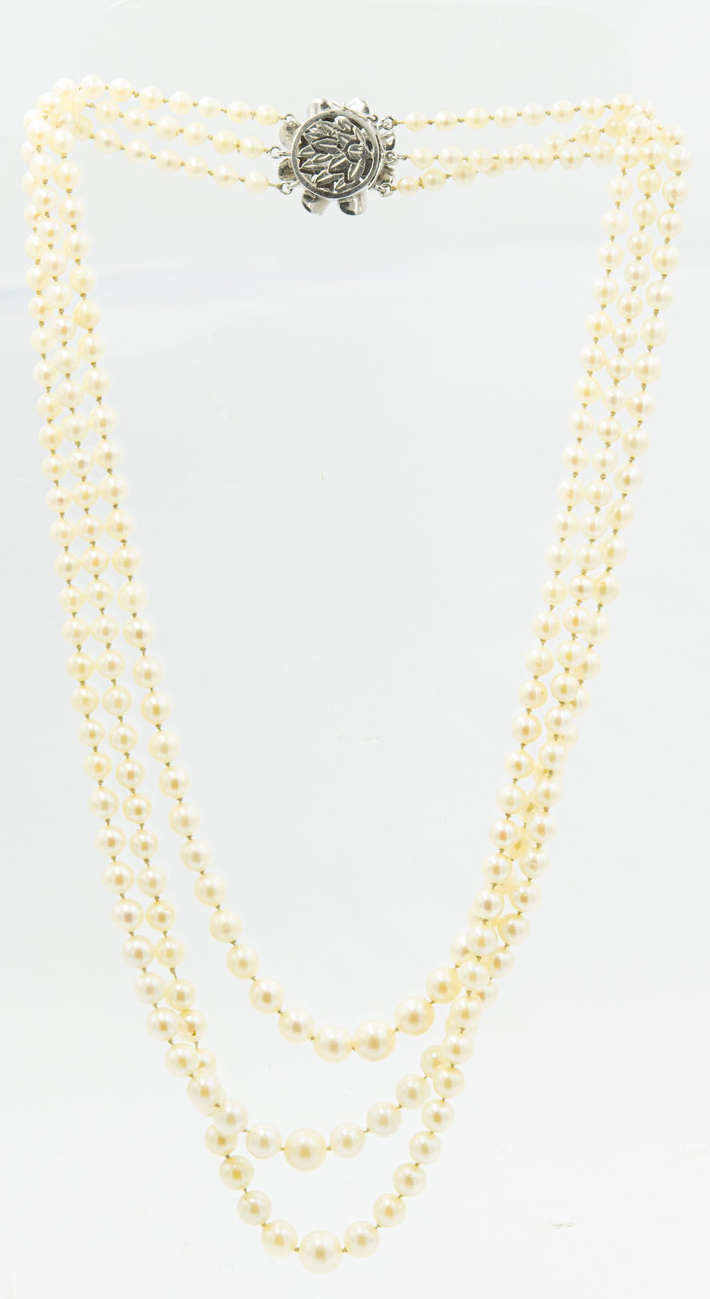 Estate Cultured Pearl Triple Strand Necklace. The necklace features 236 graduating pearls measuring 4.50mm - 8.20mm in width. The necklace measures 20-20" long and terminates with a 14K white gold floral clasp.