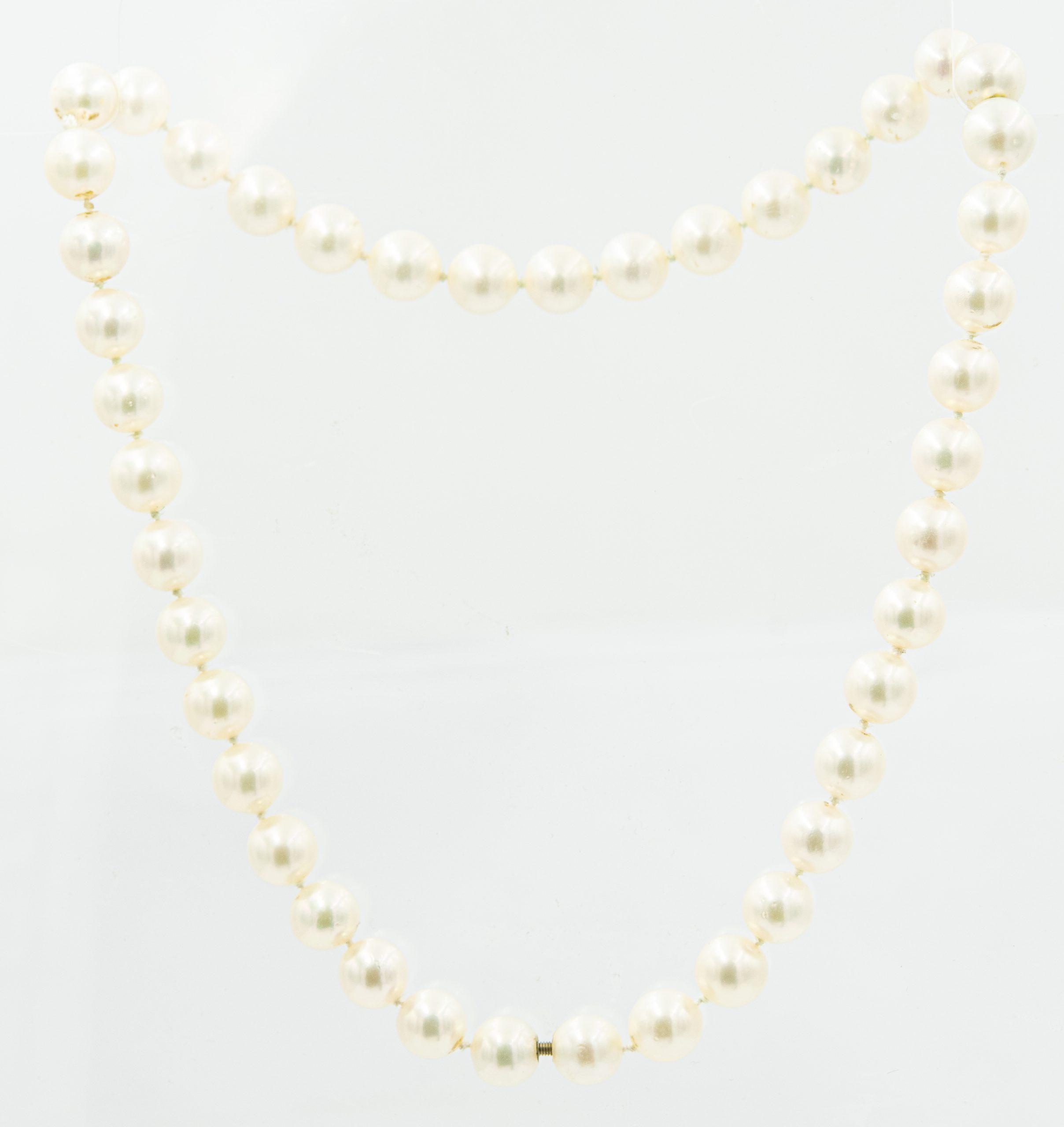Estate Cultured Single Strand Pearl Necklace; The necklace features a single strand design that is strung with 42 pearls measuring 8.90mm - 9.00mm. The necklace is 15" long.