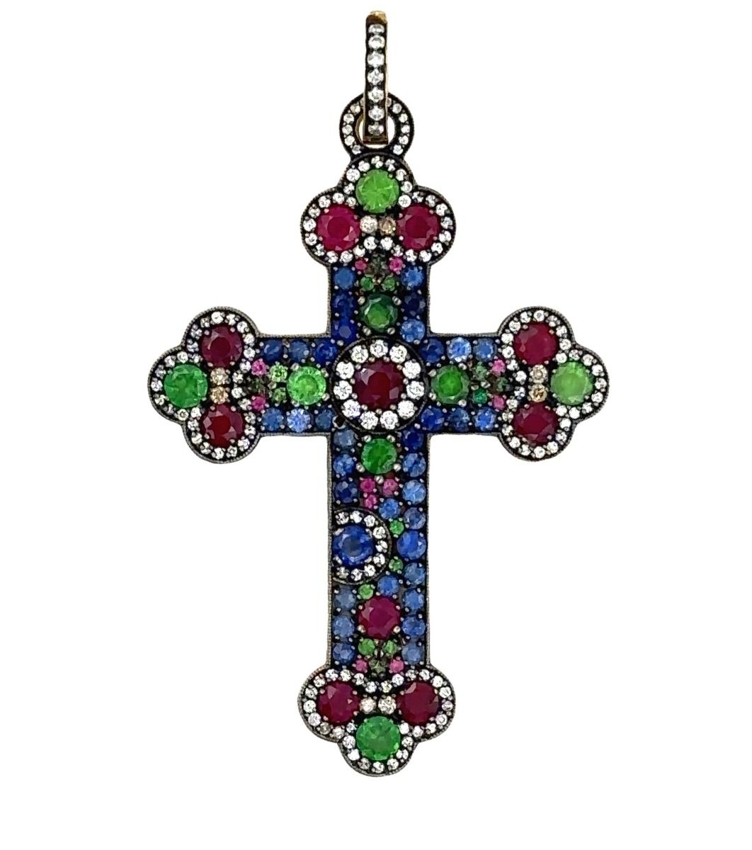 Estate Designer Gold Diamond and Gemstone Cross by Norman Covan
