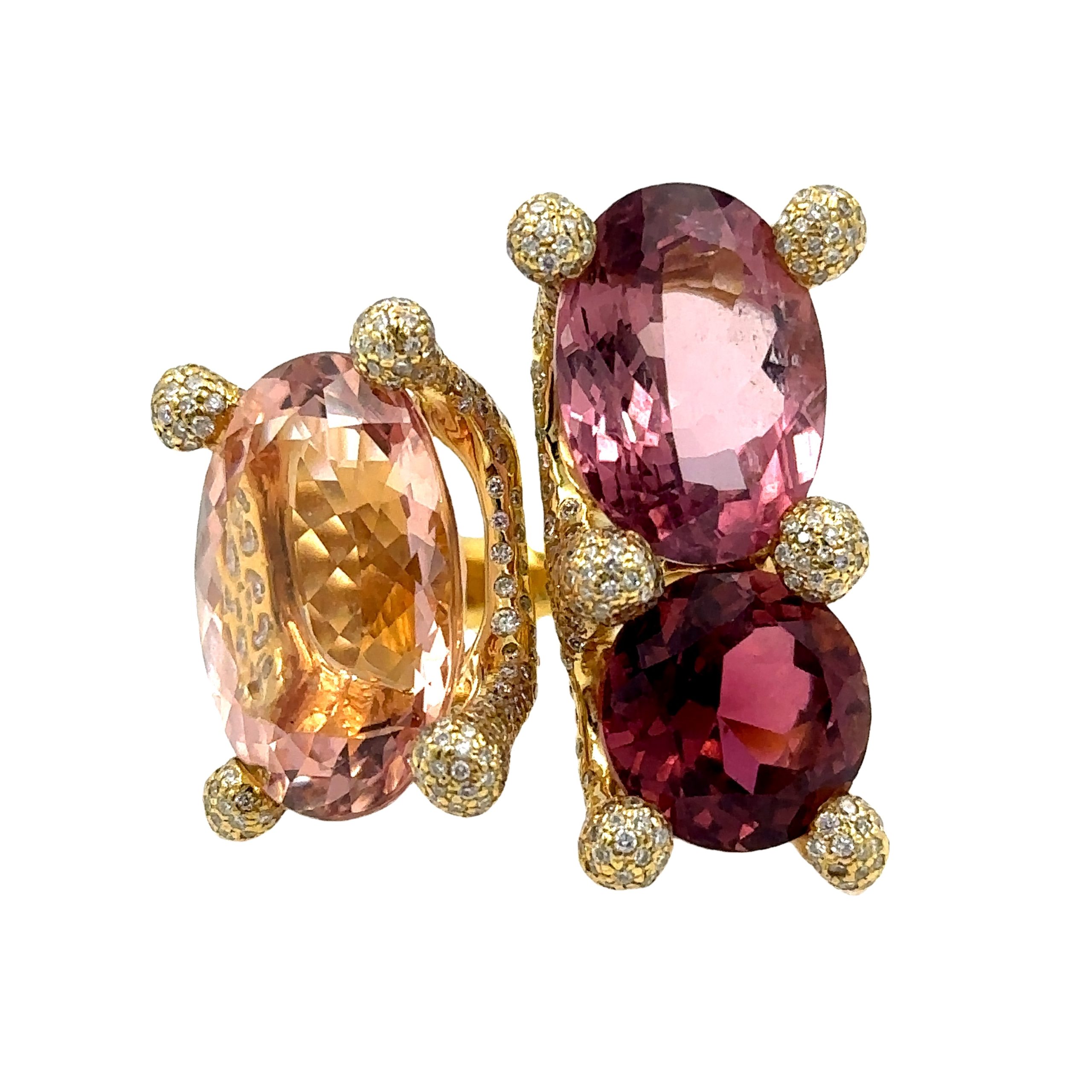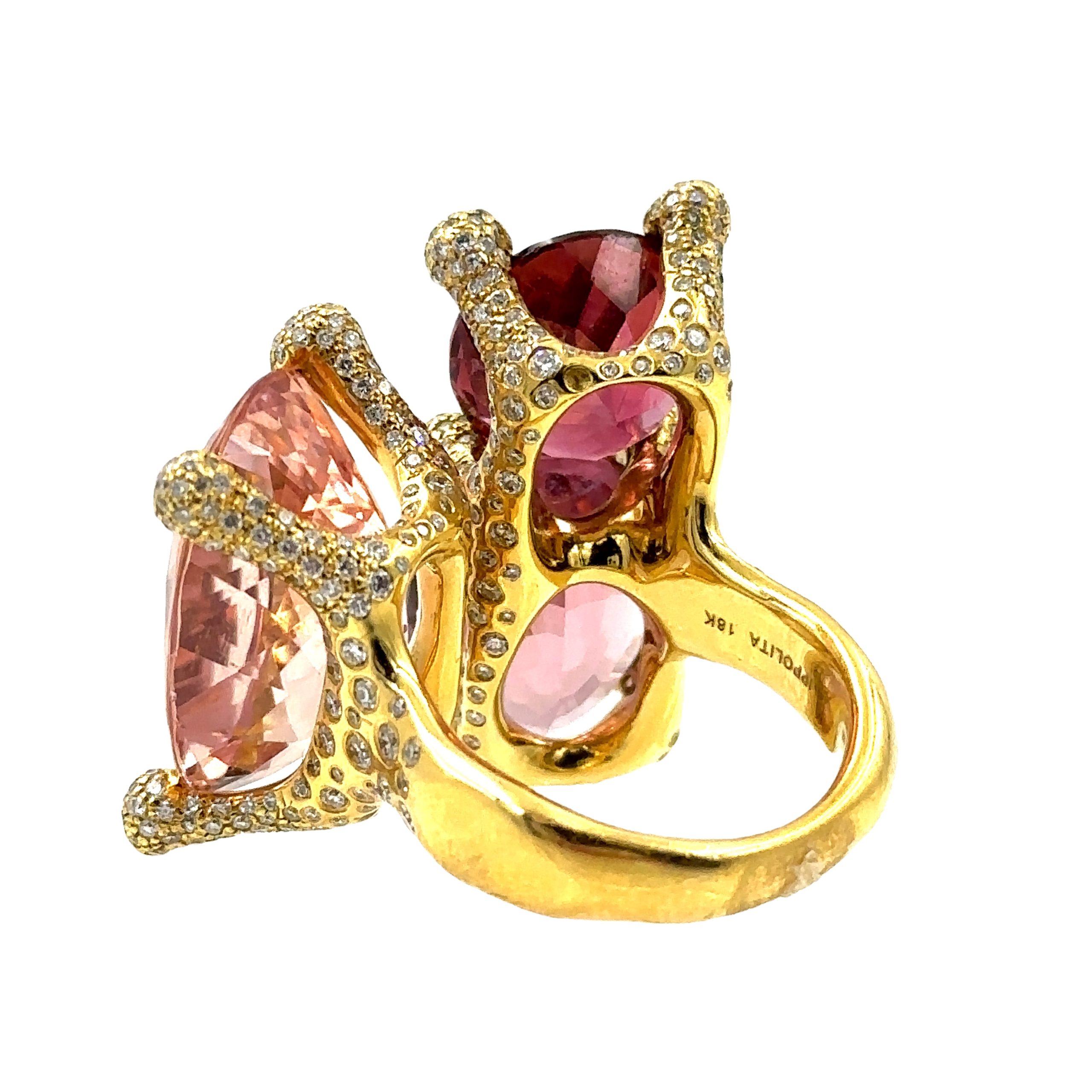 Estate Designer "Rock Candy" Diamond and Gemstone Ring by Ippolita; 18k gold; 19.40dwt/30.10g; (3) large oval faceted kunzite and tourmaline's 34.00Cts; 150 bezel set diamonds 1.50Cts; Ring Size 6 1/2
