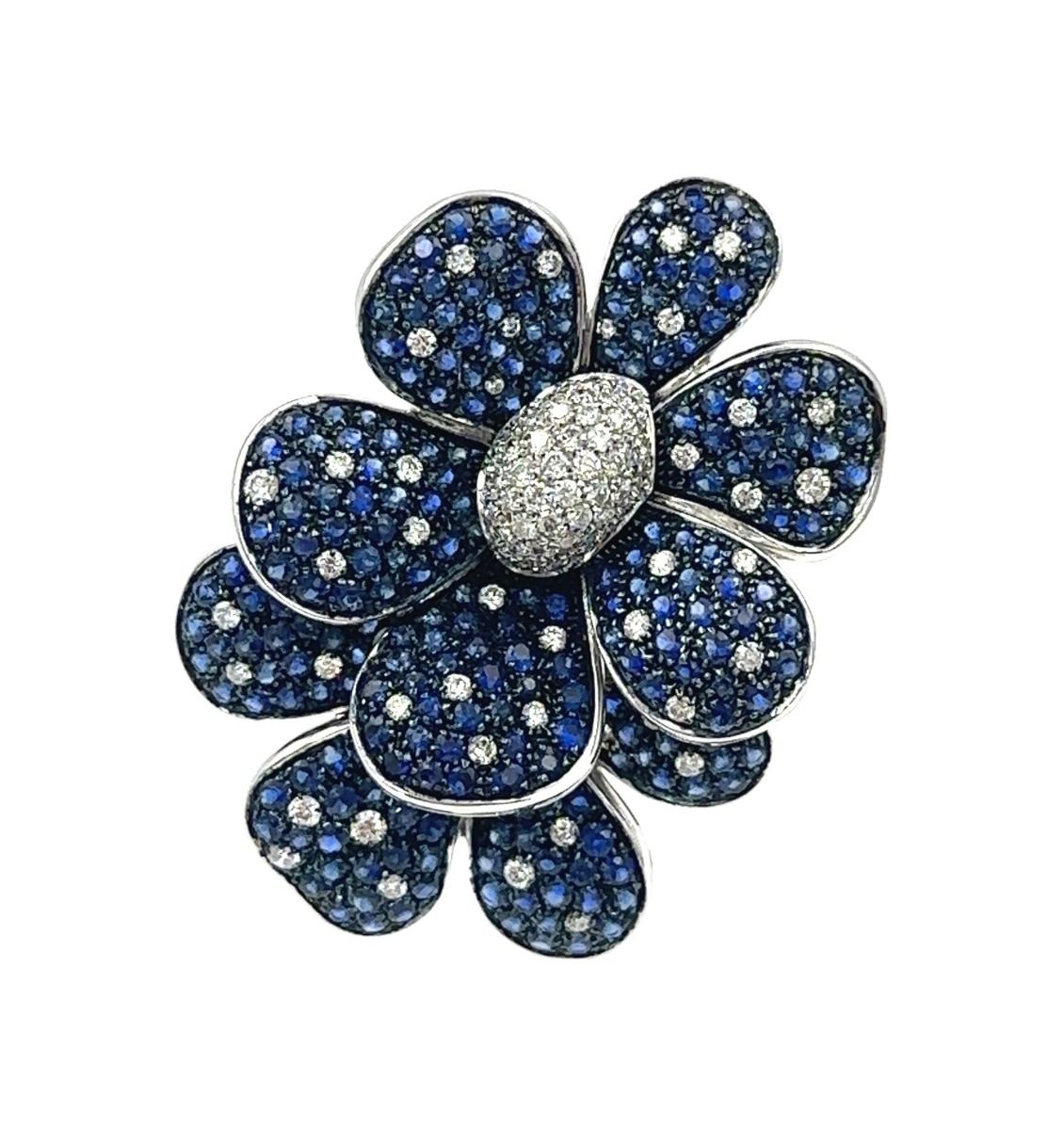 Estate Designer White Gold, Diamond and Sapphire Flower Ring; 18k white gold; 14.00dwt/21.70g; diamonds 1.10cts; sapphires 4.59cts; Ring Size 7