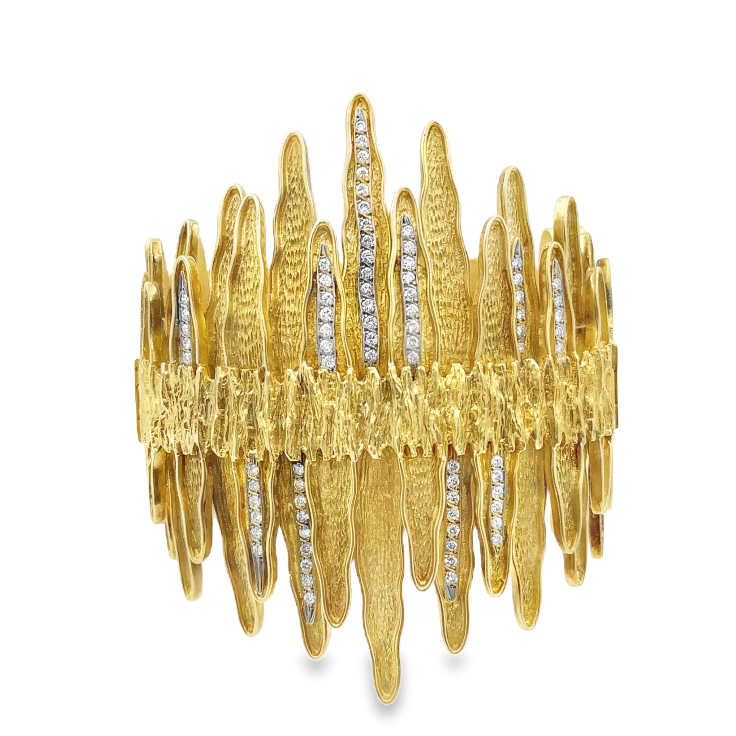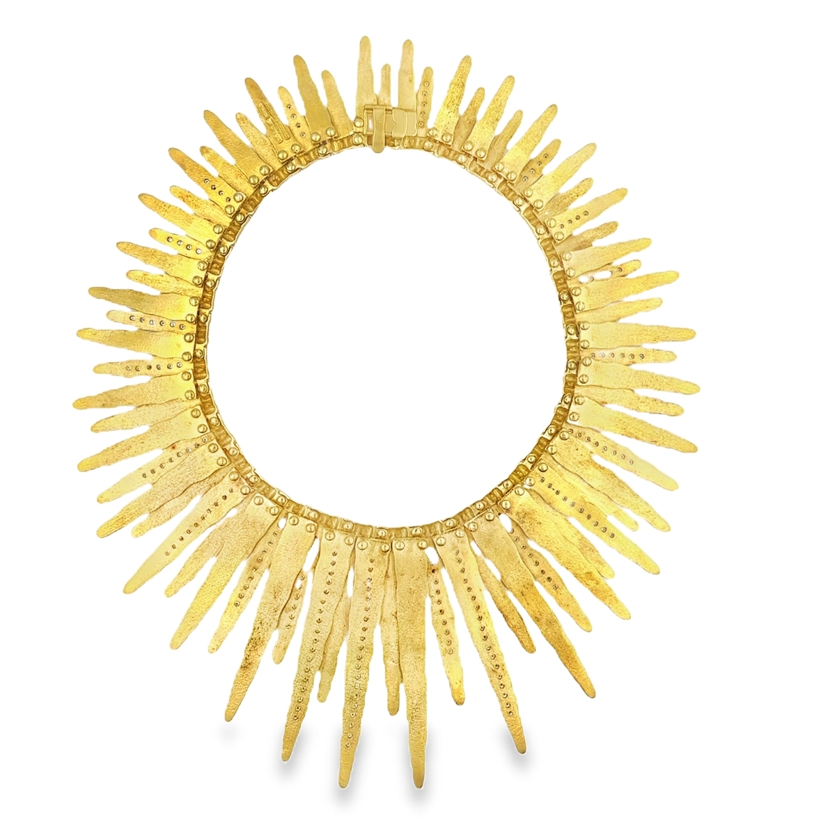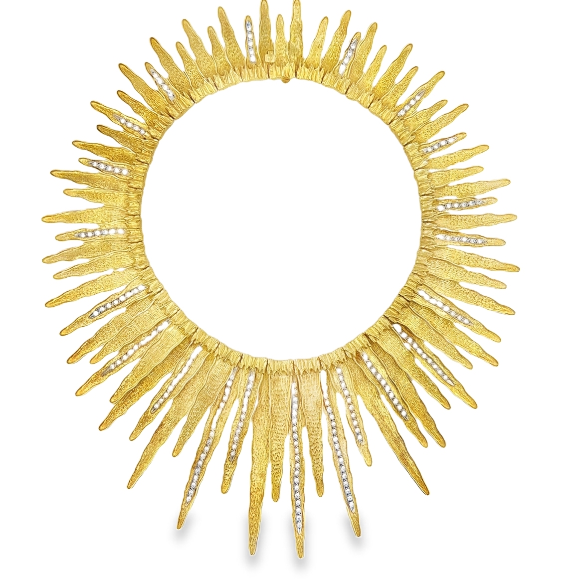 Estate Designer Yellow Gold and Diamond "Veiled Earth Scripts" Necklace and Bracelet Suite by Maramenos & Pateras; 18k yellow gold; 333.0dwt/517.85g; Necklace: 15 3/4"; Bracelet 7 1/4" featuring a sunburst design with highly textured sunray links