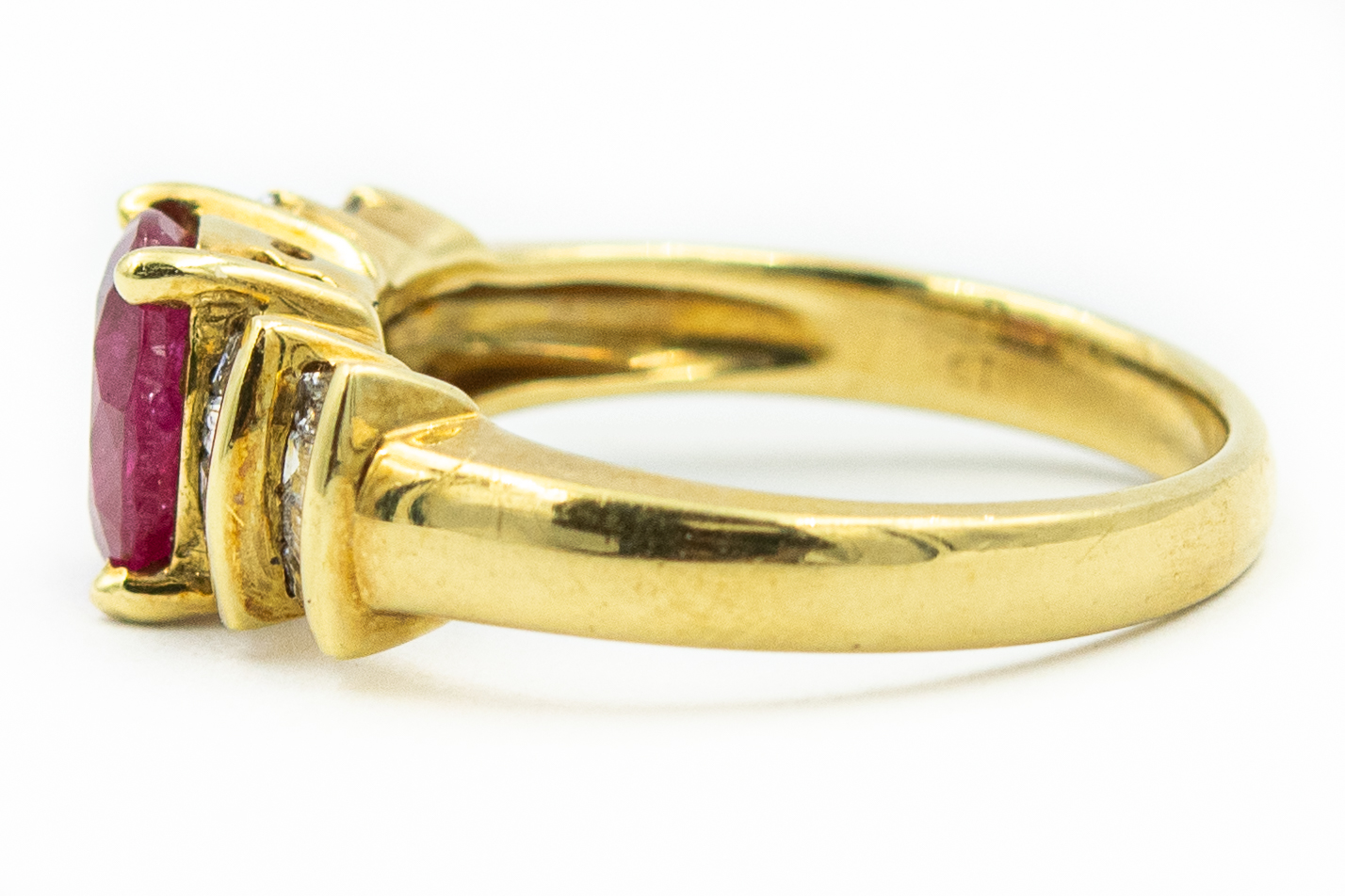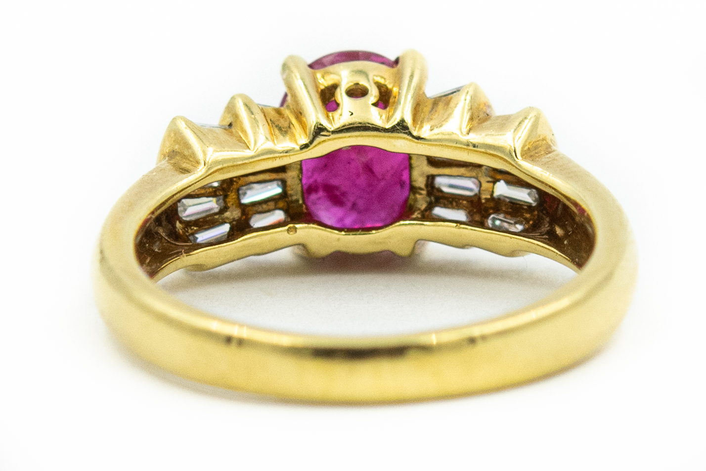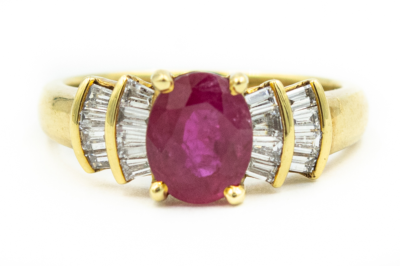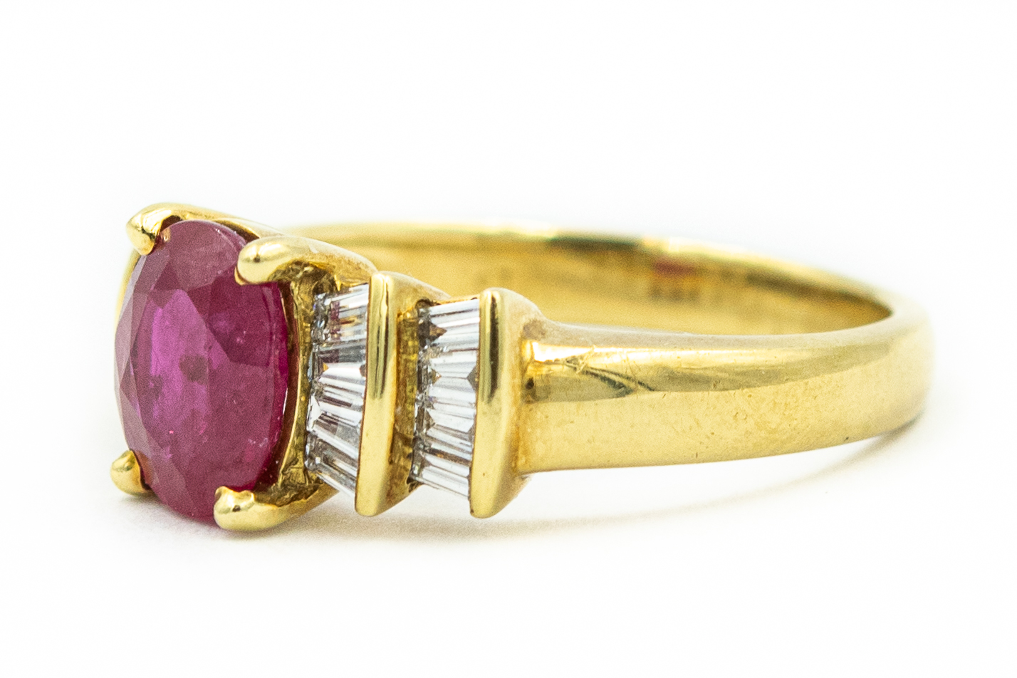 Estate Diamond and Ruby Ring with AGL Report. The ring is centrally set with an oval ruby that weighs 1.72cts. The ruby is accompanied with AGL Report No. 1133441 stating that stone is natural corundum ruby weighing 1.72cts, original listed as Burma with heat and clarity listed as a enhancements. The ruby is flanked with 8 baguette cut diamonds that weigh approximately 0.45cts. The 18k gold mounting weighs 3.50dwt/5.40g and is a size 6 3/4.