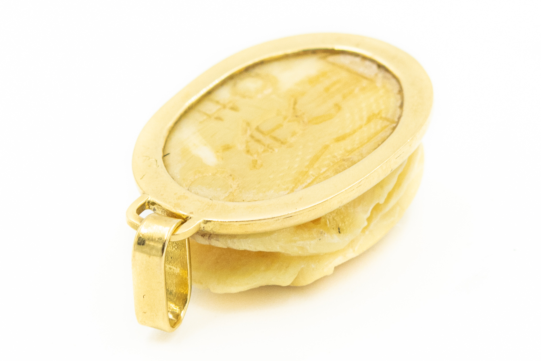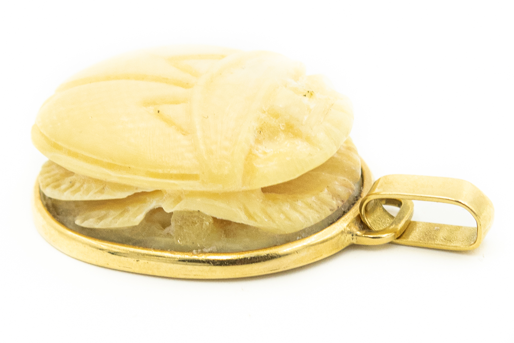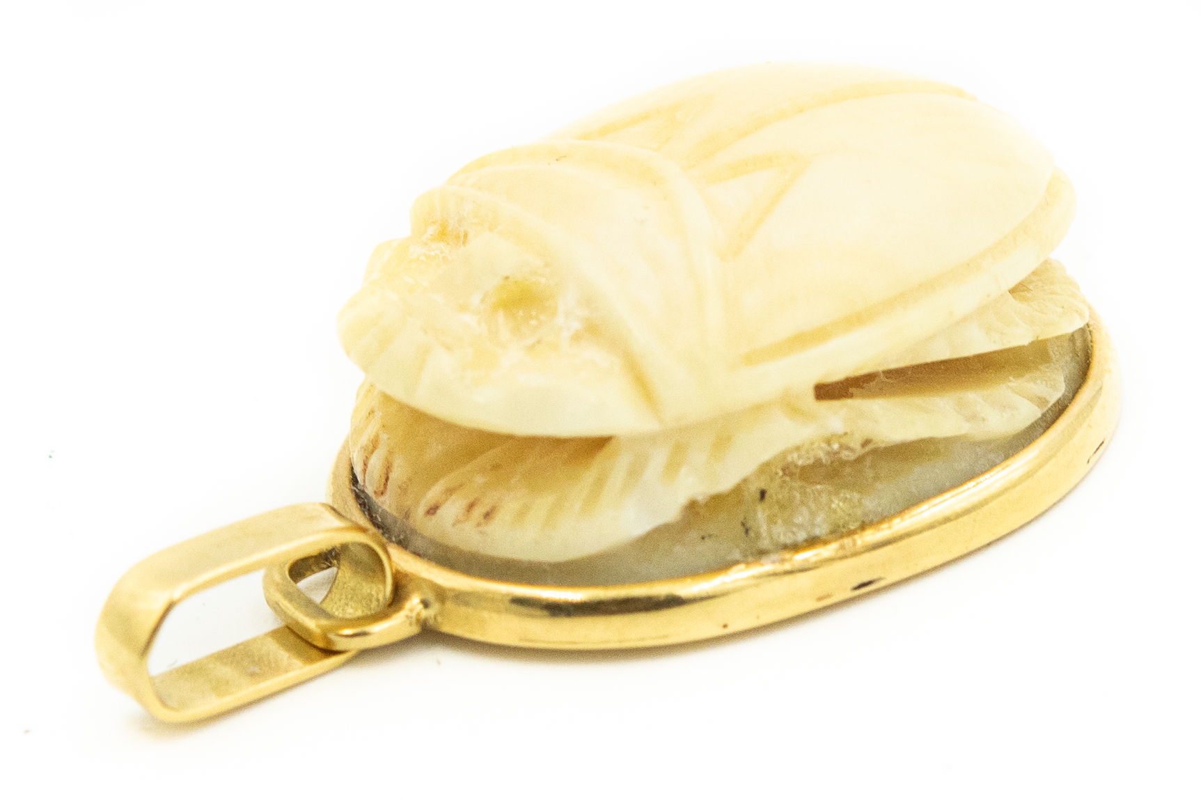 Estate Egyptian Revival Carved Ivory Scarab Pendant; 18k gold; 6.80dwt/10.60g; 1 1/2" .