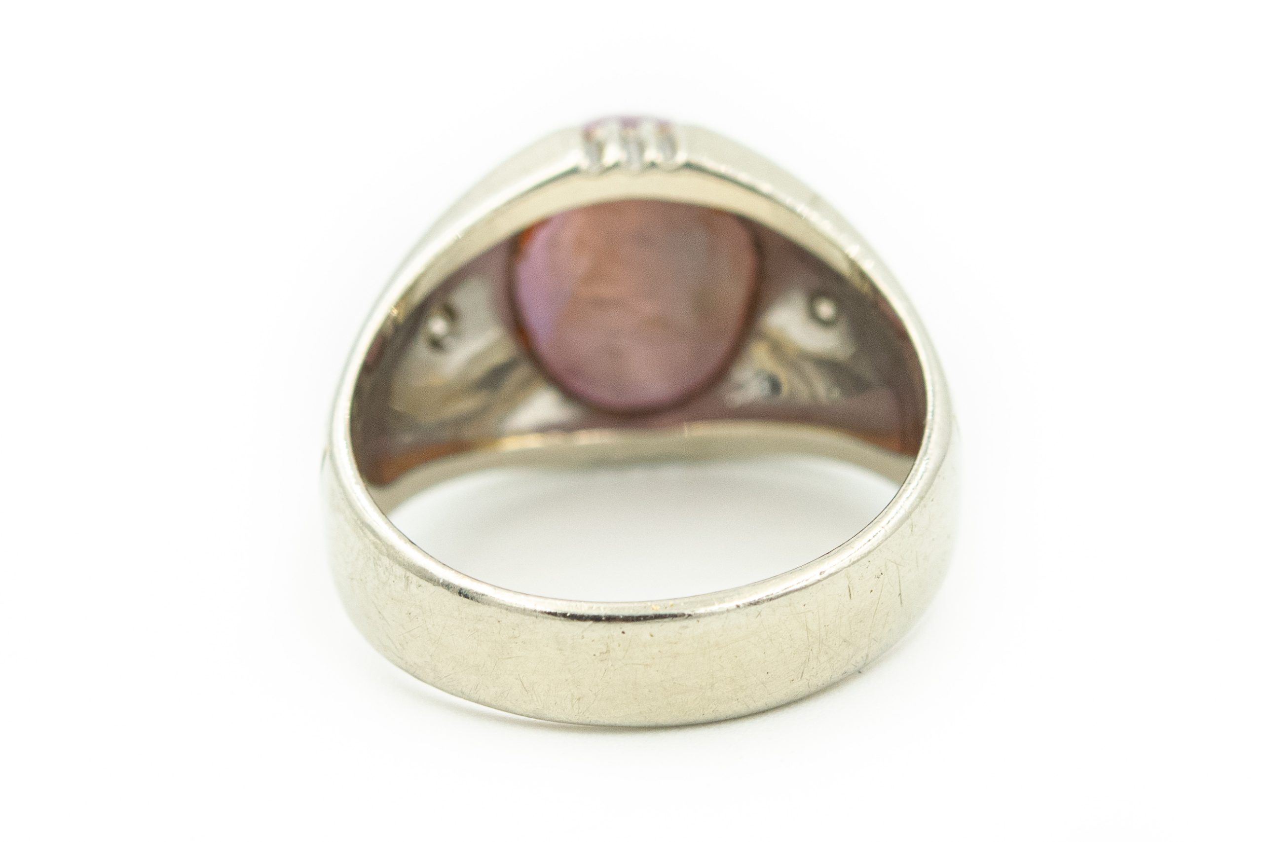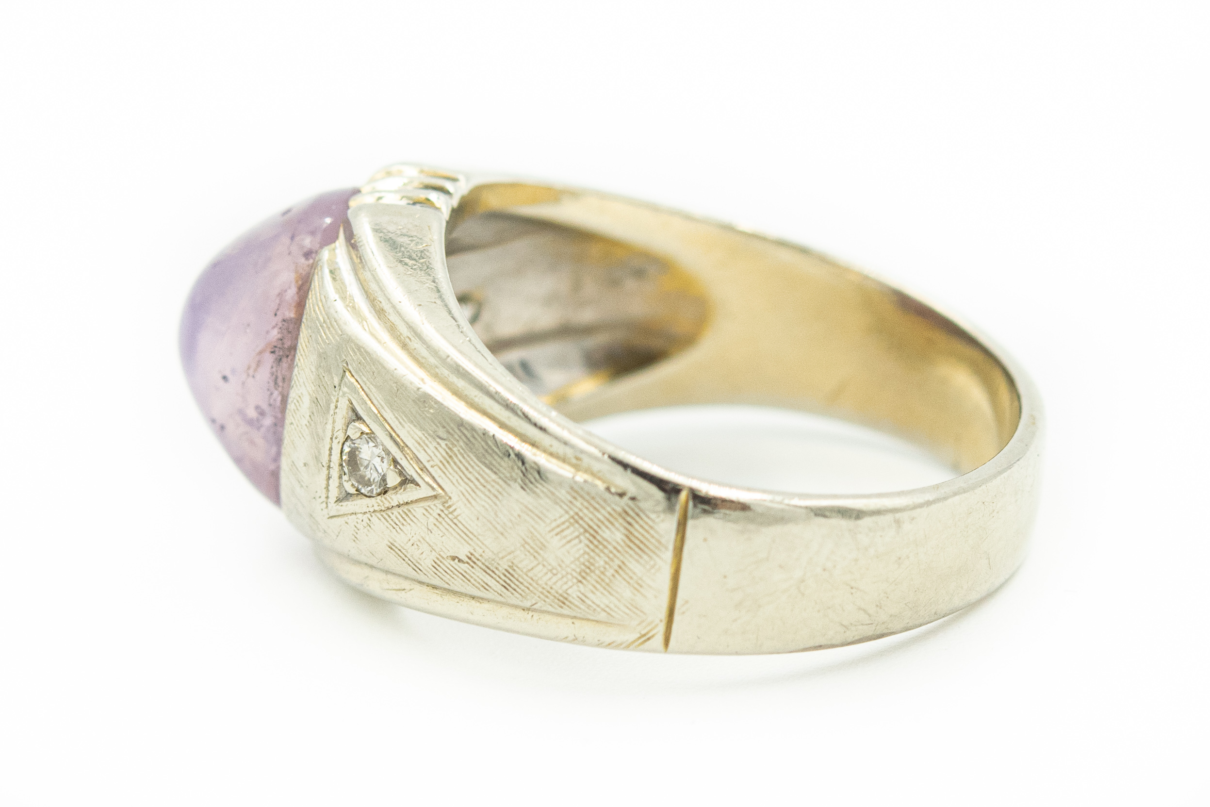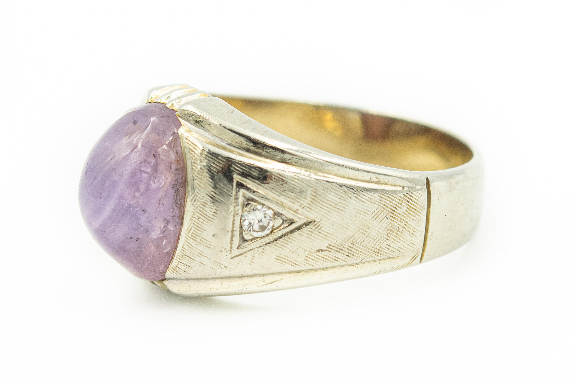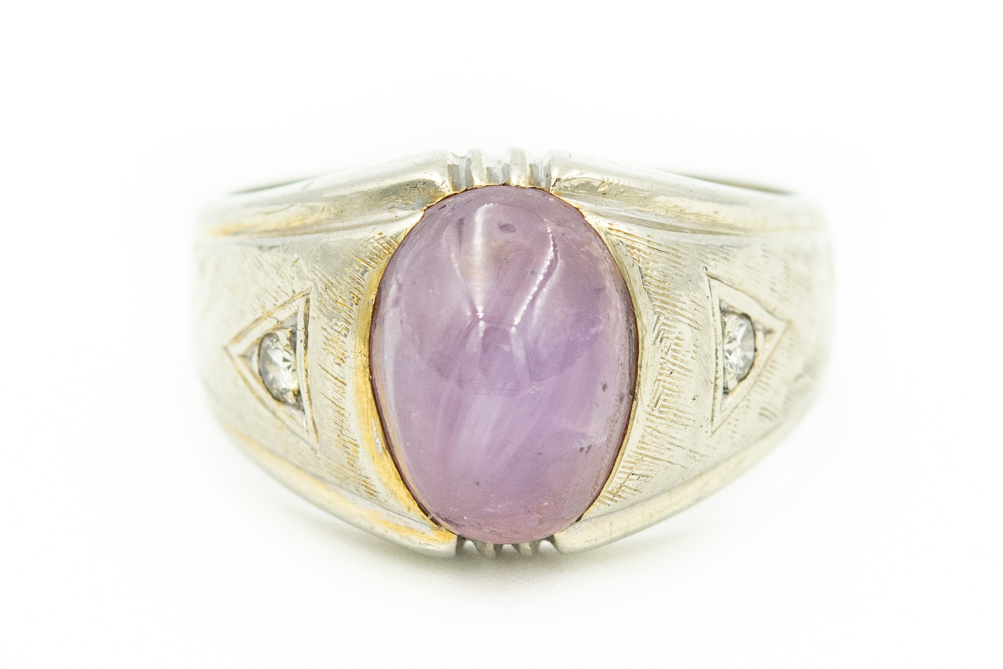 Estate Fancy Color Pink Star Sapphire Pinky Ring. The ring is centrally set with an oval cabochon cut natural pink star sapphire weighing approx. 3.50cts. It is flanked with round cut diamonds weighing approx. .10cts in a handmade 14K white gold mounting weighing 6.30dwt. Ring Size 10.