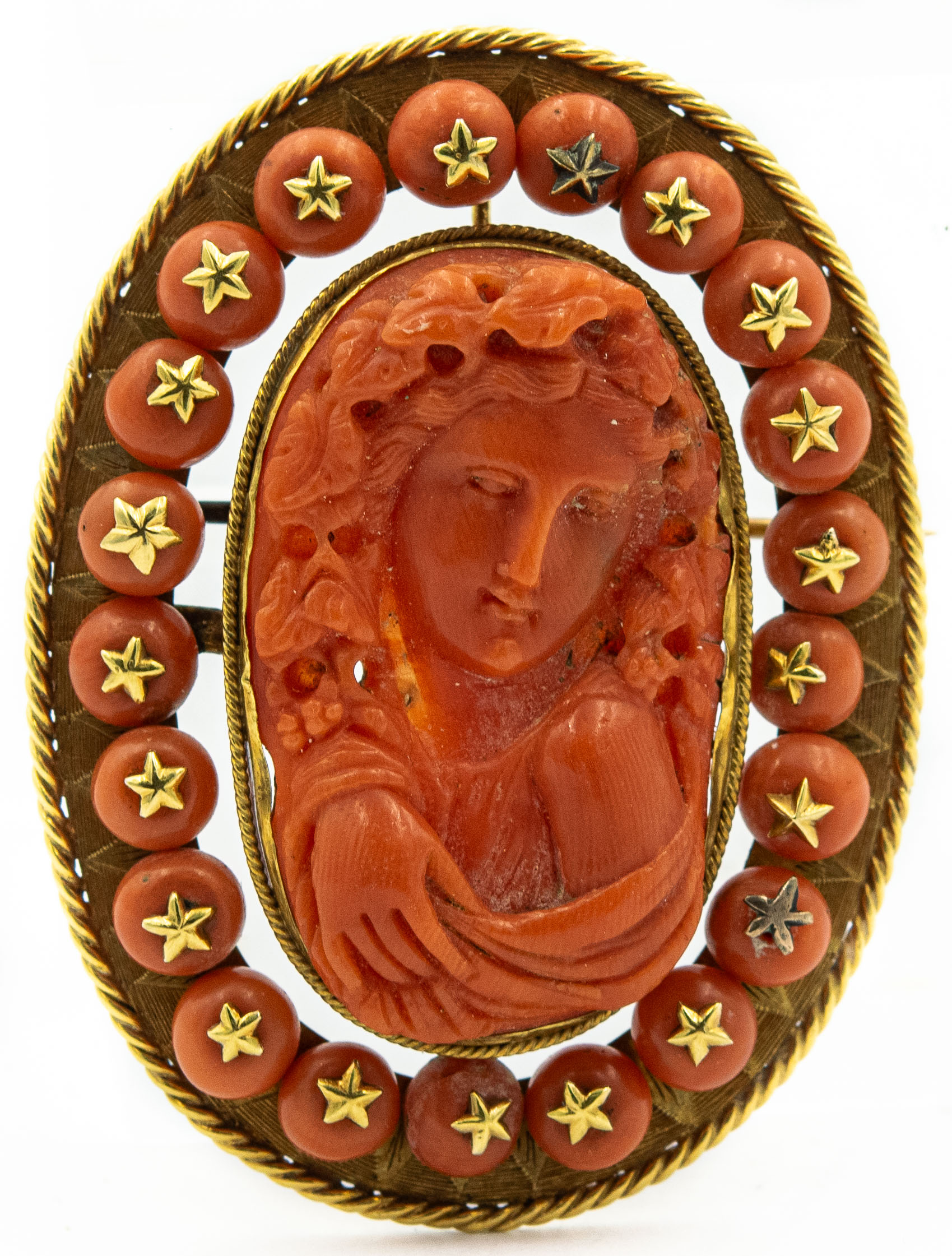 Estate Georgian Yellow Gold and Coral Cameo Brooch Invt #49/572; 18k yellow gold; 13.90dwt/21.50g; 2 1/2" x 2". The brooch is centrally set with a large oval hand carved oxblood coral cameo of a young maiden that measures 37mm x 25mm. It is framed with a beaded coral border and studded with star inlays.