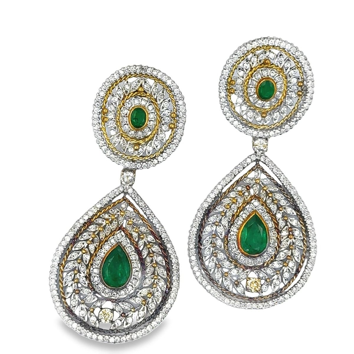 Estate Gold Diamond and Emerald Large Day/Night Ear Pendants; 18k gold; 28.20dwt/43.80g; pear shaped emeralds 8.00cts; 396 round brilliant cut diamonds 10.40cts; 3 1/4"