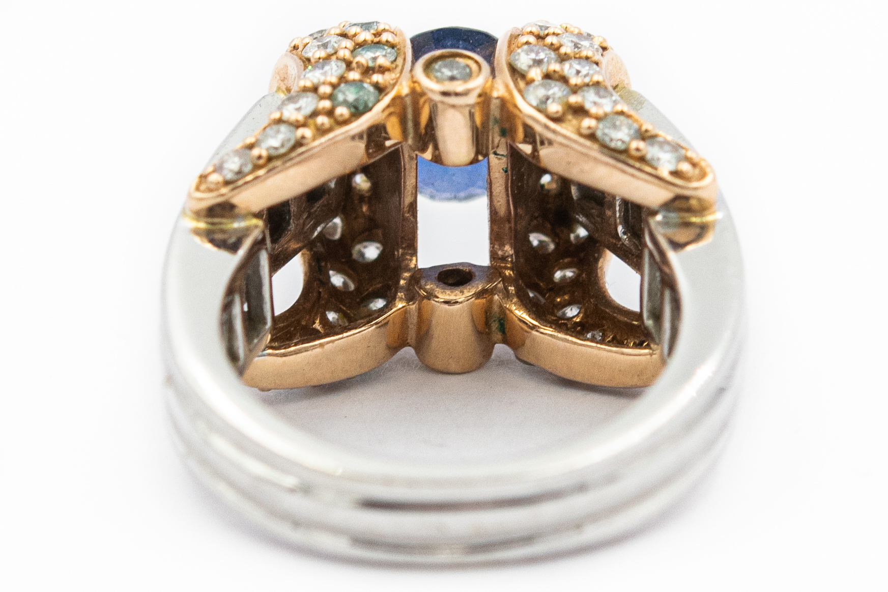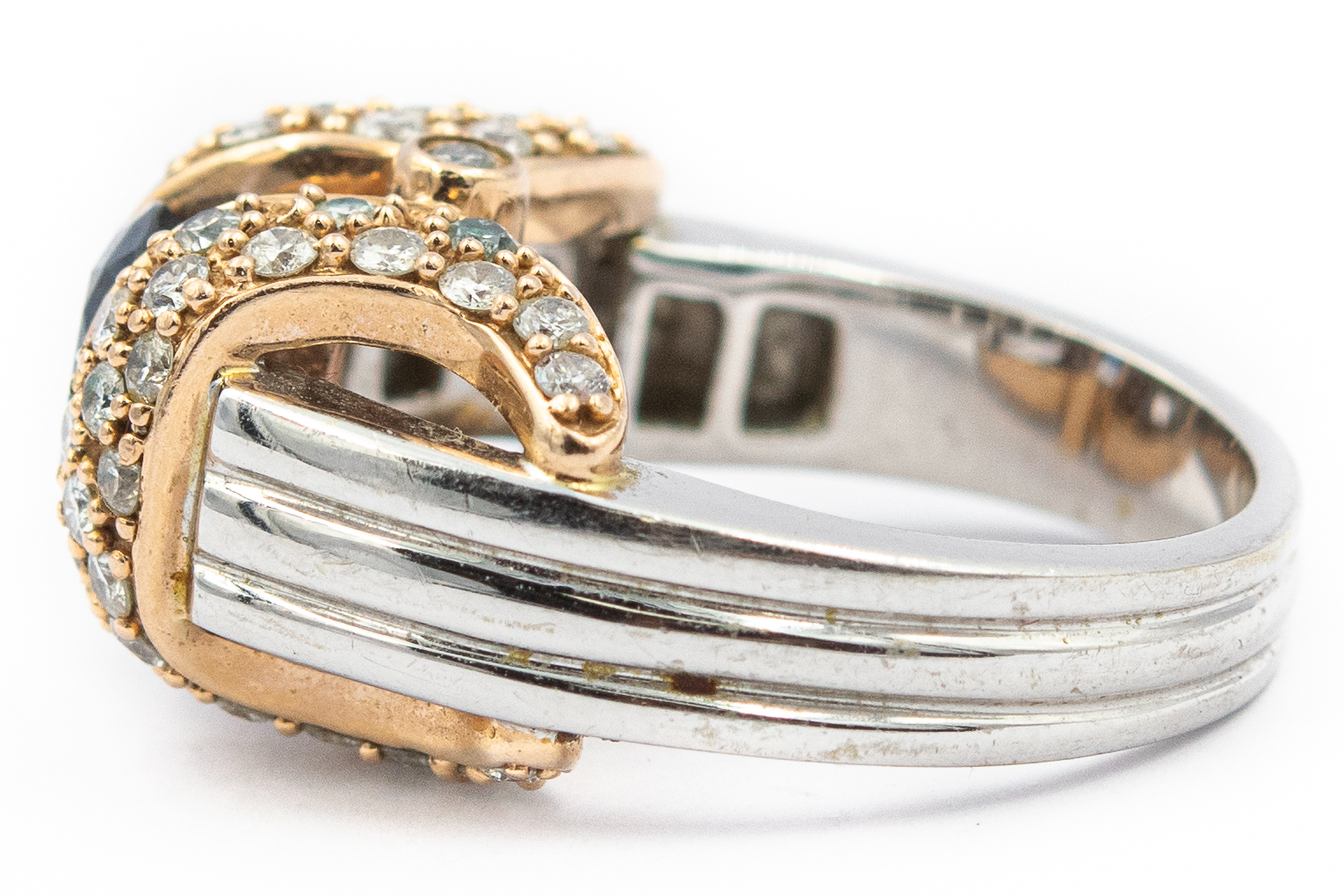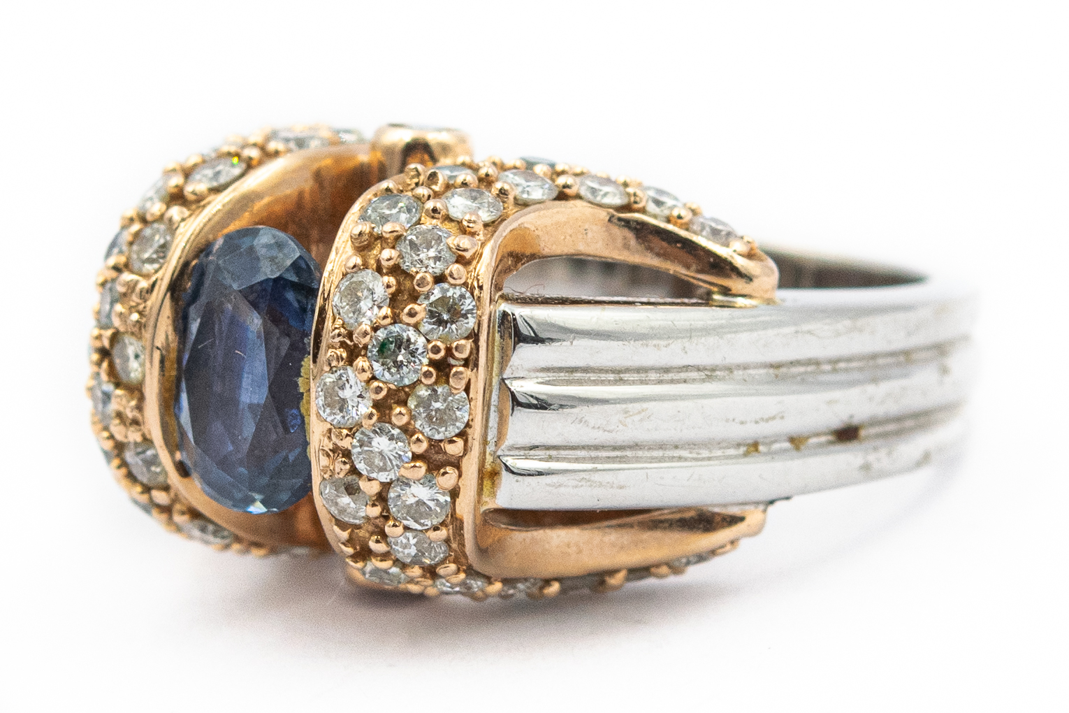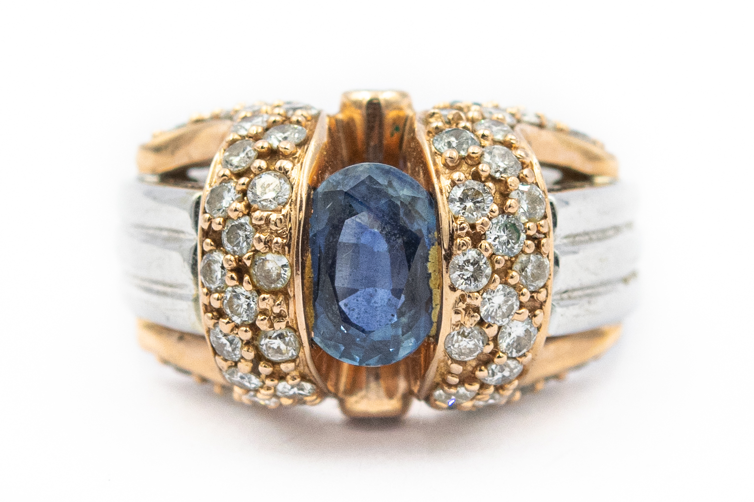 Estate Gold Diamond and Sapphire Ring; 14k gold; 6.50dwt/10.0g; 52 round brilliant cut diamonds 1.05cts; Ring Size 5 1/4