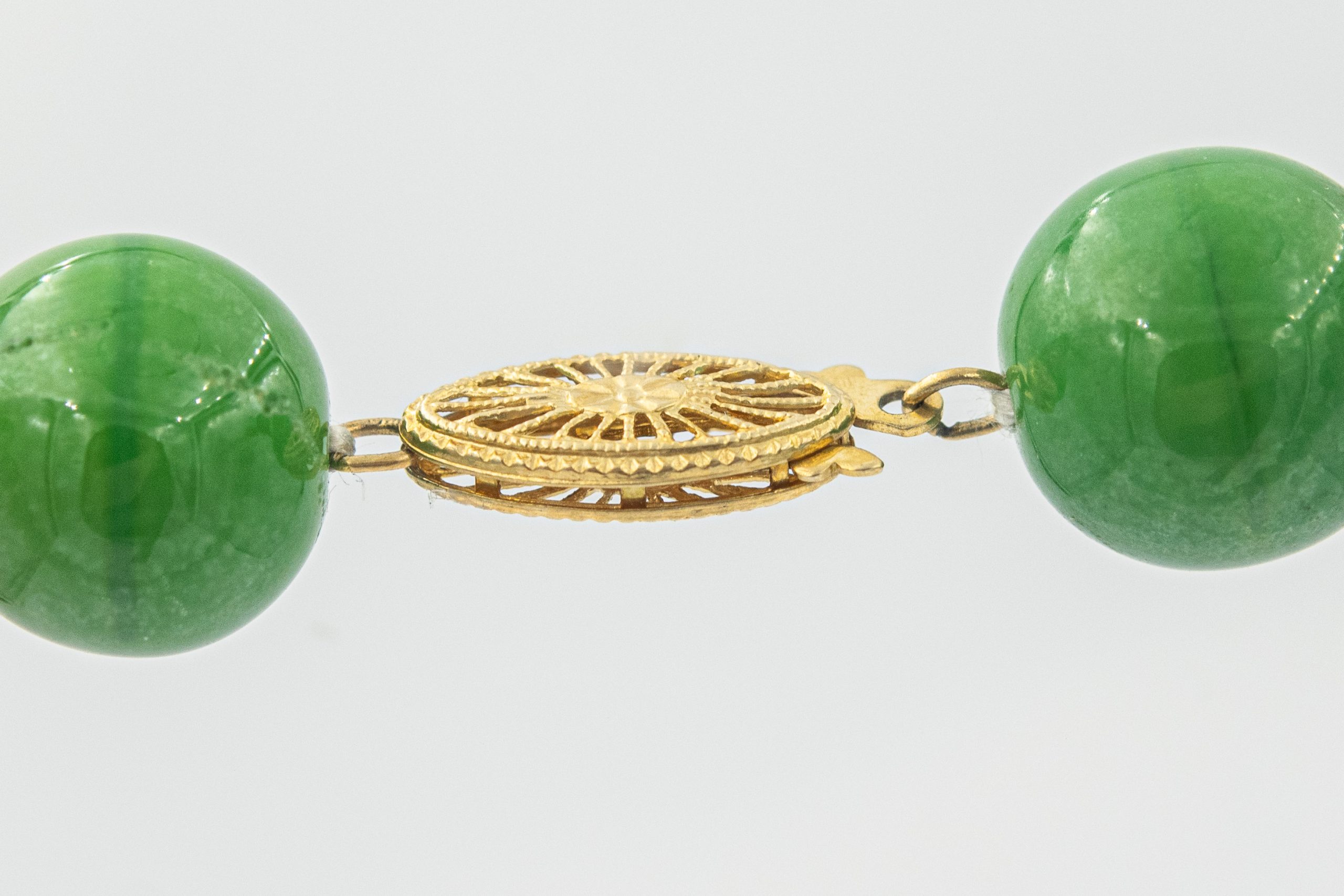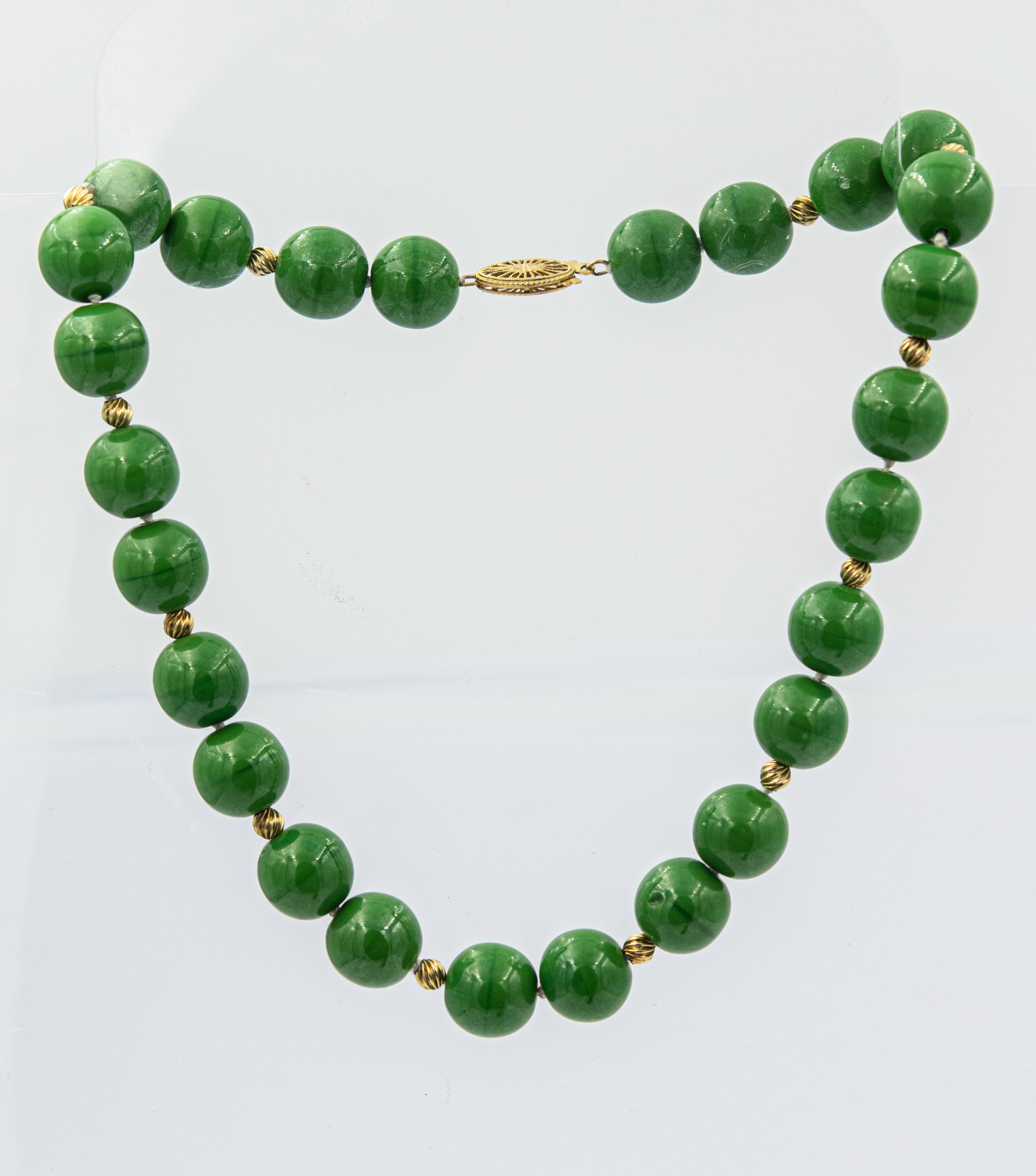 Estate Green Bead Necklace with Yellow Gold Clasp and Bead Spacers; 14k yellow gold clasp and bead spacers; 38.6dwt/60.0g; 26 round green beads 12.0mm; 12 gold bead beads 3.85mm; 15"