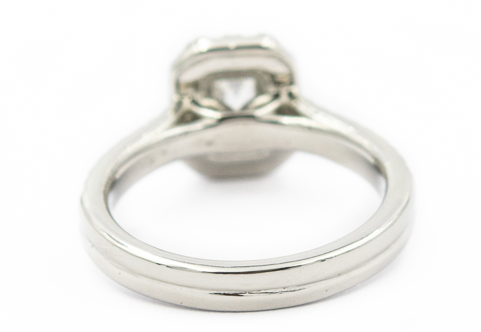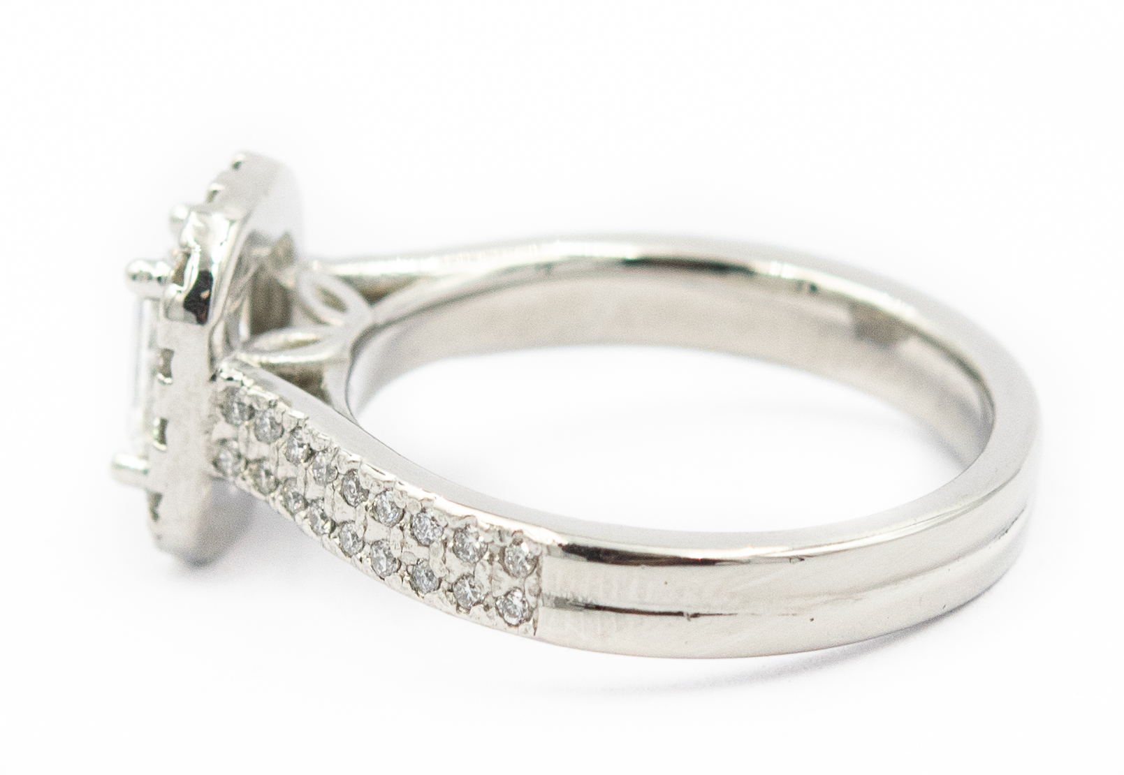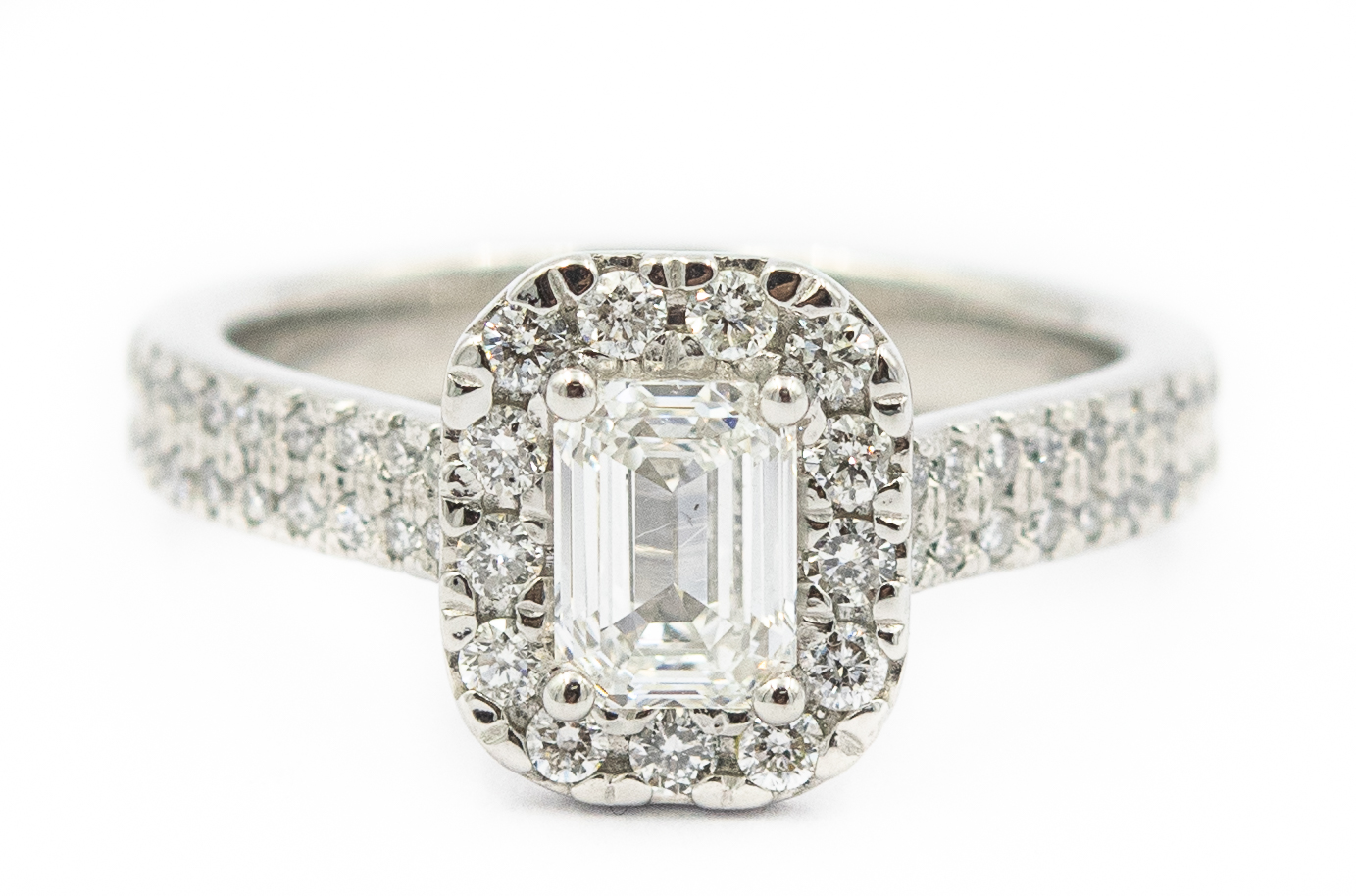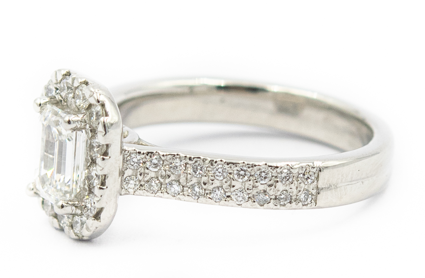 Estate Platinum and Diamond Engagement Ring, platinum; 1 emerald cut diamond weighing 0.90cts; F color and VS2 clarity; GIA Report #2376482265, 48 diamonds 0.75cts; Total Diamond Weight 1.65cts