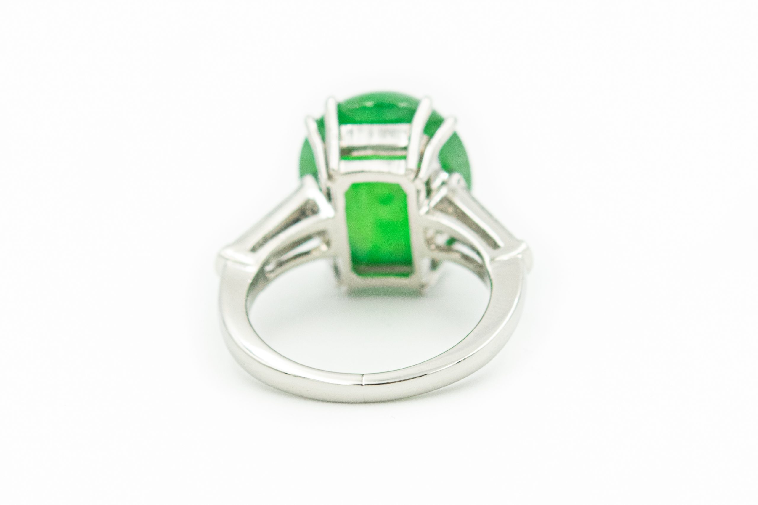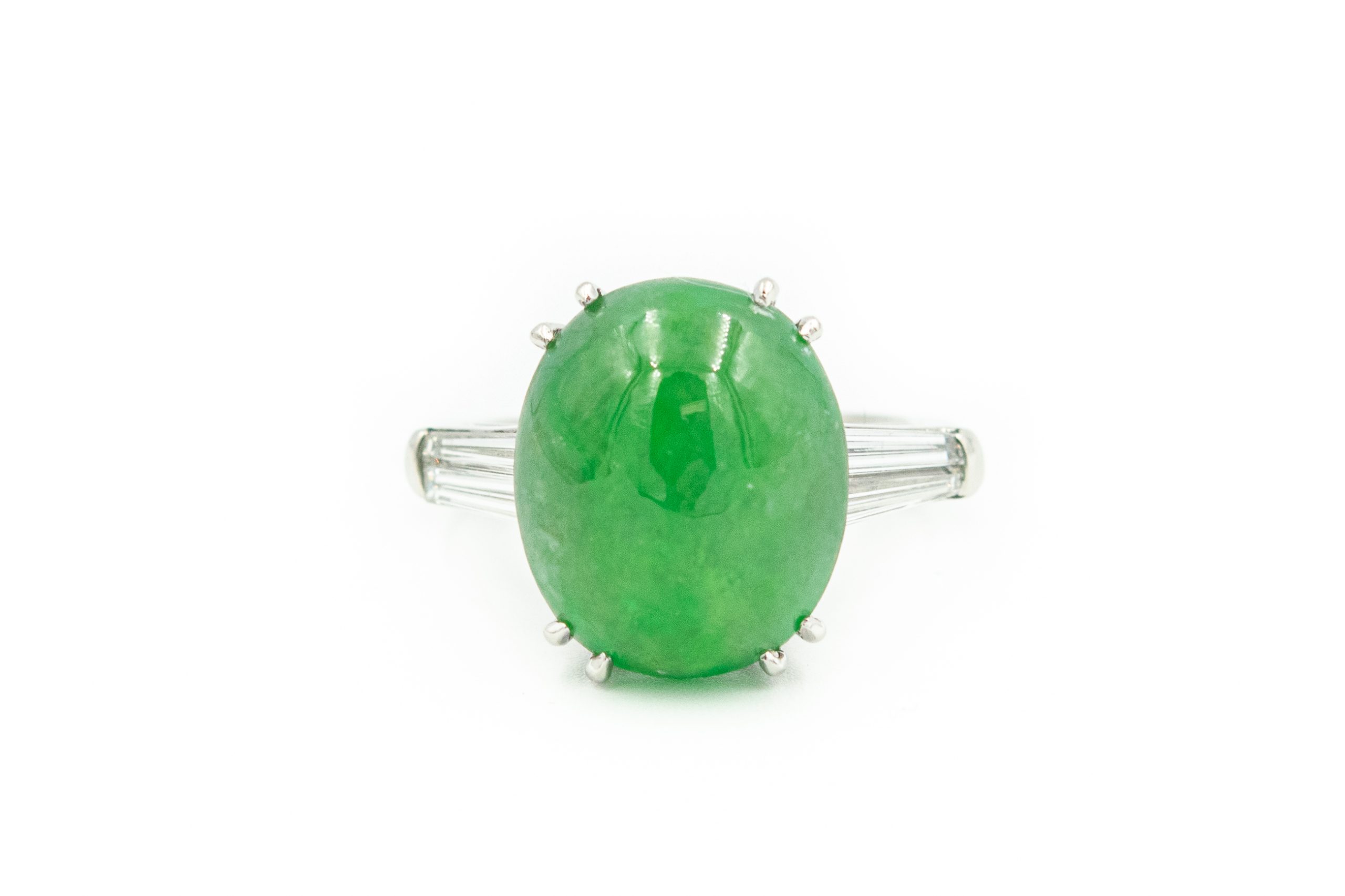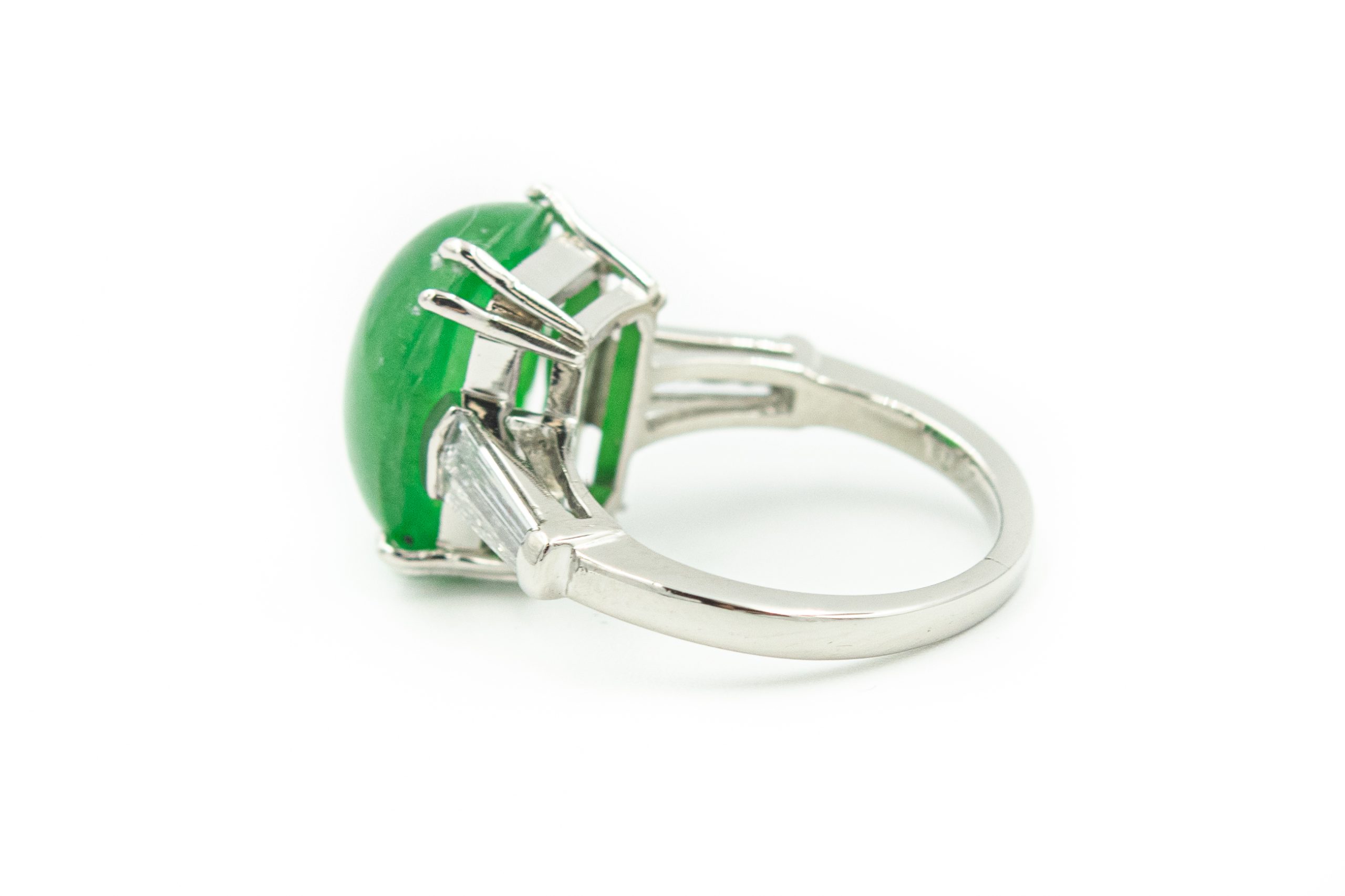 Estate Platinum Jade and Diamond Ring Mason Kay Report 211105-1039; platinum; 6.1dwt/9.4g; 4 baguette diamonds 0.80cts; 1 center green jade oval cabochon 10.39cts; Ring Size 6 1/2