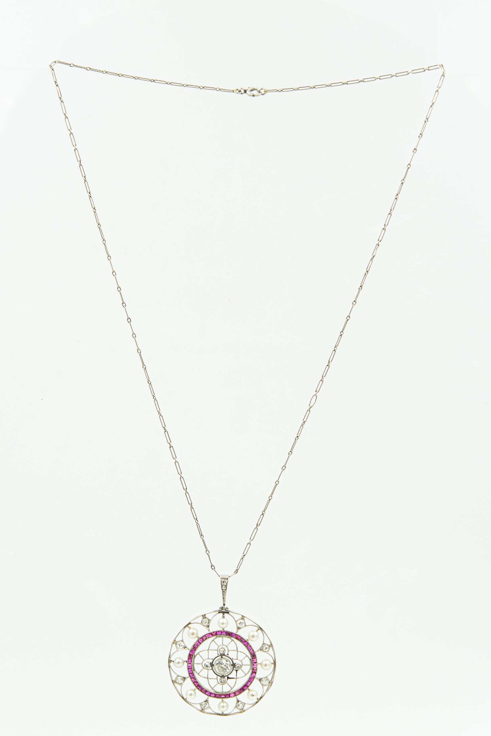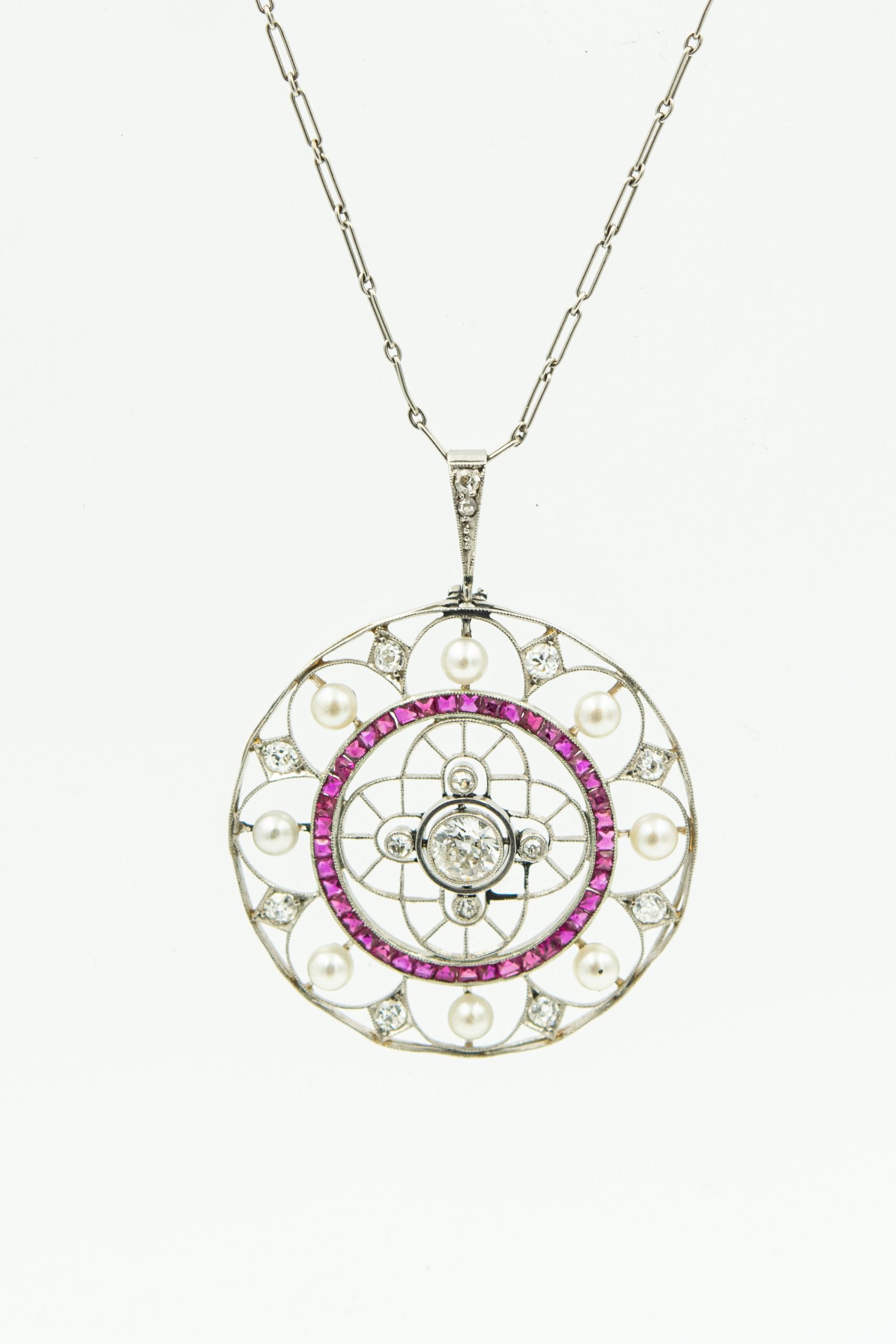 Estate Pretty Diamond Ruby and Natural Pearl Pendant By George Fouquet. The pendant features an open frame circular design that measures 30mm in width. It is centrally set with European cut diamonds and framed with channel set rubies accented with natural fresh water pearls. It is signed on the back "G&F" and it is suspended from a chain necklace that measures 16" long.