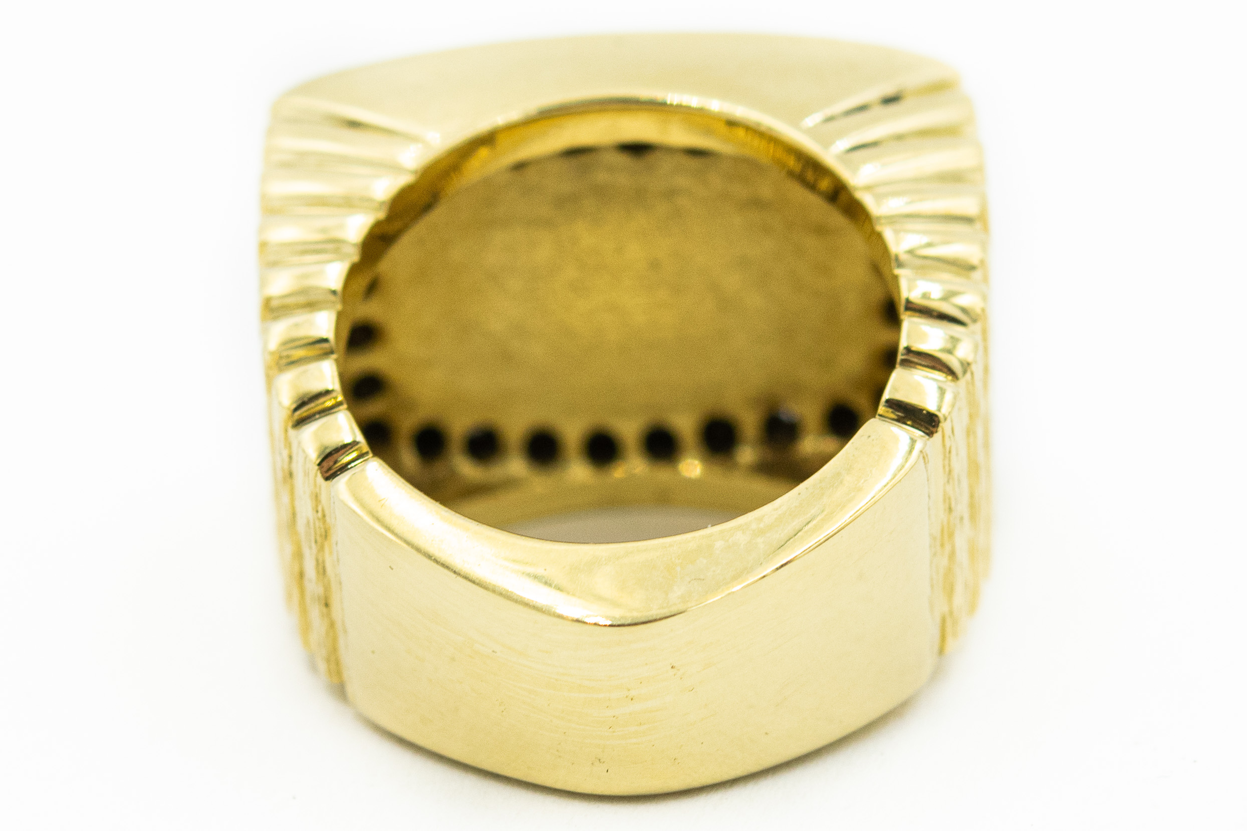 Estate Rare Australian Opal and Diamond Ring. The ring is centrally set with a tonneau shaped opal measuring 17.50mm x 11.50mm and it exhibits a fine crystal bodycolor with an excellent harlequin play-of-color. It is framed with 28 round brilliant cut diamonds weighing 1.00cts. The 18k yellow gold mounting weighs 22.0dwt/34.3g. The ring is a size 7 1/2.