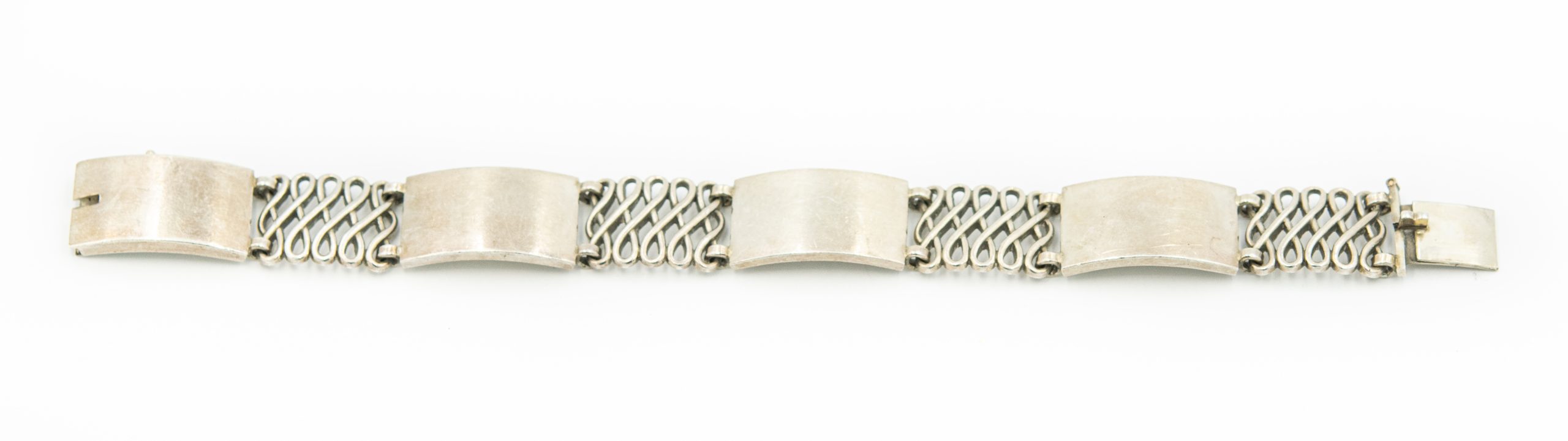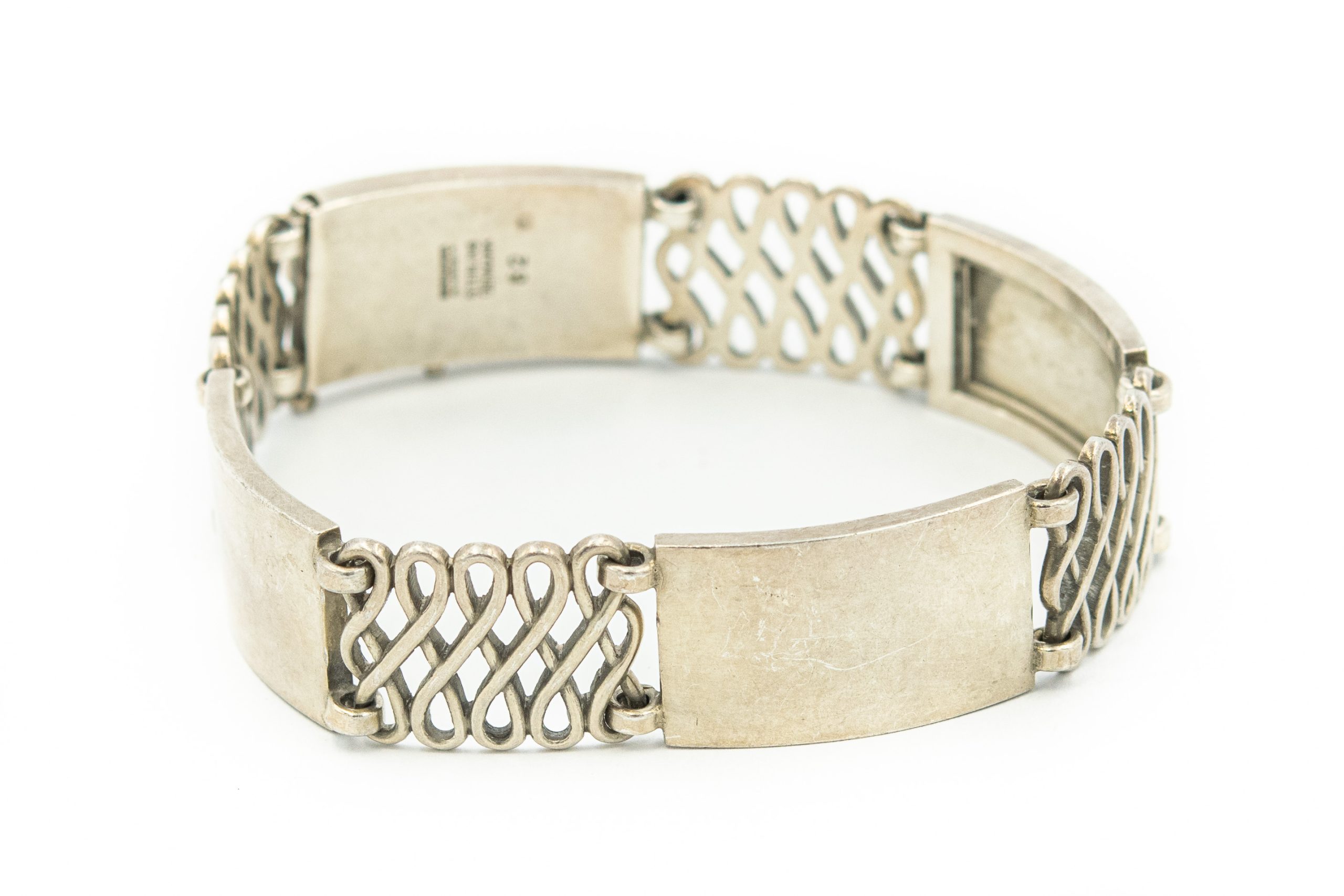 Estate Rare Sterling Silver Bracelet by Georg Jensen and Wendel Model 62. The bracelet features a sectional solid curved link alternating with open frame lattice work design. It is signed on the claps and it measures 7 1/2".