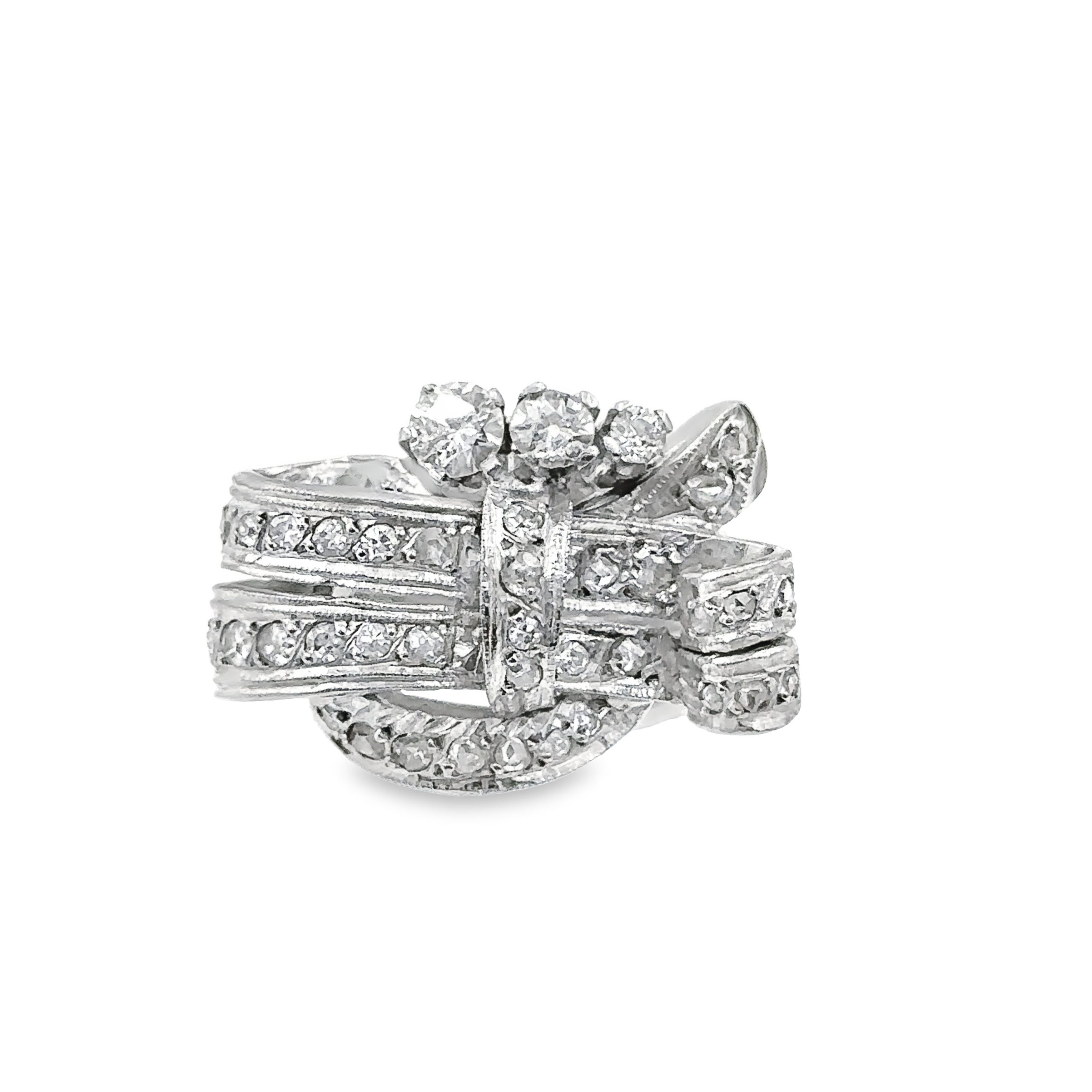 Estate Retro White Gold and Diamond Stylized Buckle Ring