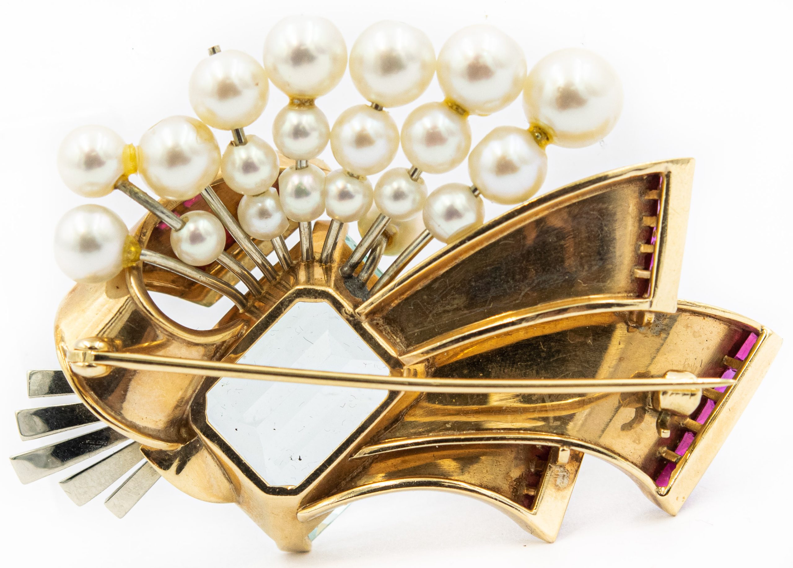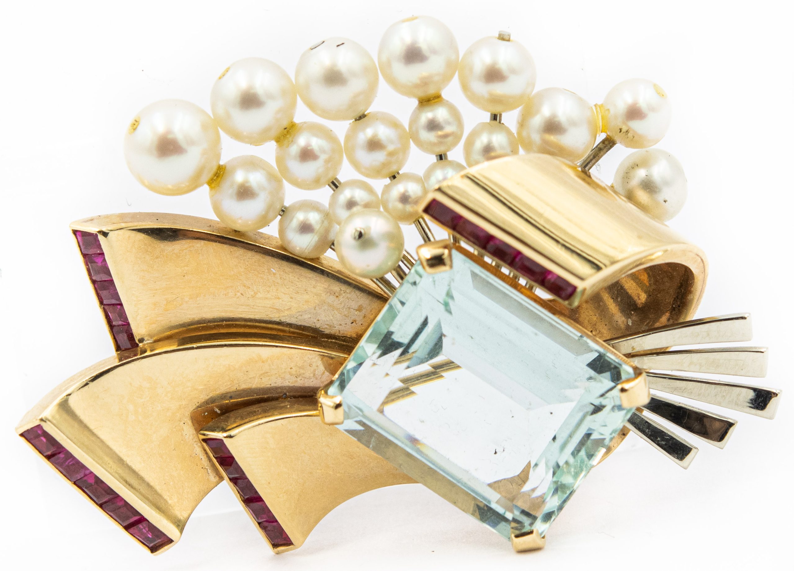 Estate Retro Yellow Gold Aquamarine Ruby and Pearl Brooch