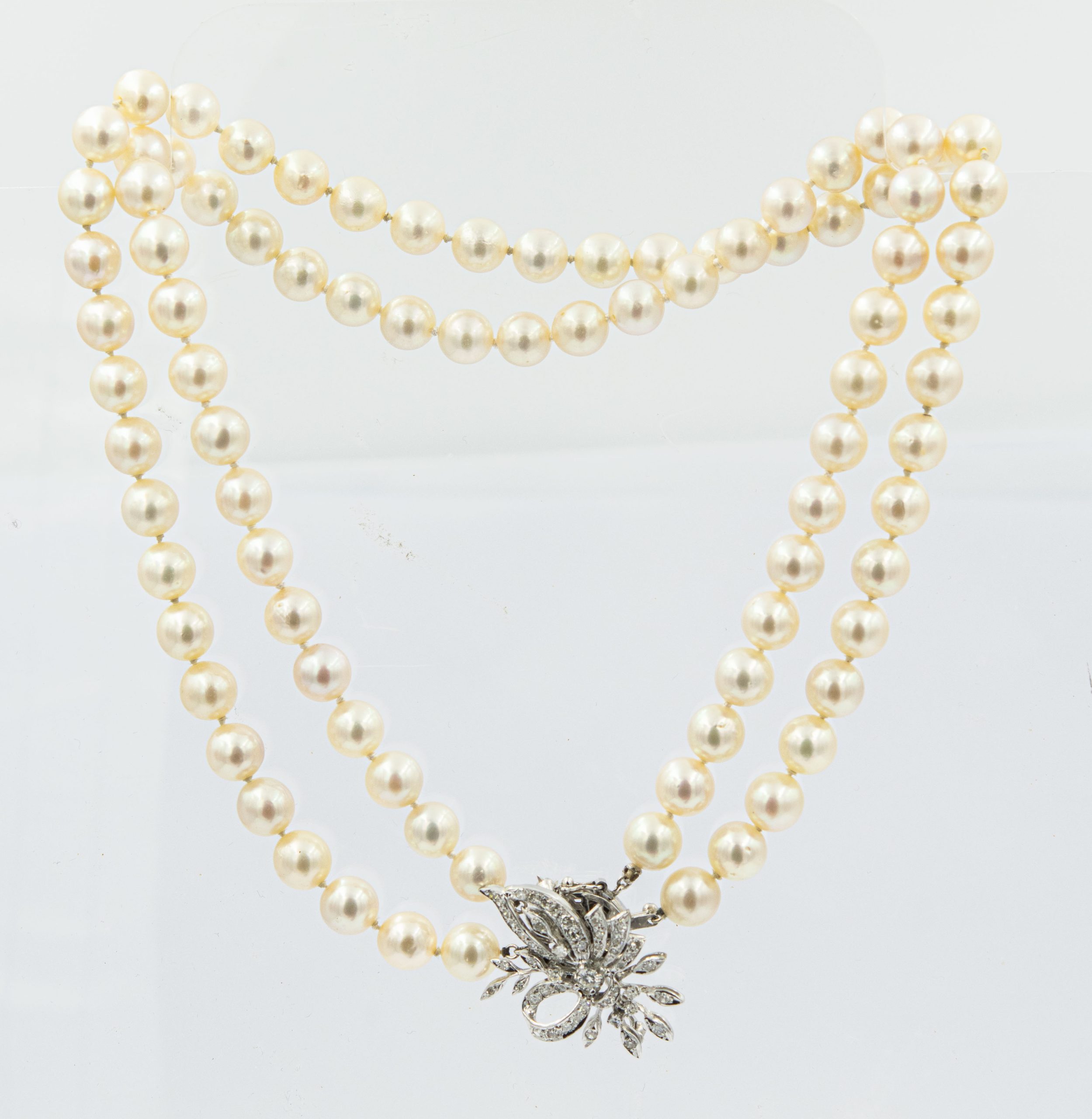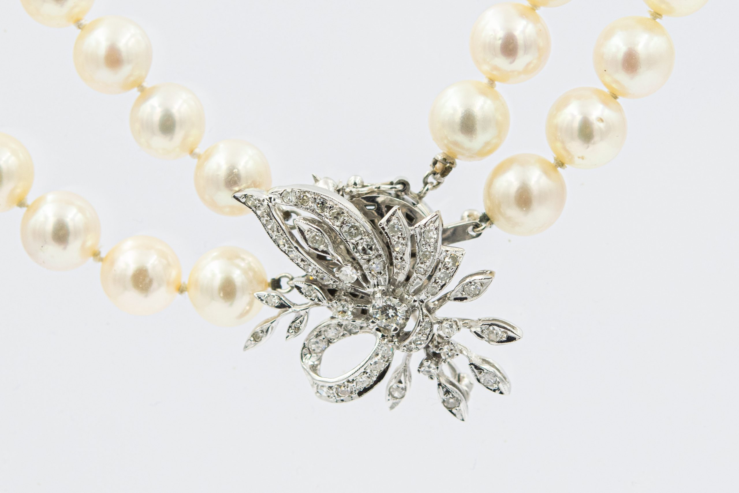 Estate Single Strand Pearl Necklace and White Gold and Diamond Floral Clasp