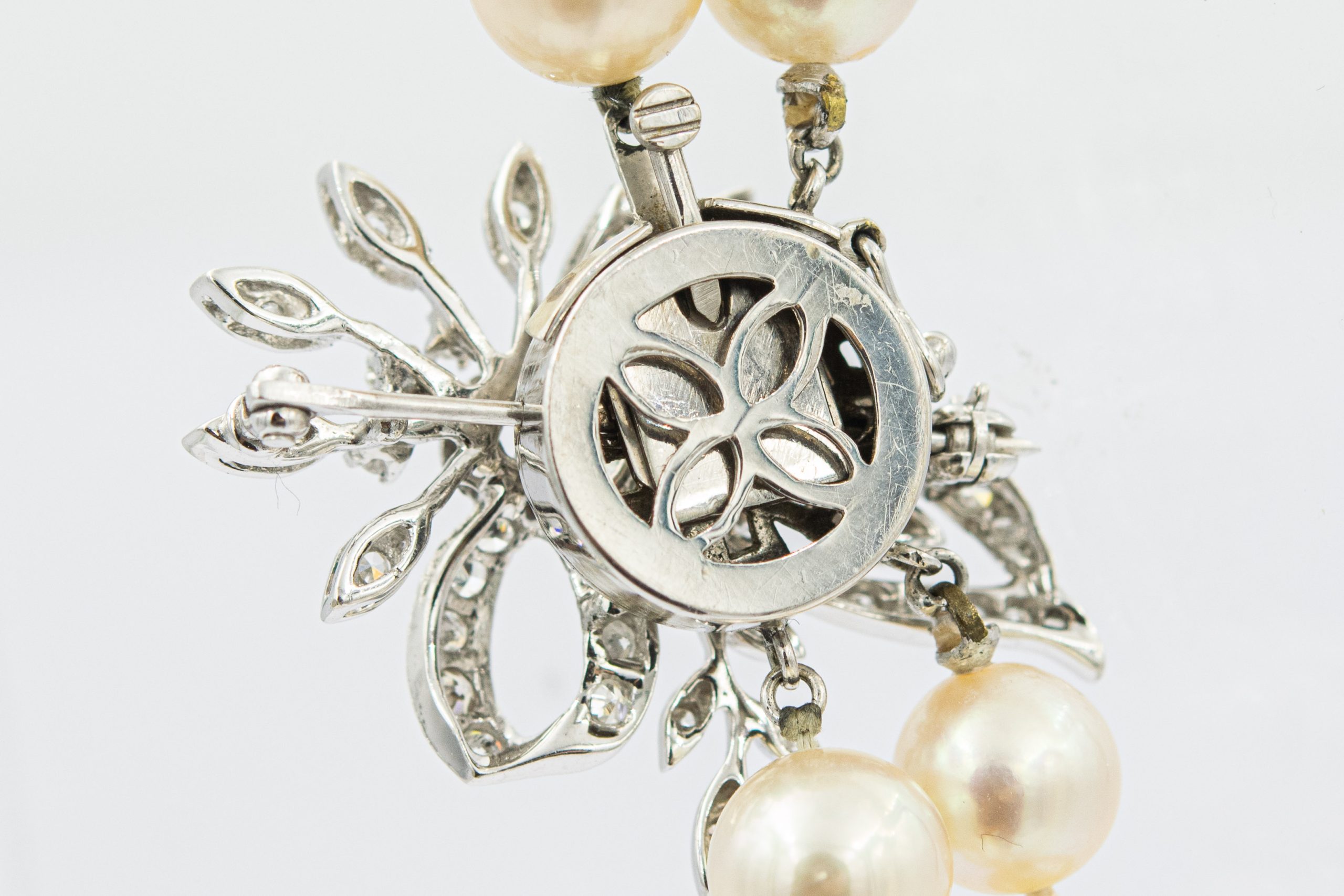 Estate Single Strand Pearl Necklace and White Gold and Diamond Floral Clasp; 14k white gold; 49.4dwt/76.9g; 51 round diamonds 1.15cts; 32"